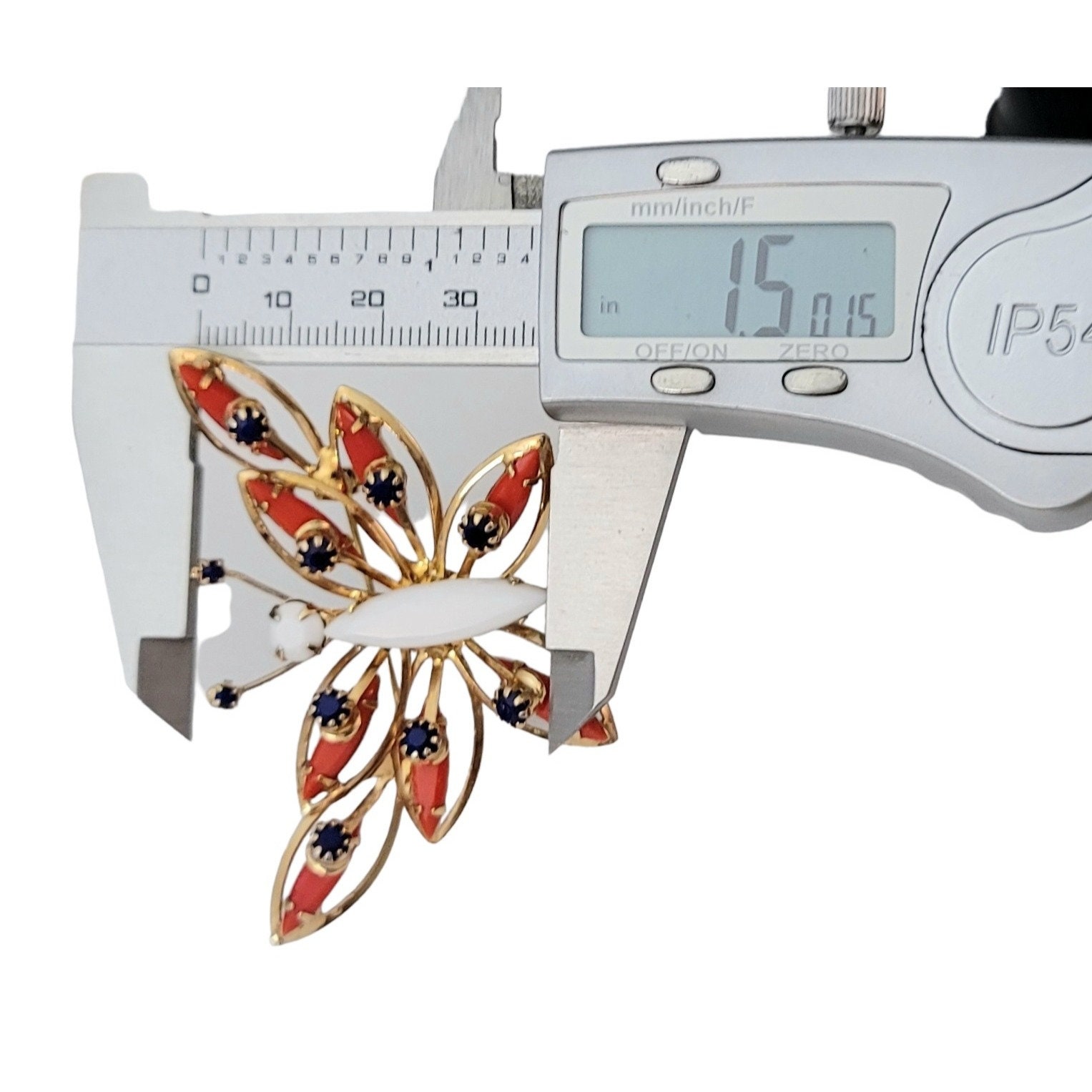 A beautiful butterfly brooch embellished with rhinestones. It is designed with the color White on top with red and blue rhinestones. A raised design adds extra interest with intricate embellishments on the wings of the butterfly. Measures 1.5 inches in length. Marked Alice Caviness on an oval cartouche on the reverse. The locking pin at the back fastens securely and functions properly. This piece is perfect for a birthday, a graduation gift or just to celebrate your love of Red, White, and Blue!
