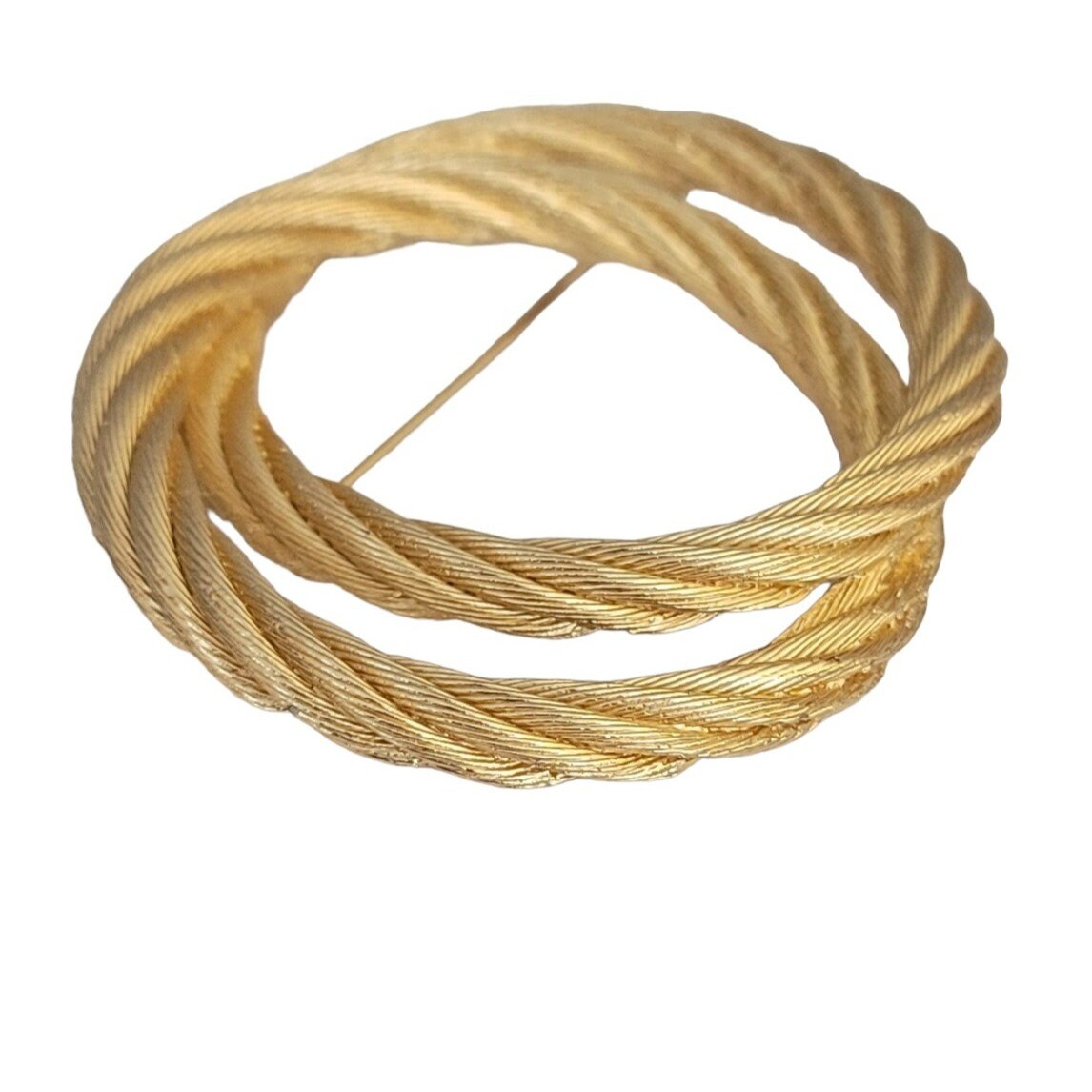 An intricate twisted rope design is the focal point of this beautiful gold-tone brooch pin. Crafted from high-quality materials, this designer vintage pin measures 1.9 inches in length and 2.4 inches in width. Marked Chr Dior© on a cartouche at the back of one of the circles. It has a secure locking pin that functions properly. This brooch would make a great Valentine's Day gift. It will make an excellent addition to your vintage Christian Dior collection.
