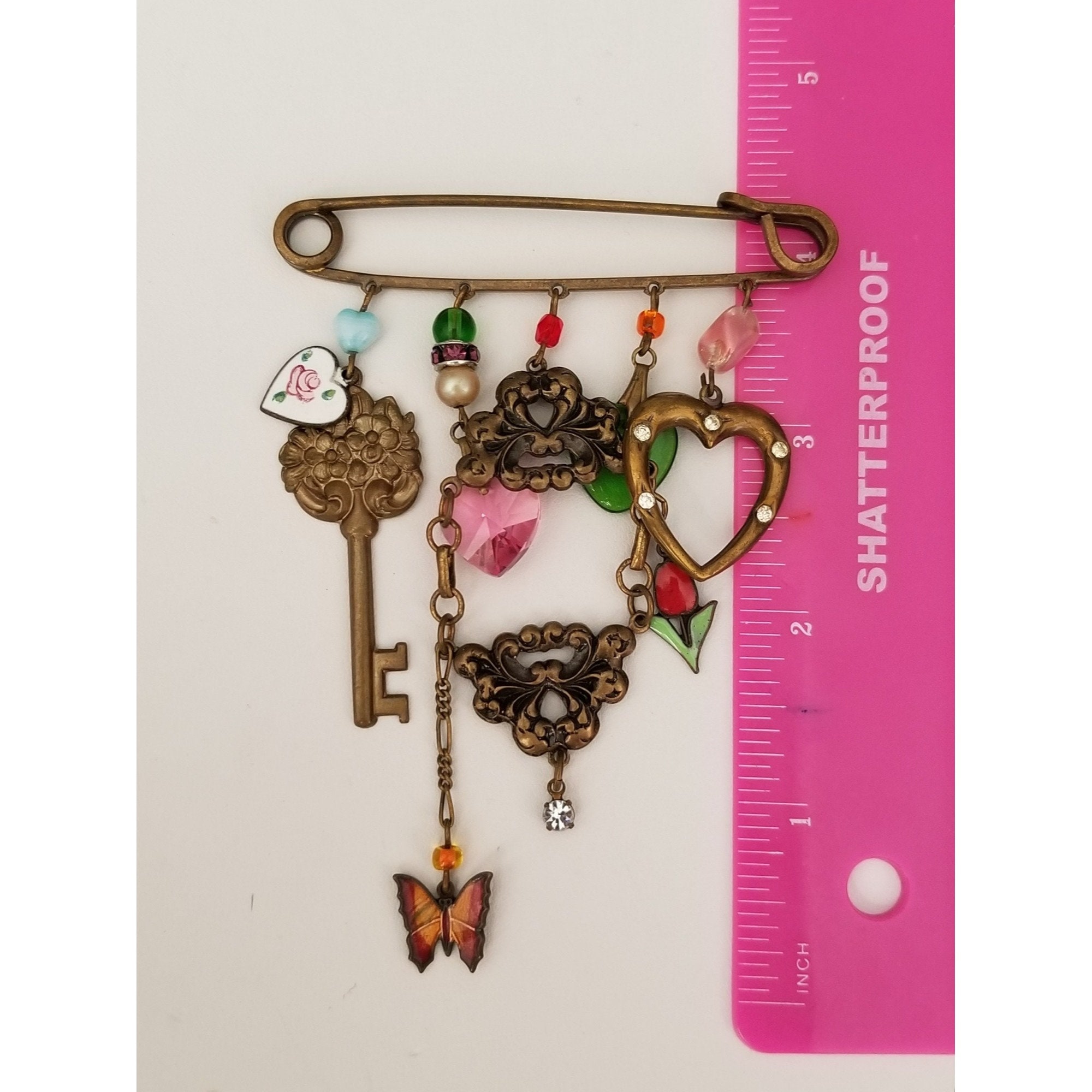 This charming pin showcases the chatelaine-style pieces that were popular during the Victorian era and is made of gold-tone metal. It measures approximately 4 inches in length and 3 inches wide. The simple design of this pin, yet obviously considered a utility, makes them a fun and attractive element to base jewelry lines around like this one.