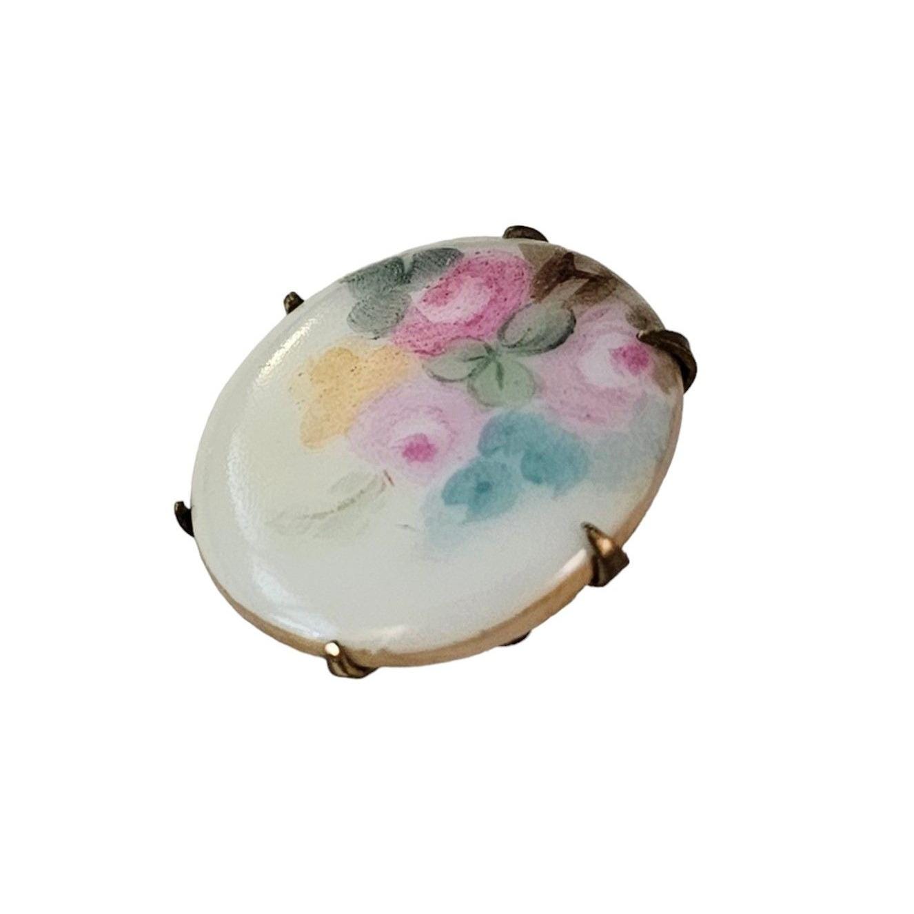 Victorian Porcelain Flower Painted Round C-Clasp Pin L194