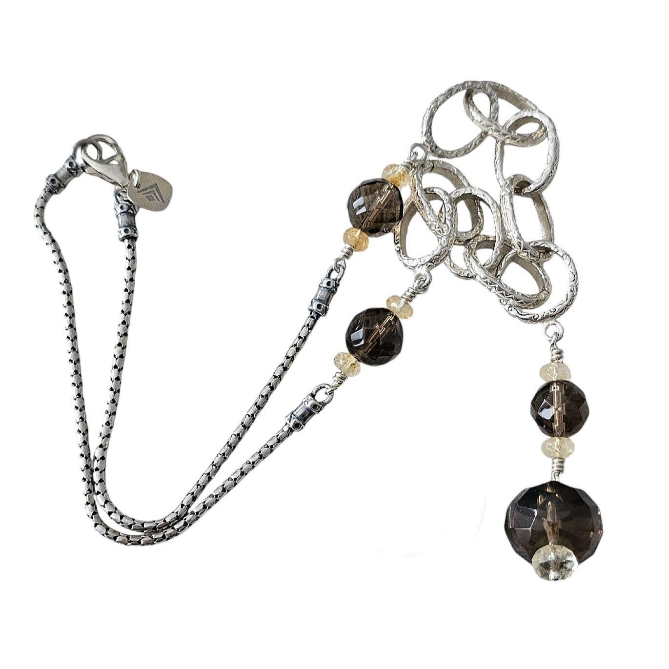 Silpada's costume jewelry is known for focusing its design on stylish sterling silver jewelry. This charming necklace showcases a noticeable aspect of attention to detail and great craftsmanship. This stunning piece contours in textured hammered chunky silver links with a Y-shaped drop at the center, comprised of smoky quartz and citrine accent beads. It measures 18 inches long and is secured with a lobster claw clasp closure, offering considerable security. The clasp is stamped 925, with a sterling silver quality stamp as a symbol of guaranteed quality, and it comes with a metal tag marked with Silpada's arrow logo. The combination of colors embodies the essence of nature's beauty and contemporary style. This is a lovely necklace you will always circle back to.