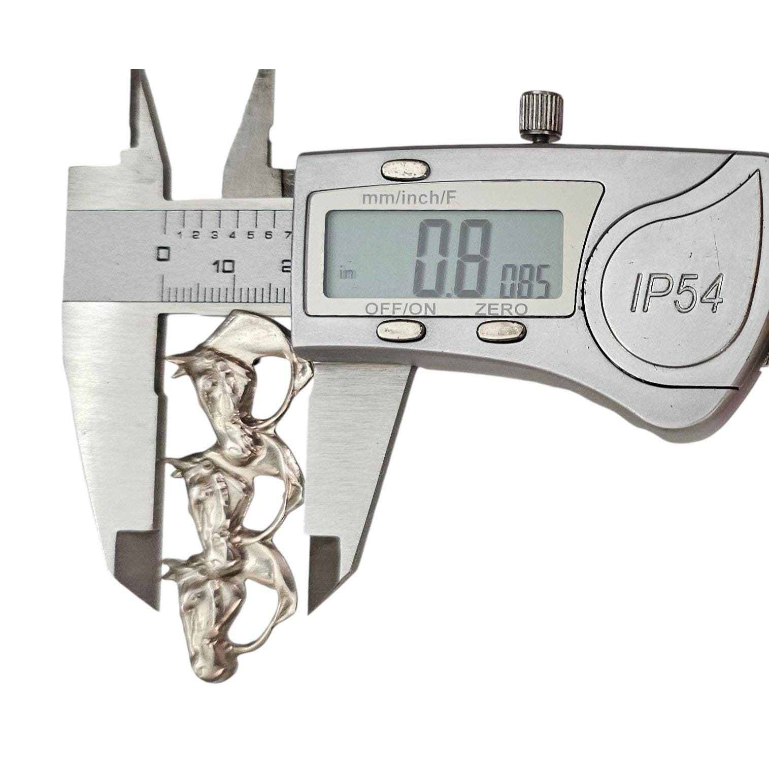 This Vintage Horse Head Trio Brooch Pin is a classically delightful addition to your equestrian event attire. The trio horse head figural pin features an intricately detailed form, genuinely crafted from sterling silver. This pin is fashioned for dressage, eventing, and hunter-riders, presenting a striking look in any setting. It measures approximately 1.9 inches in width and 0.8 inches in length. The back of this pin is marked STERLING, finished with a secure locking pin that functions properly, and is in good vintage condition. This brooch is perfect for equestrian enthusiasts or anyone who appreciates finely crafted jewelry. It adds a touch of sophistication and equine charm to any outfit.