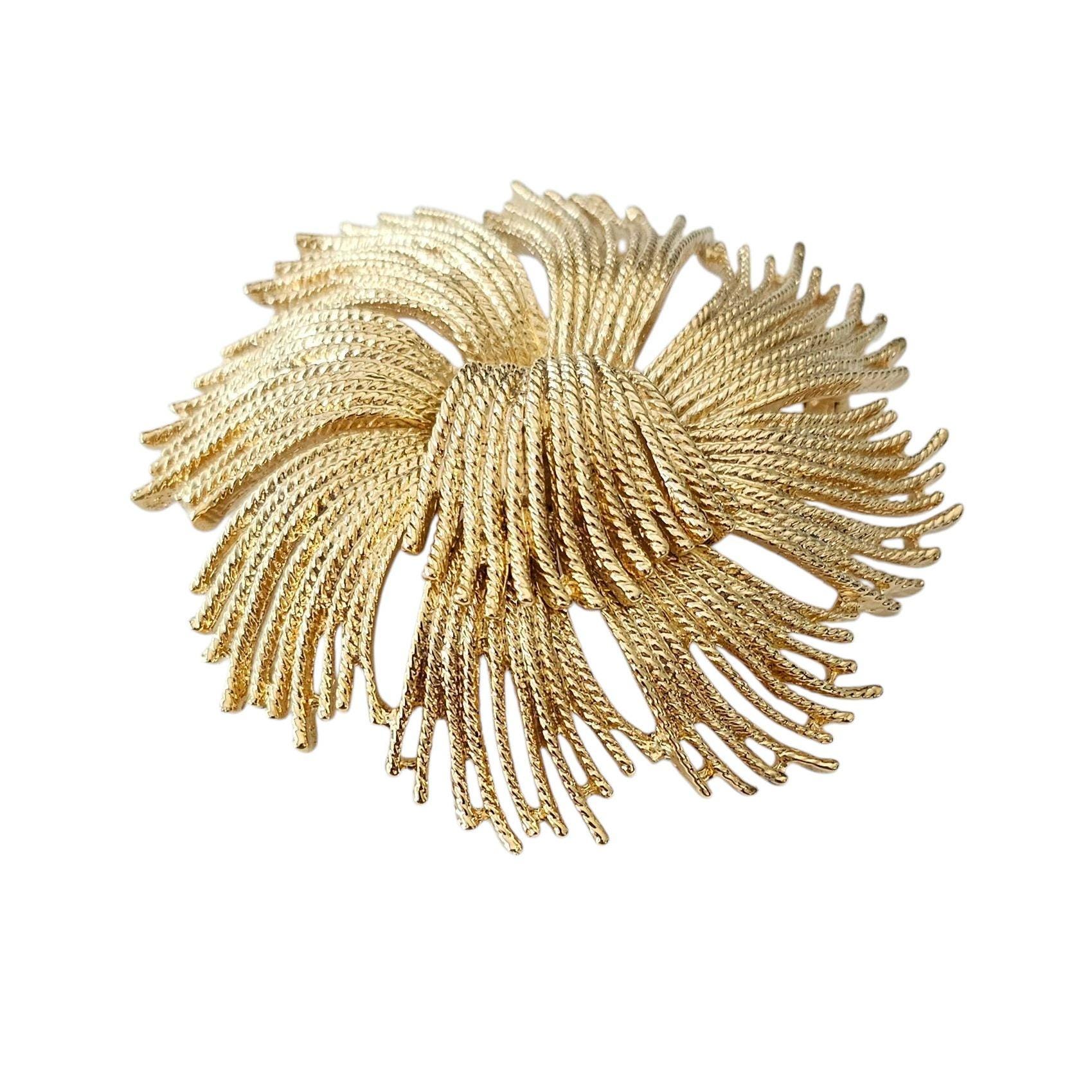 This Monet Gold Tone Cordelia Modernist Brooch is a vintage 1960s exquisite book piece. The design can be found in the book Monet: The Master Jewelers by Alice Vega. It features one of Monet's most popular designs, the Cordelia, produced from the 1960s through the middle of the 1980s. The elegantly crafted pin is in a radiant gold tone, decorated with an exquisite rope-like wiry element formed to make a round piece displaying an intricate texture, adding to the overall beauty of the brooch. It has a substantial size of 2.75 inches and is signed ©MONET on a rectangular cartouche on the reverse. It has a secure locking pin that functions properly, keeping it in place throughout the day. So you can confidently showcase this accessory without worrying about it coming loose or falling off.