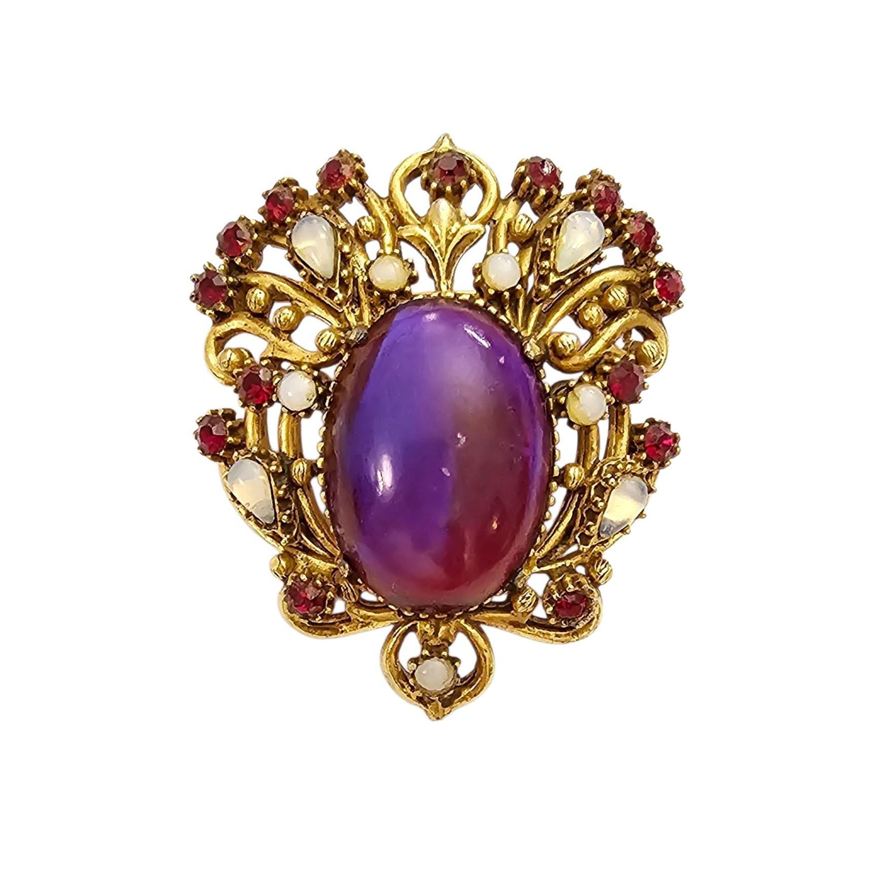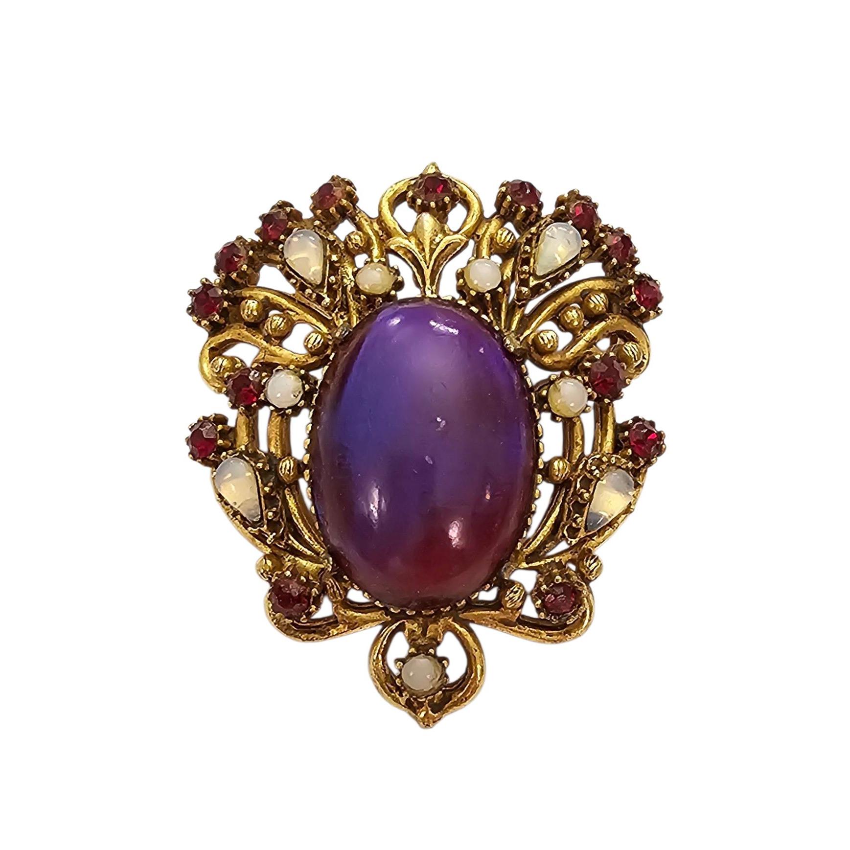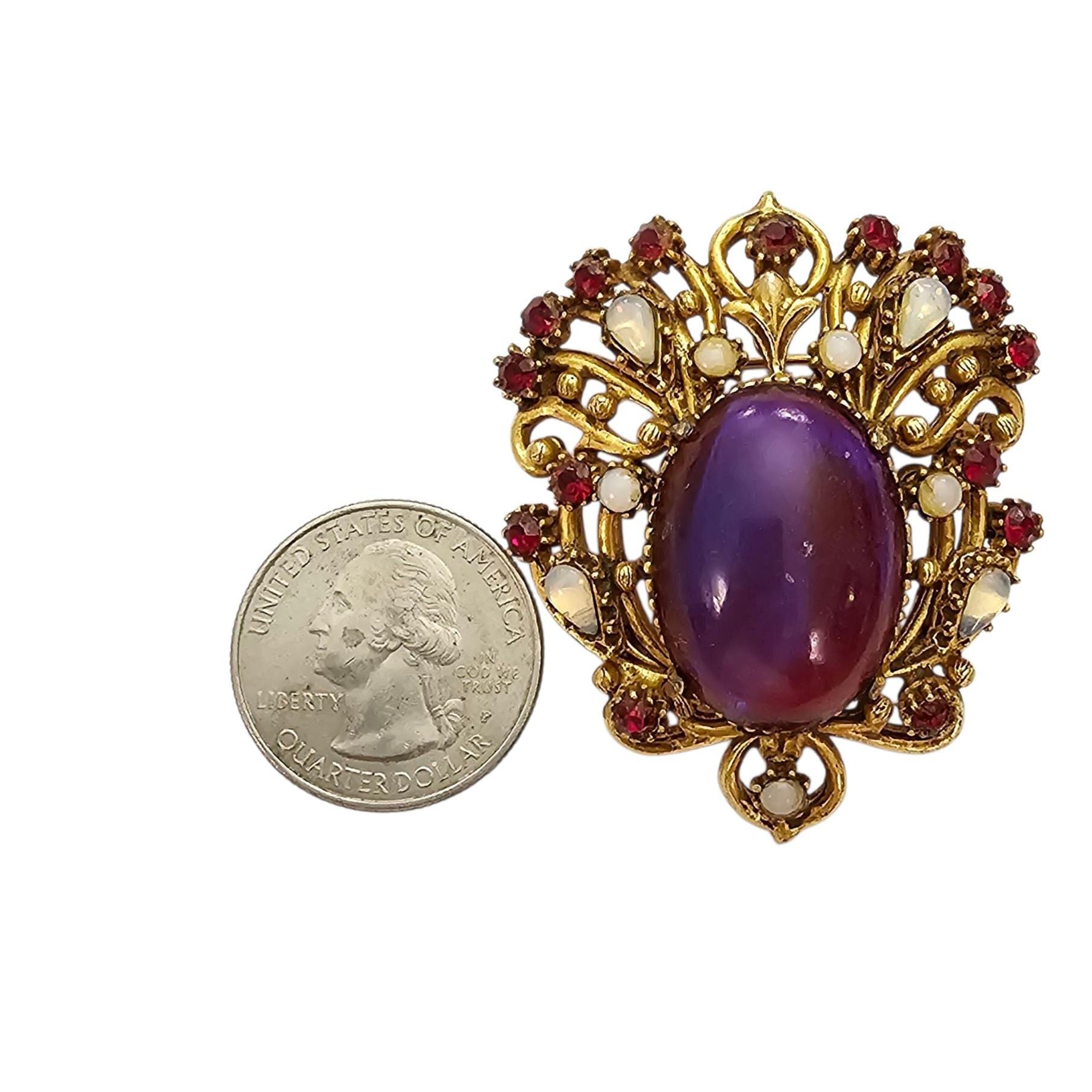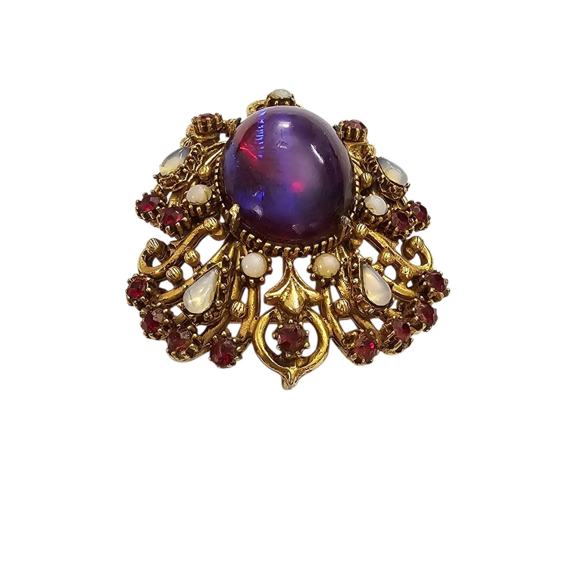 Florenza Pink Blue AB Domed Cabochon Brooch Red Rhinestone White Opaline Pin Pendant Signed, C180