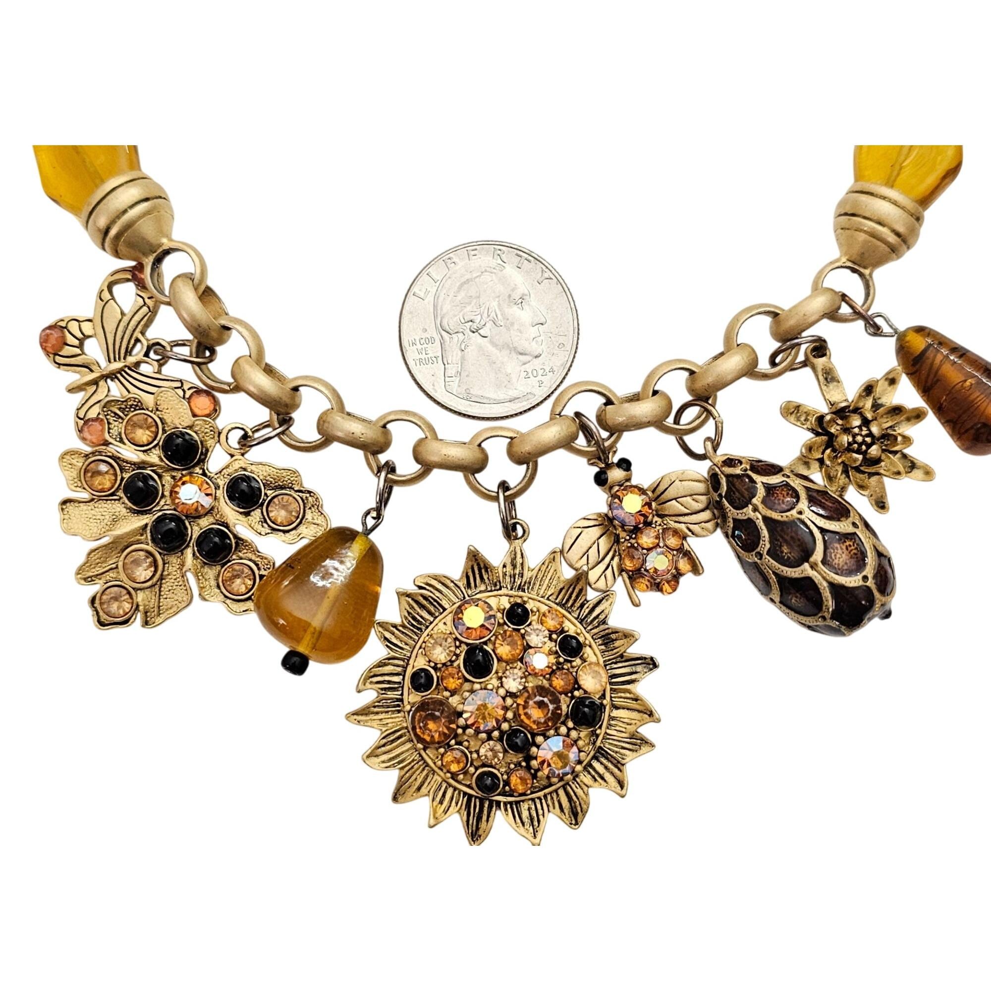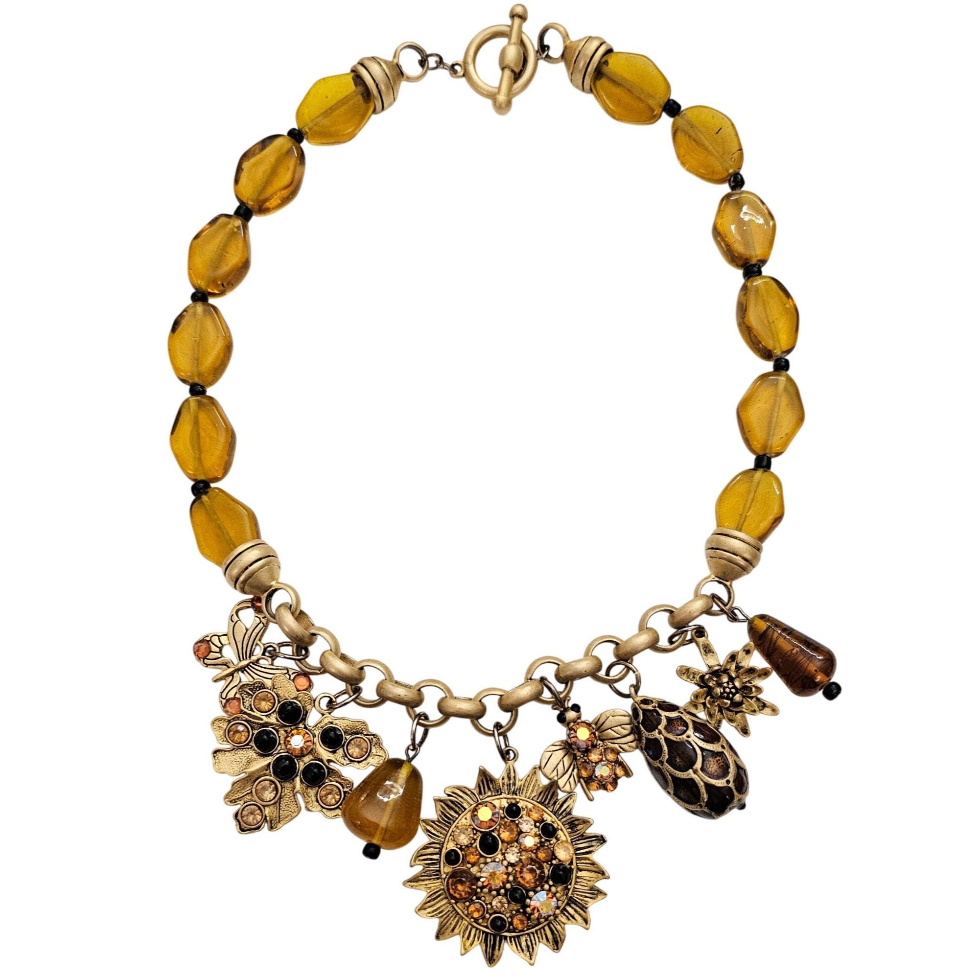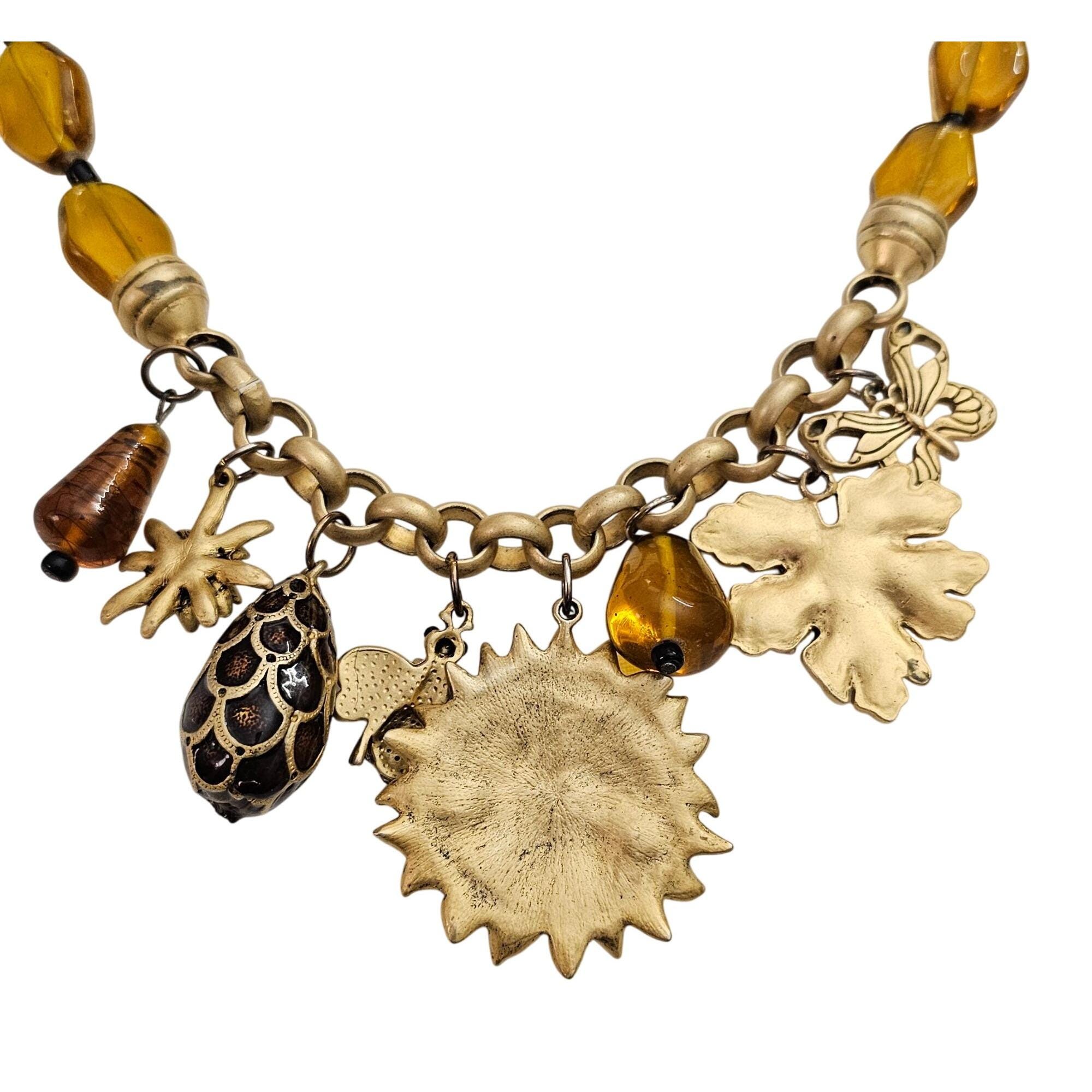 Matte Gold Tone Multi Charm Bee, Maple Leaf Sun Flower Charm Necklace, Yellow Glass Strand, C246