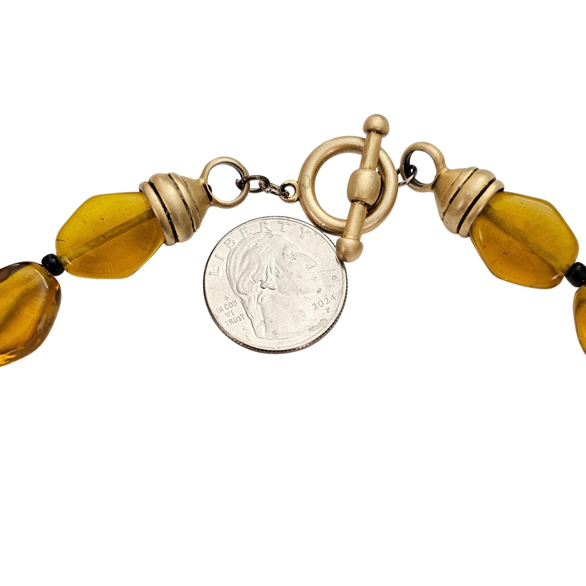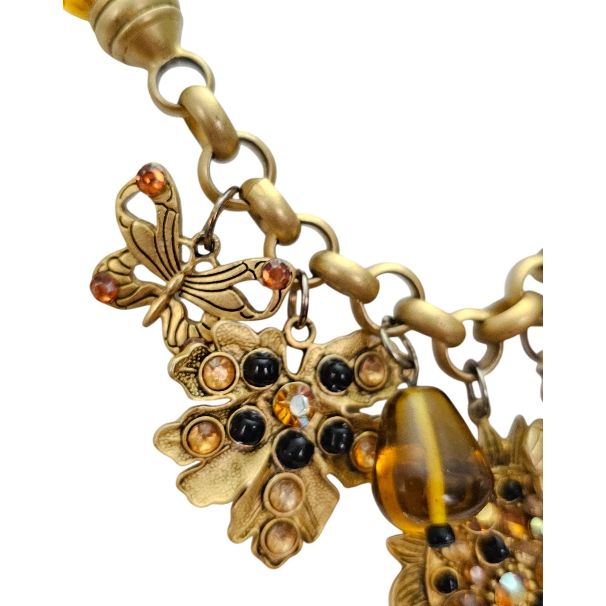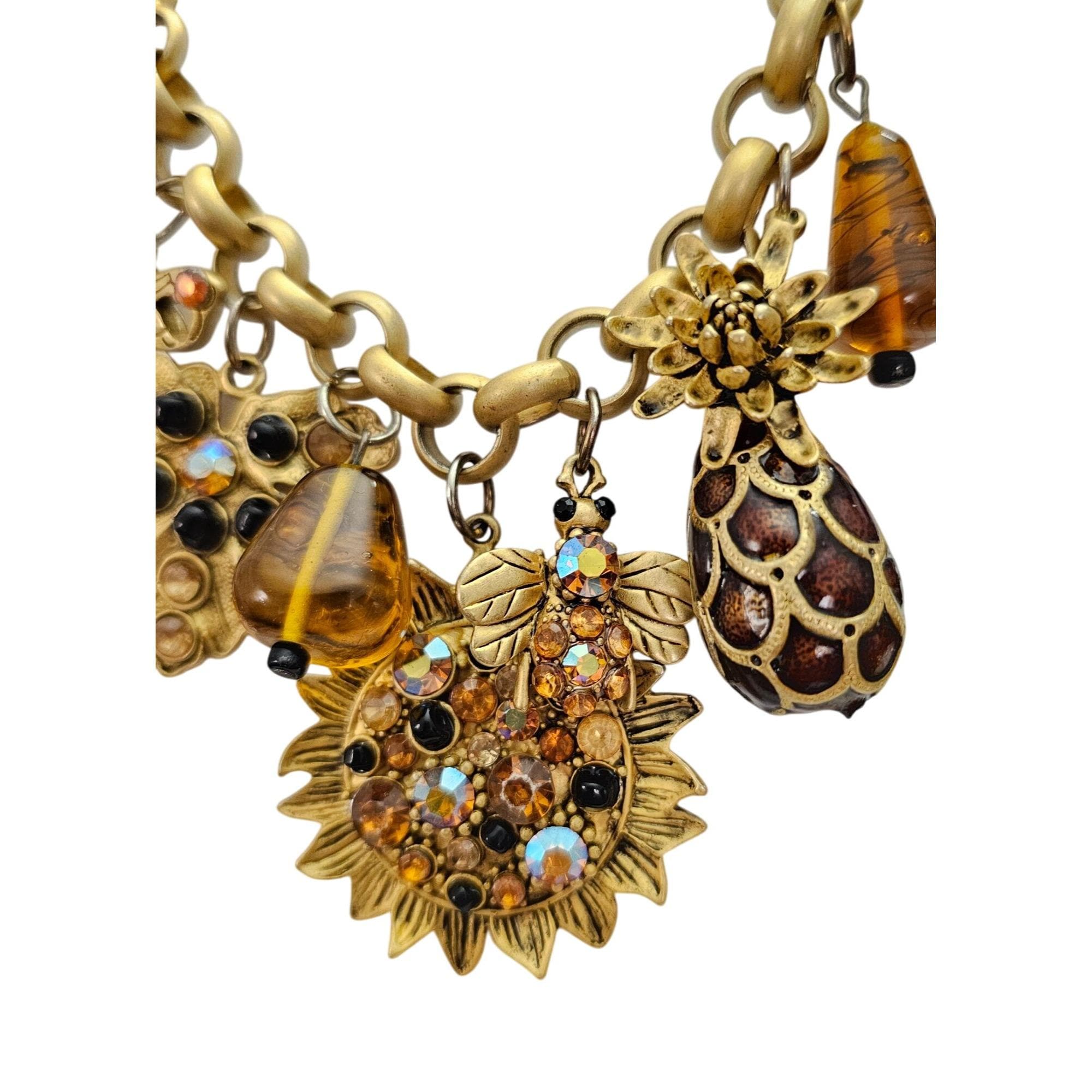 Matte Gold Tone Multi Charm Bee, Maple Leaf Sun Flower Charm Necklace, Yellow Glass Strand, C246