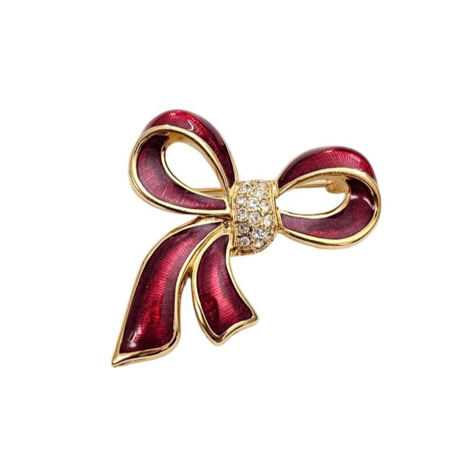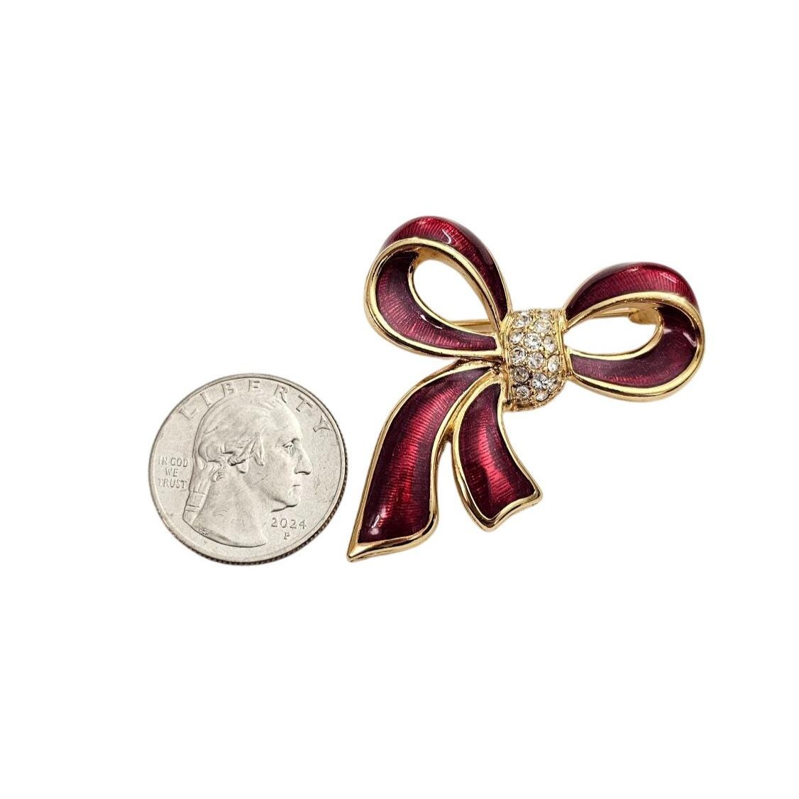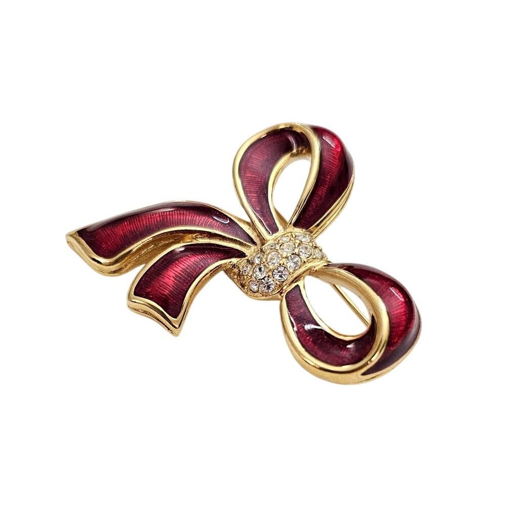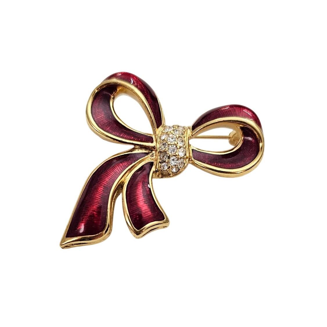 Monet Red Bow Brooch Clear Rhinestone Pin Signed, C244