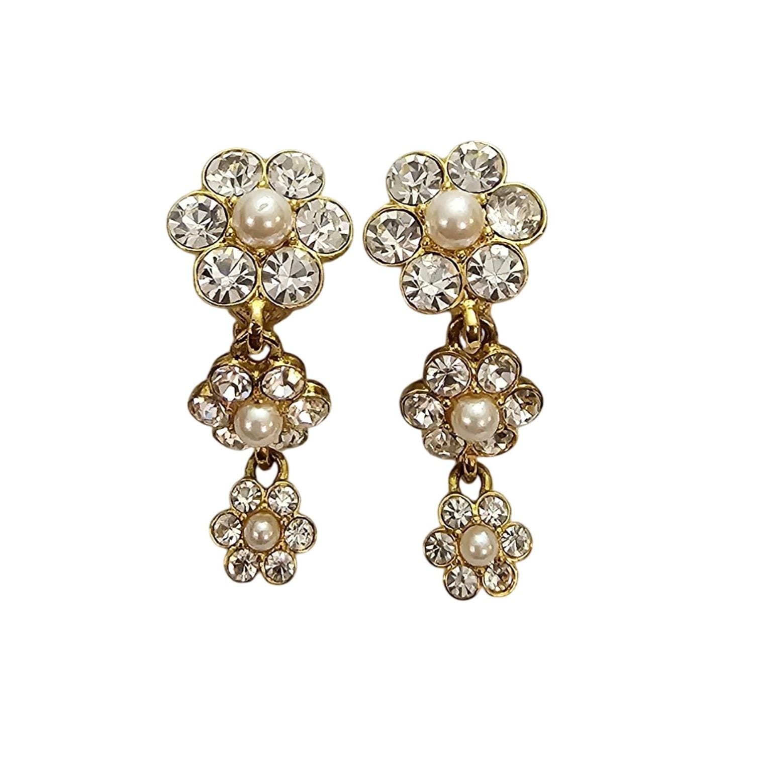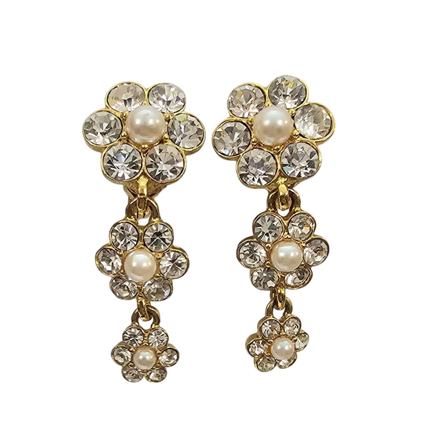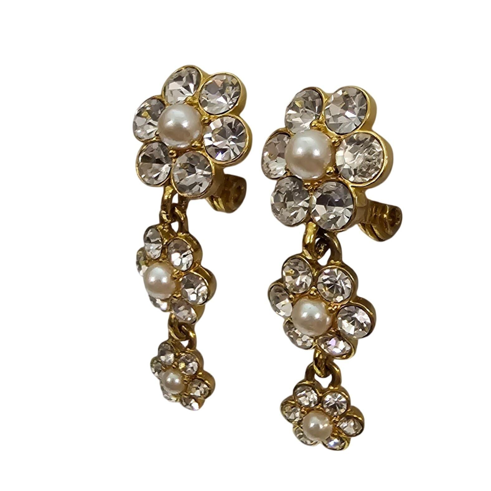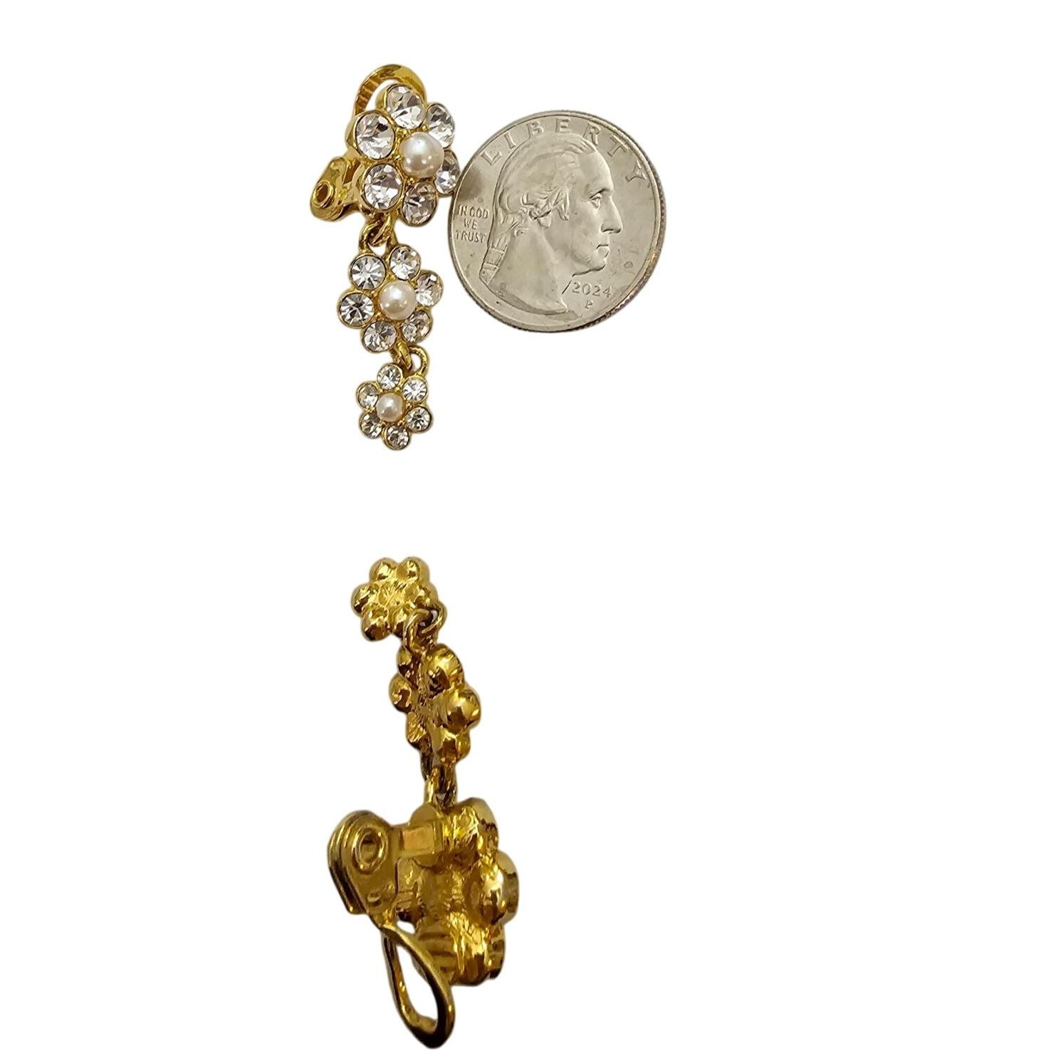 Monet Gold Tone Clip On Clear Rhinestone Faux Pearl Flower Charm Dangle Earrings, C234
