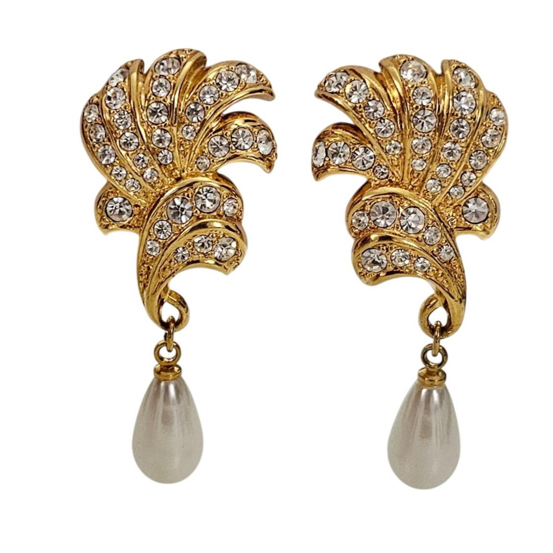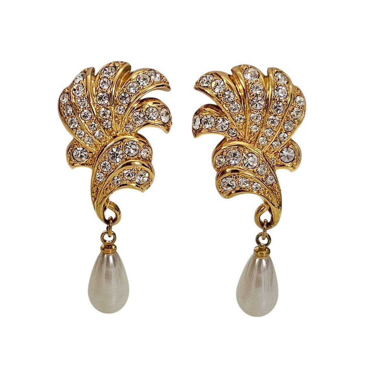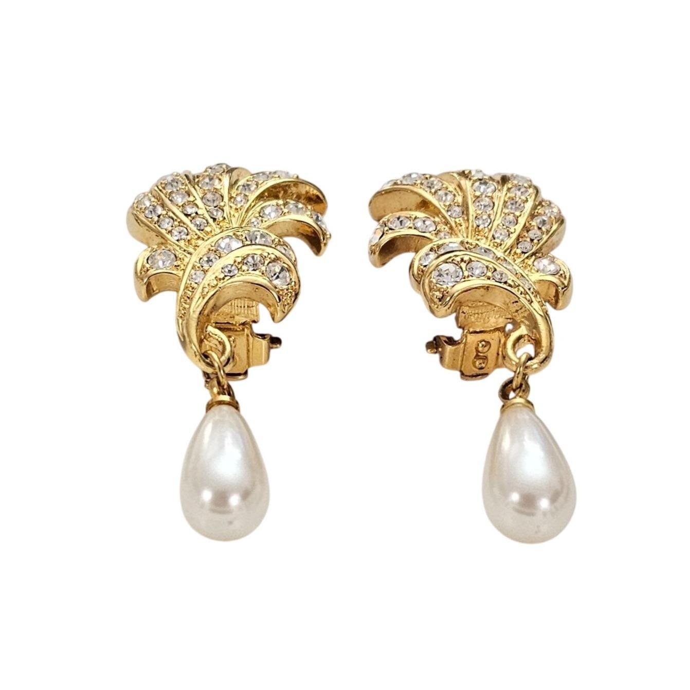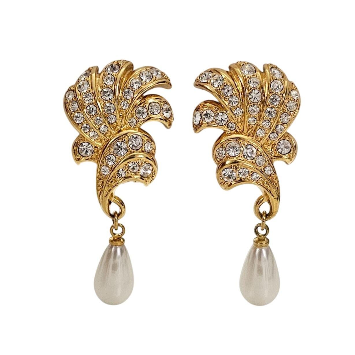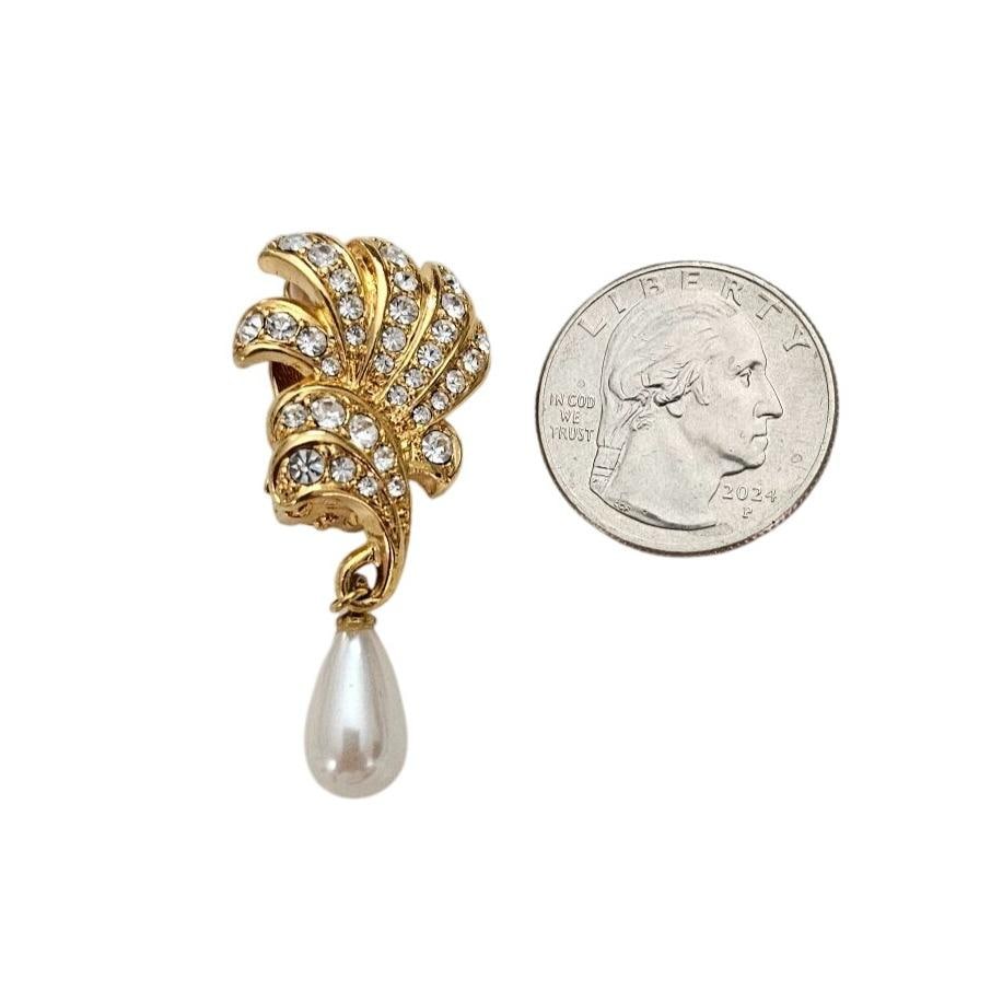 Gold Tone Clear Rhinestone Faux Pearl Drop Clip on Earrings C263