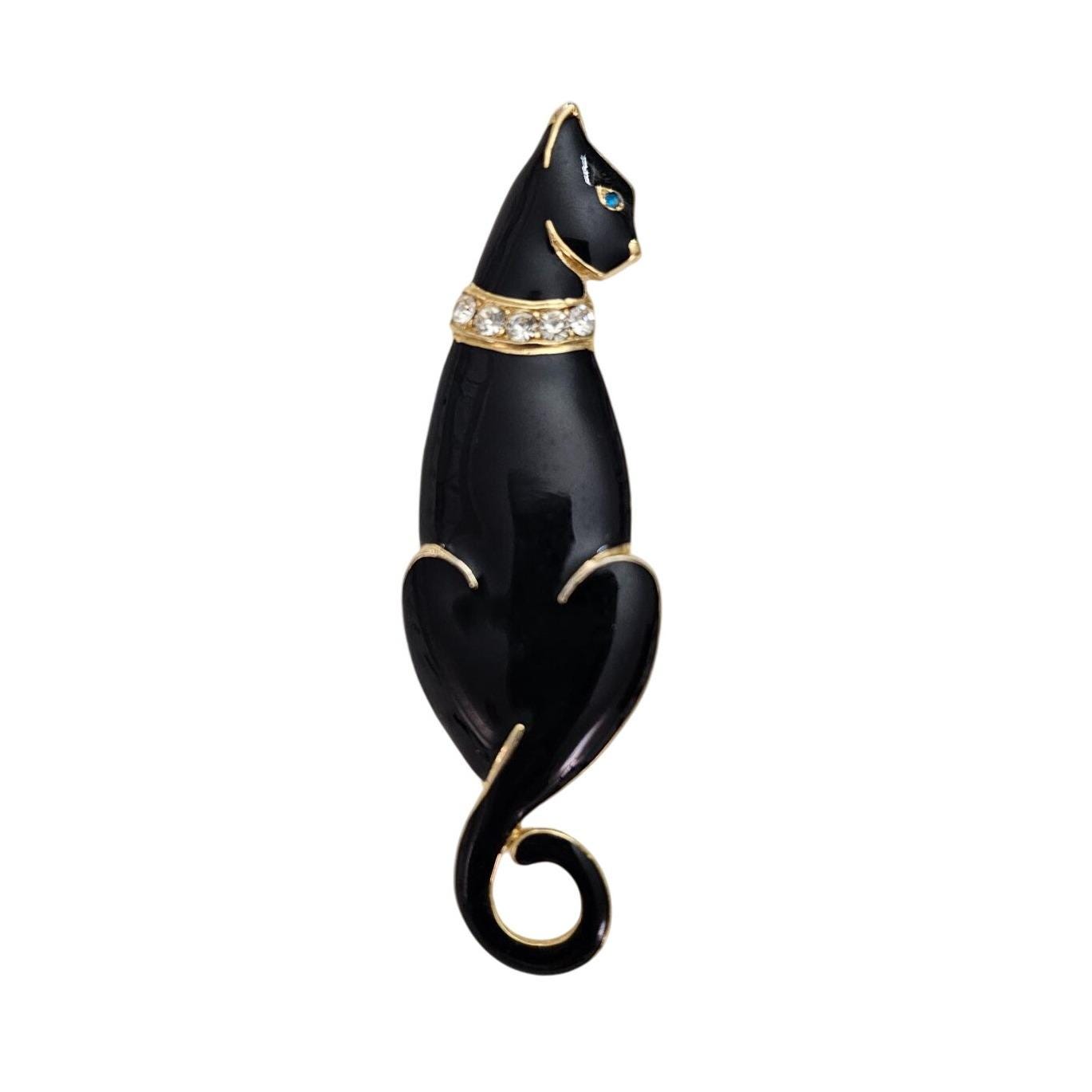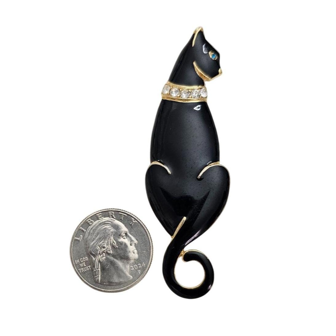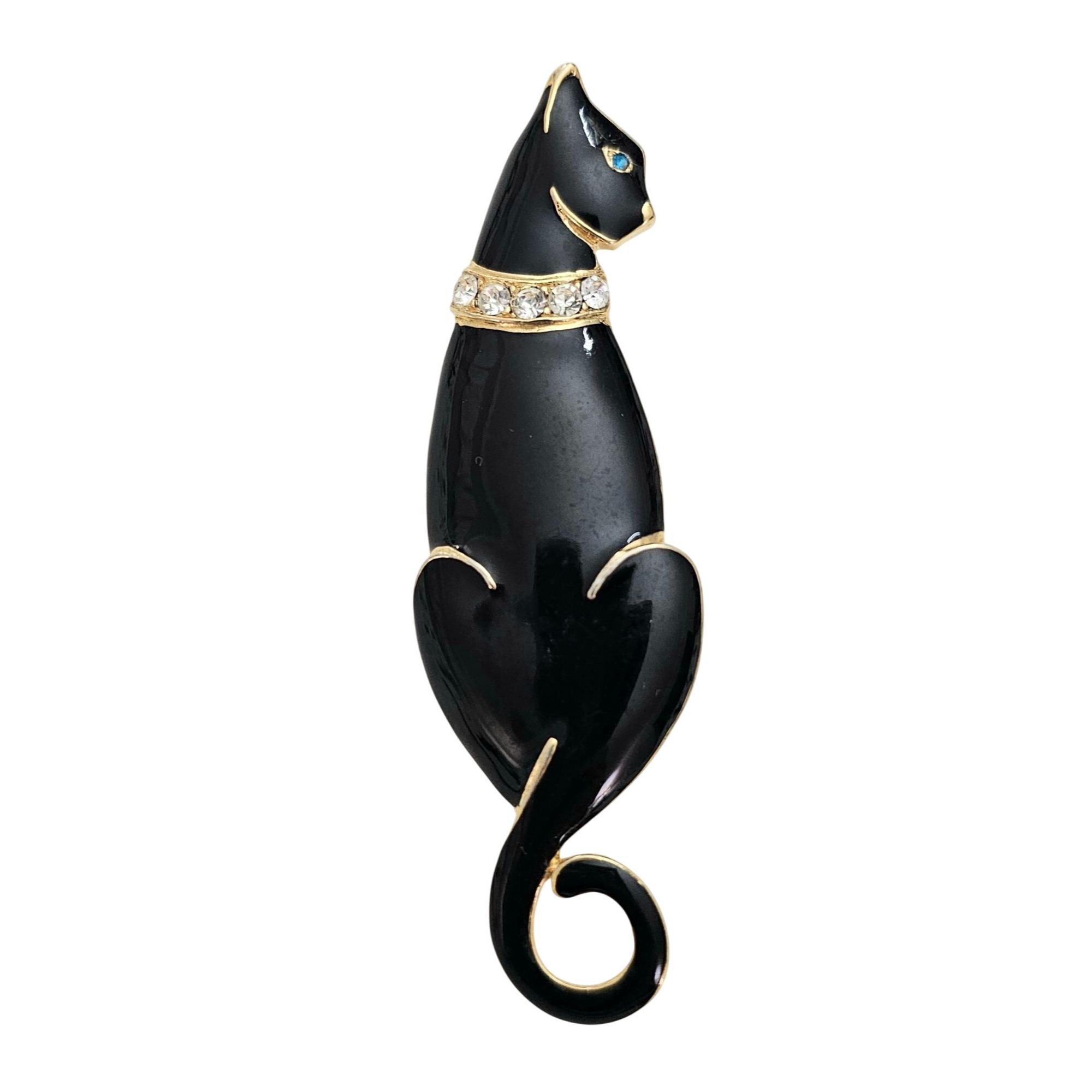 Trifari TM Black Enamel Cat Brooch Clear Rhinestone Blue Eye Pin Signed, C261