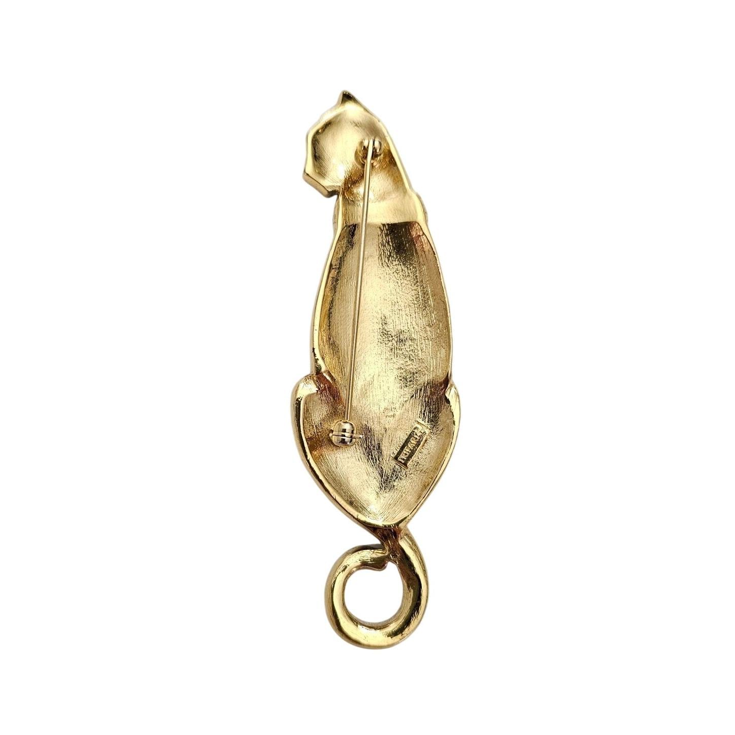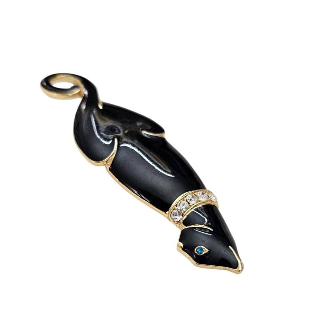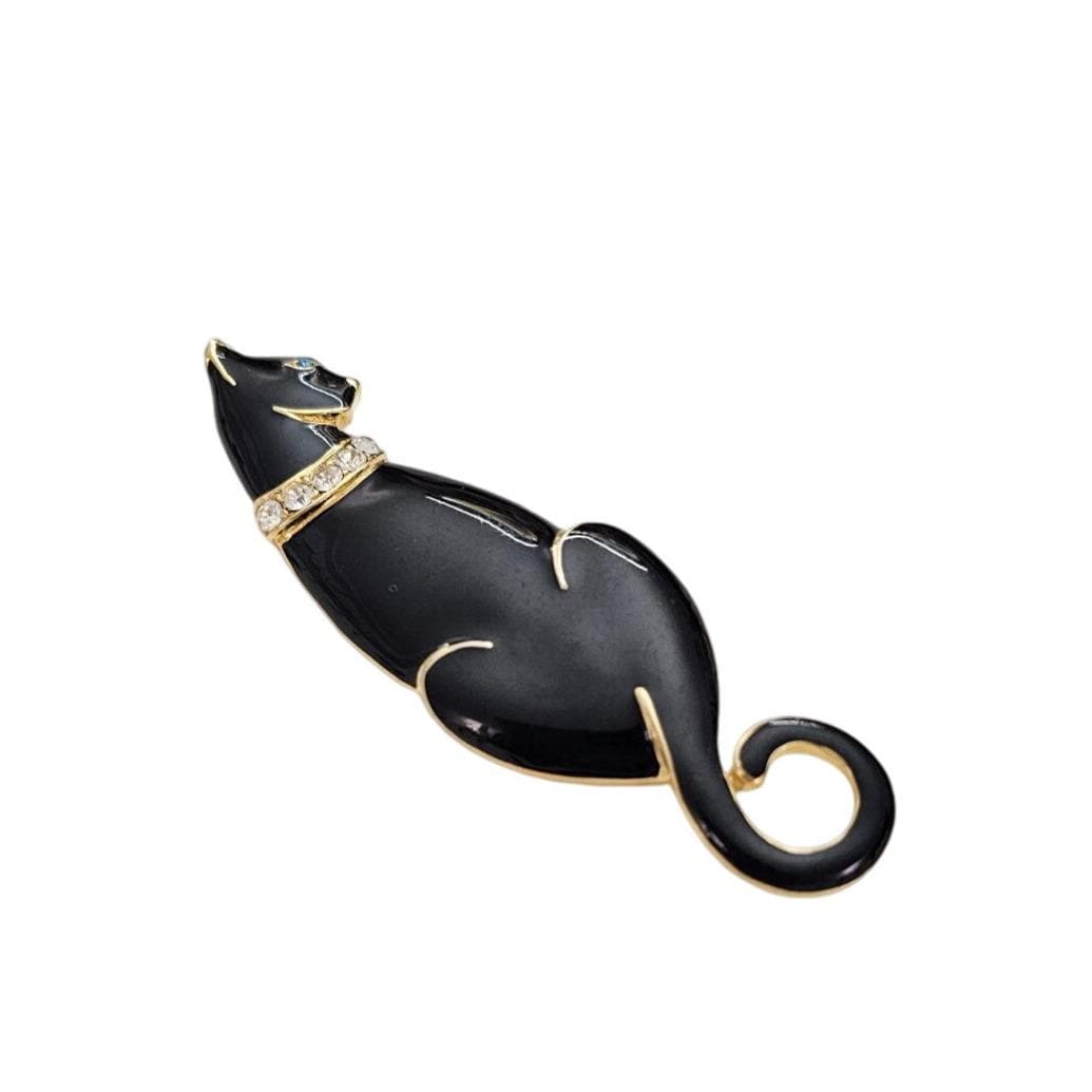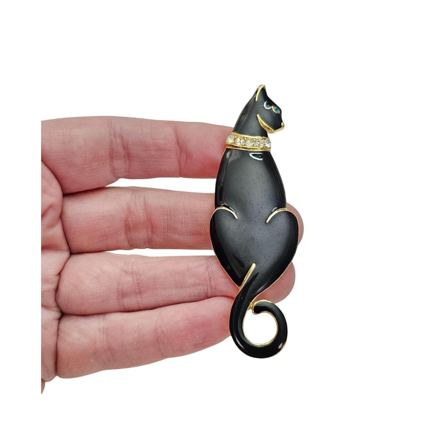 Trifari TM Black Enamel Cat Brooch Clear Rhinestone Blue Eye Pin Signed, C261
