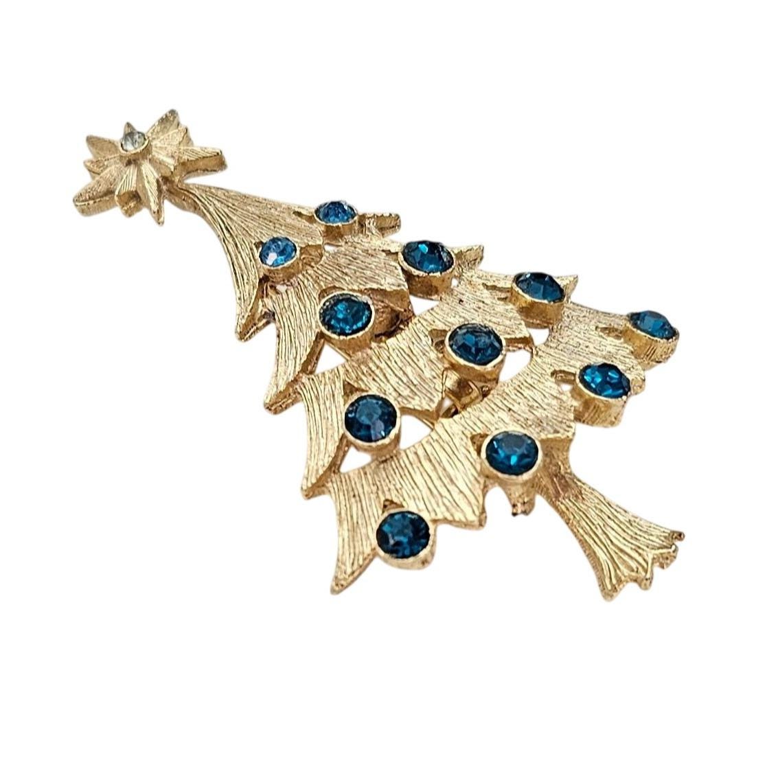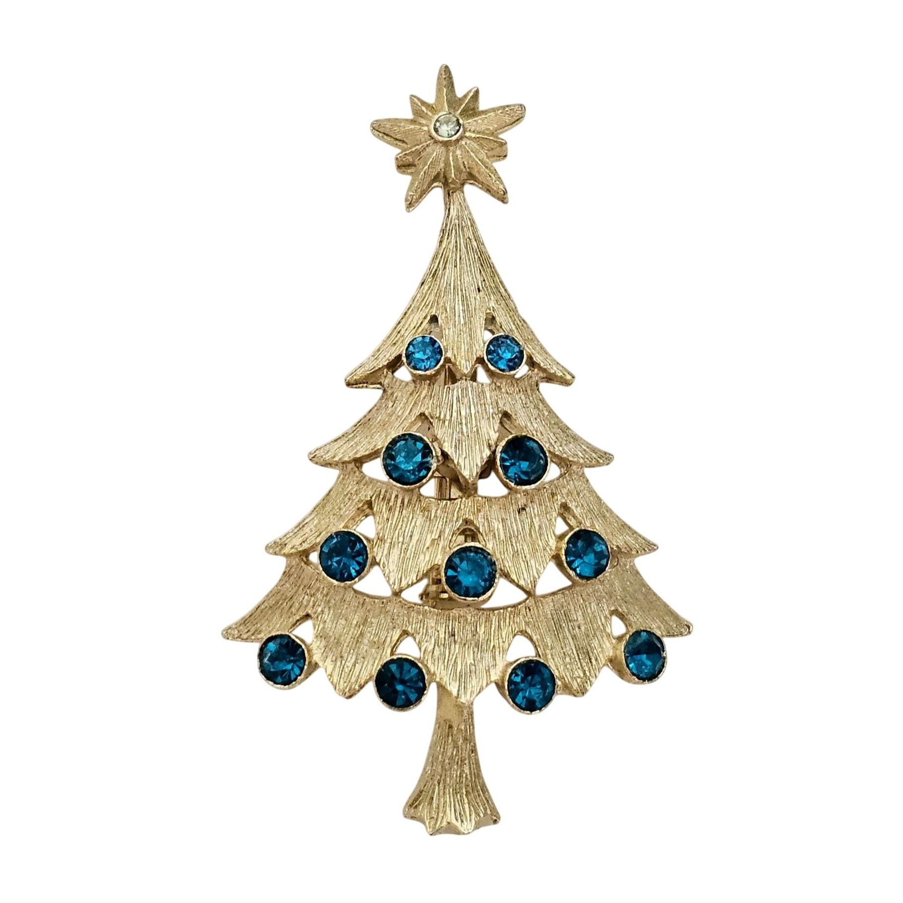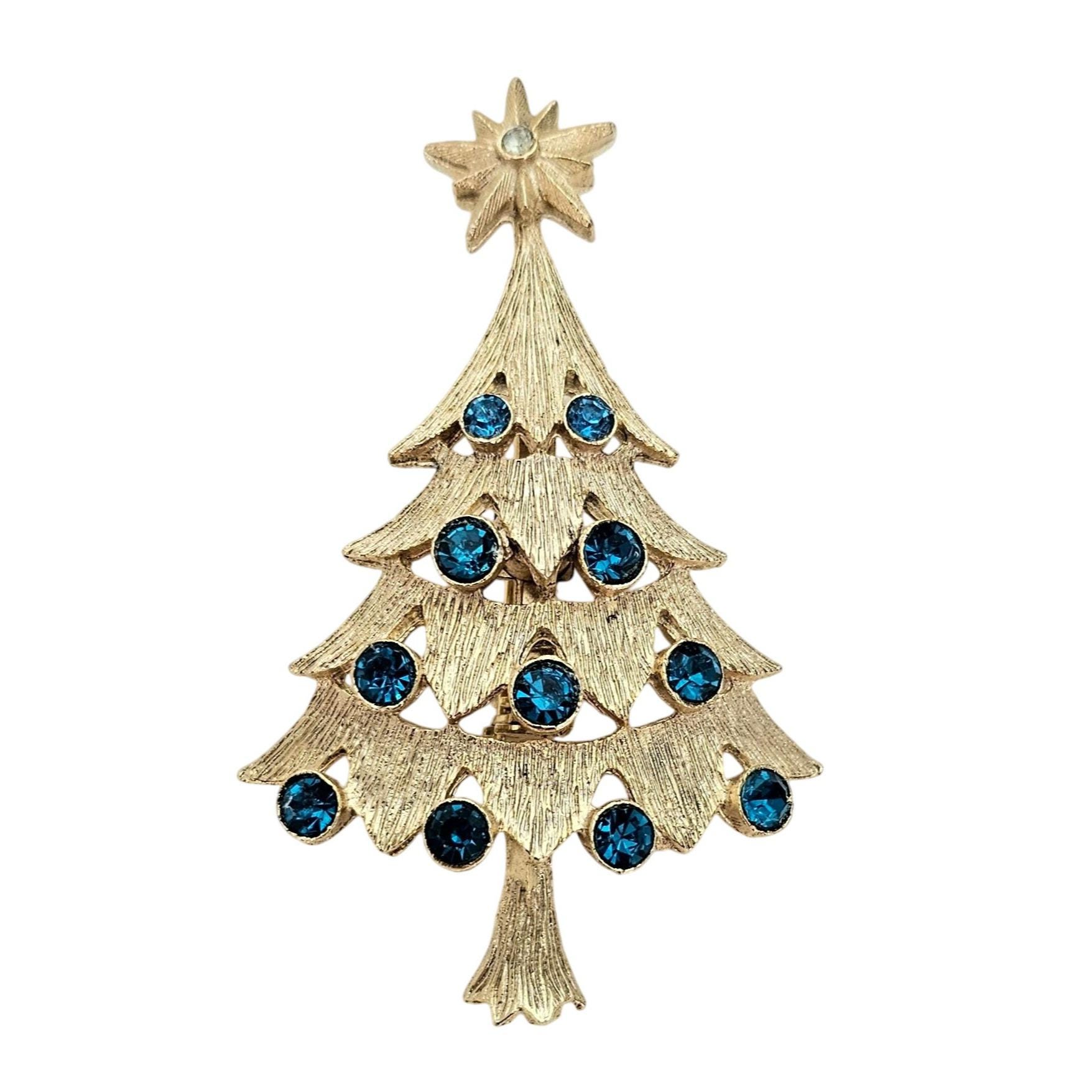 Gold Tone Robin's Egg Blue Rhinestones Christmas Tree Brooch, C256