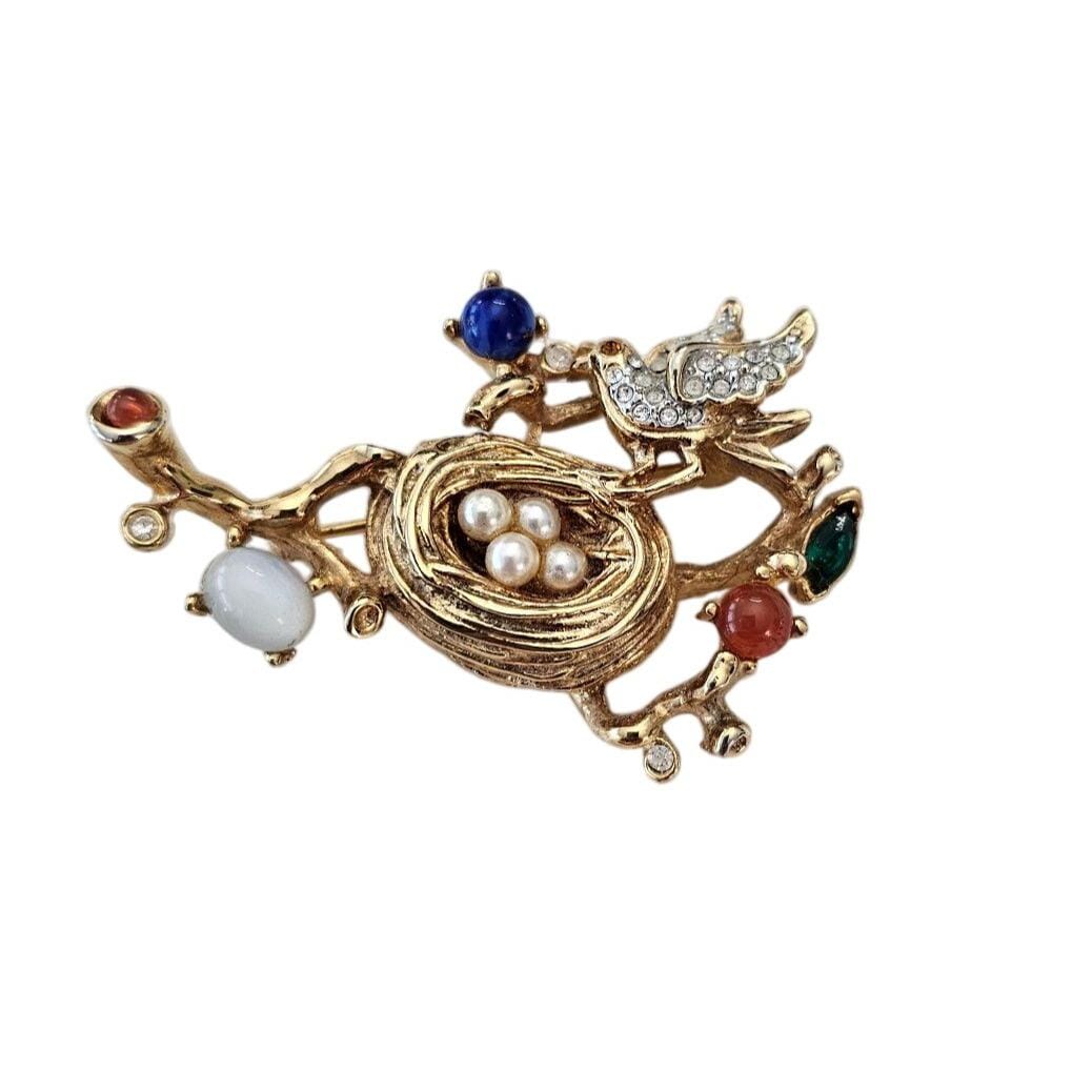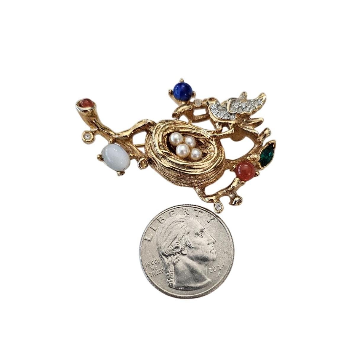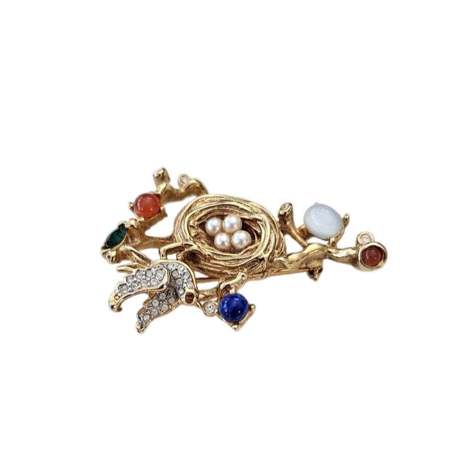 Craft Bird Brooch, Eggs Nest Rhinestone Pin Signed, C251