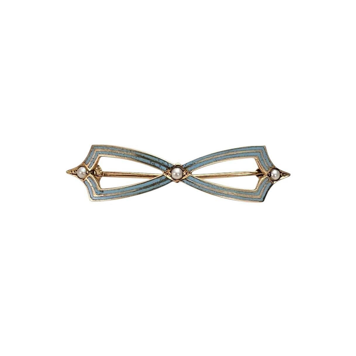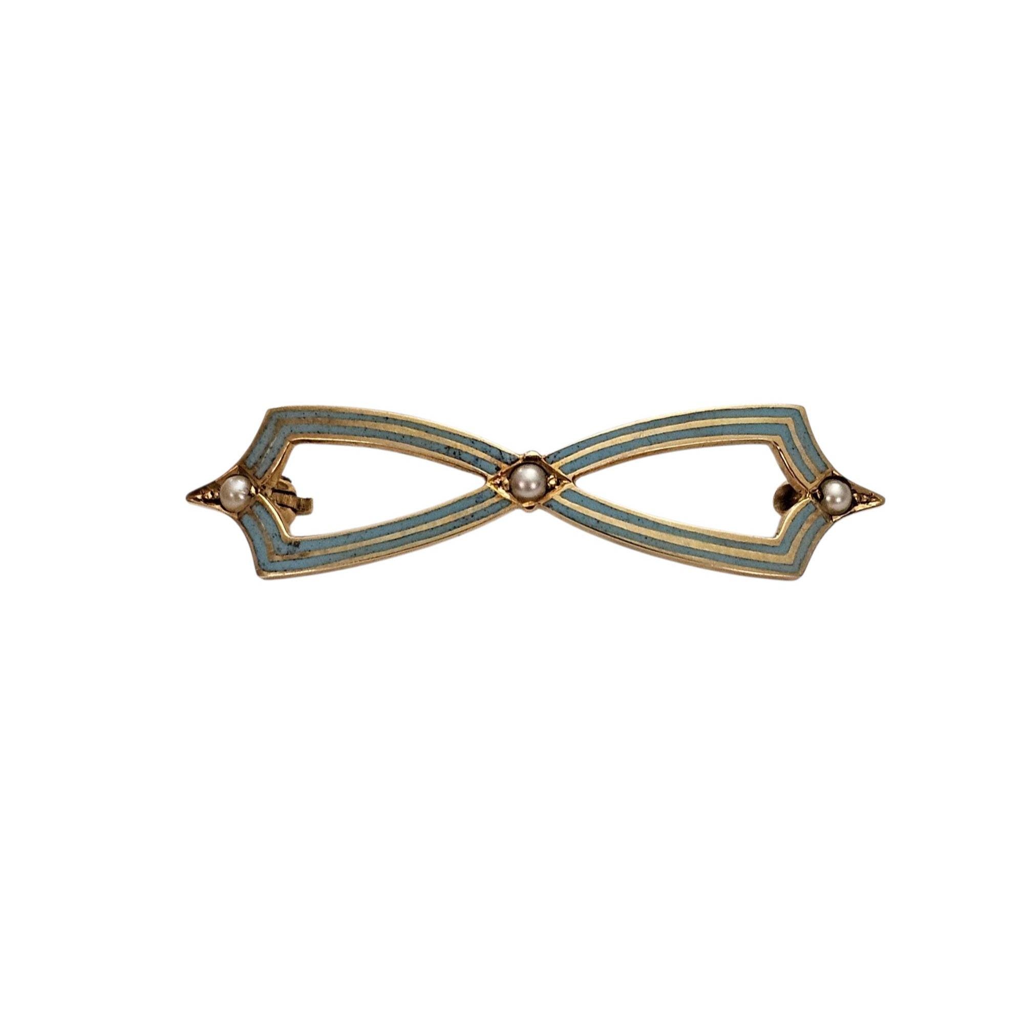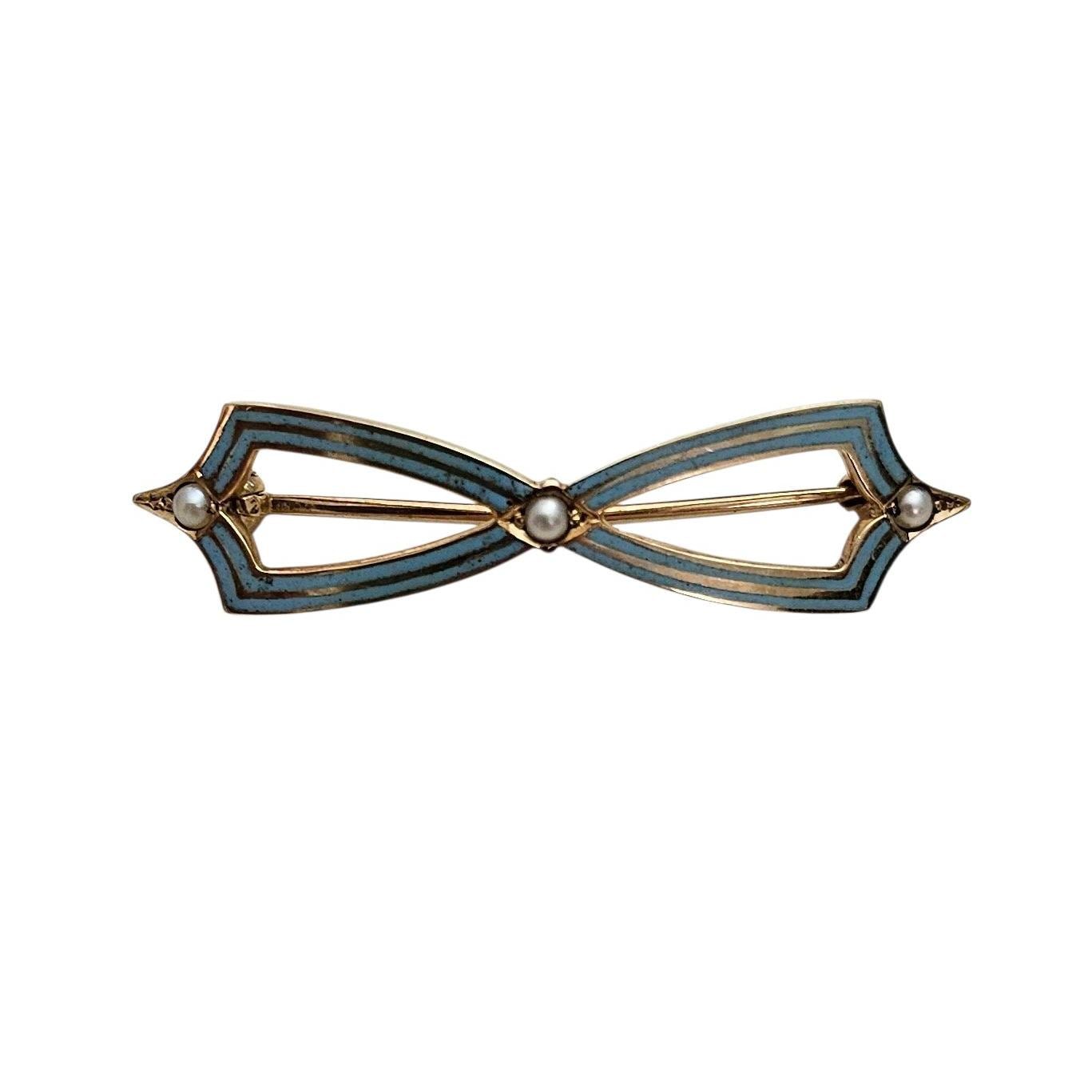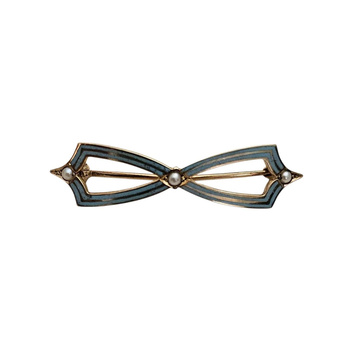 14K Yellow Gold Victorian Bow Brooch Blue Enamel, Pearls Pin C-Clasp C287