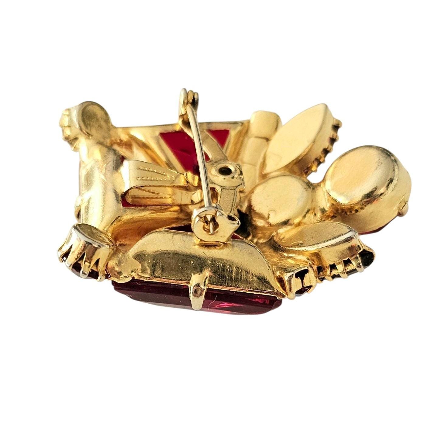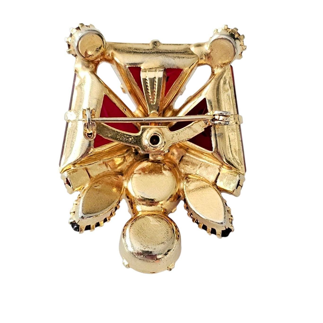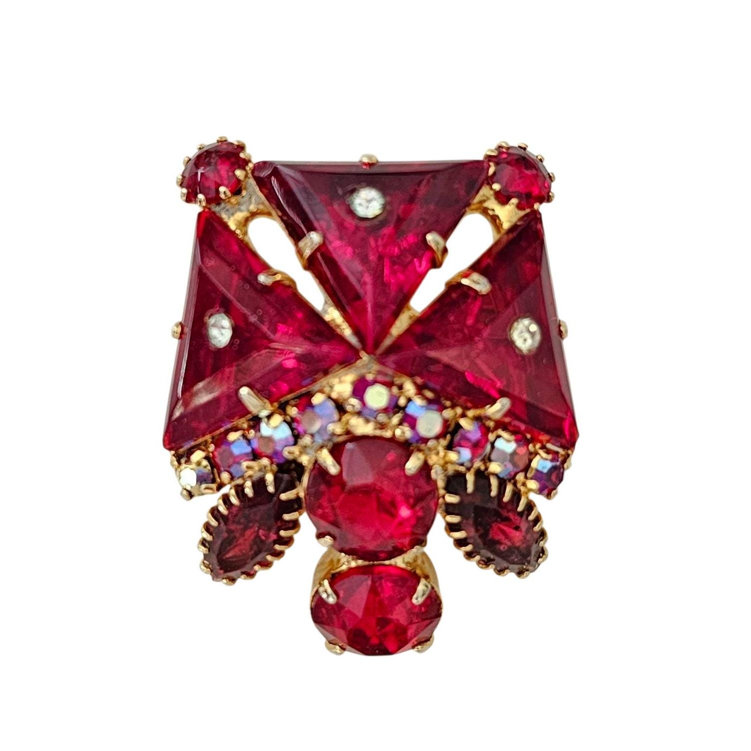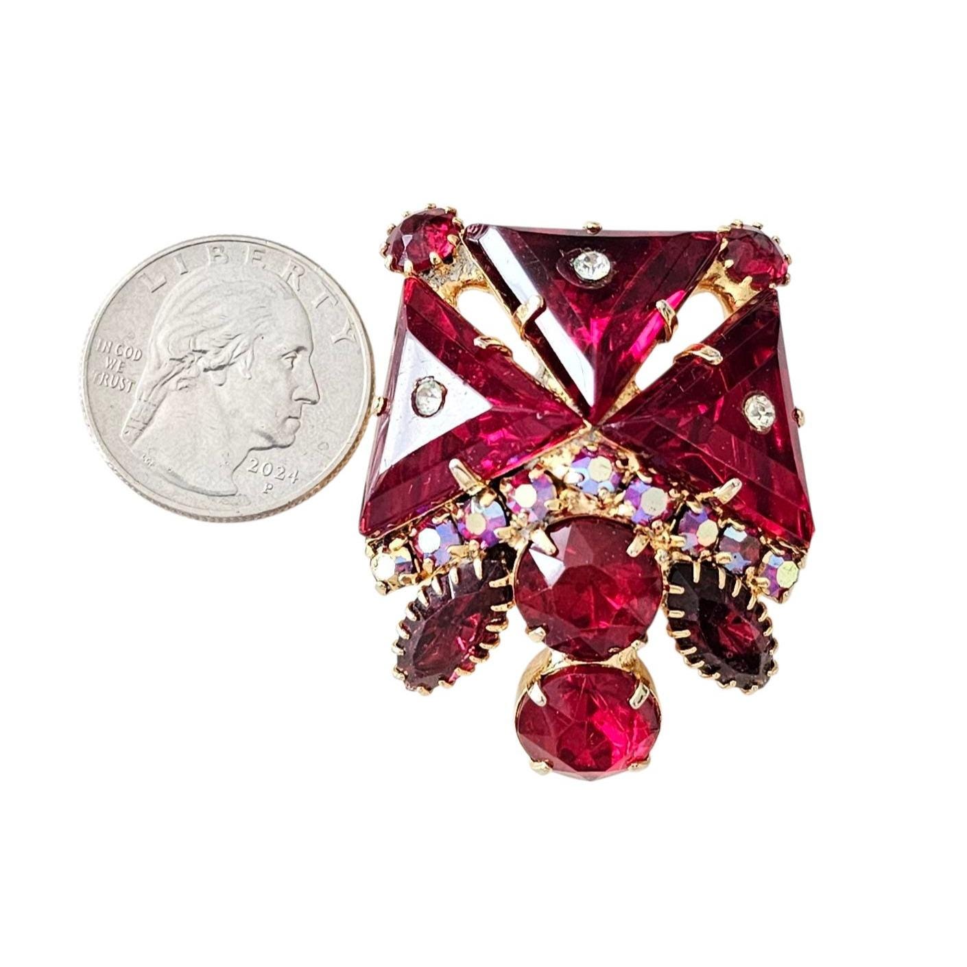 Red Rhinestone Vintage Chunky Trillion Navette Round Glass Cluster Brooch Pendant C285