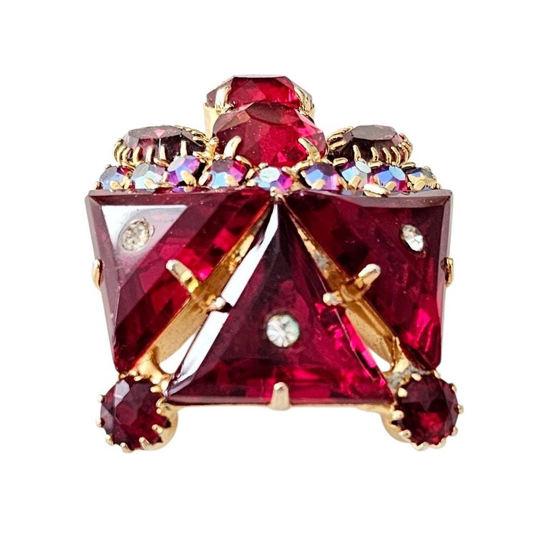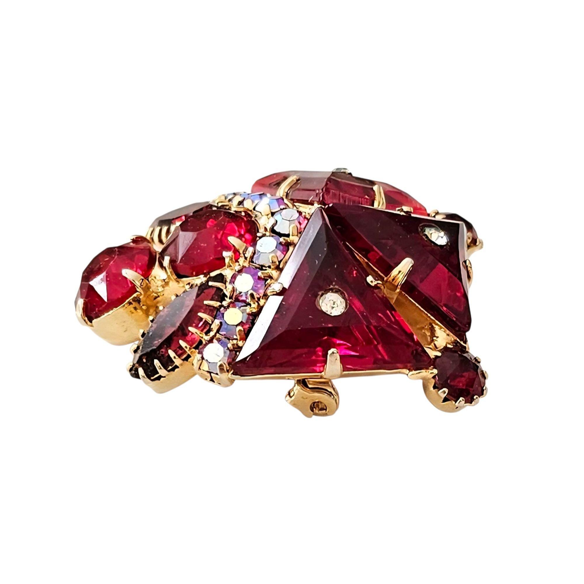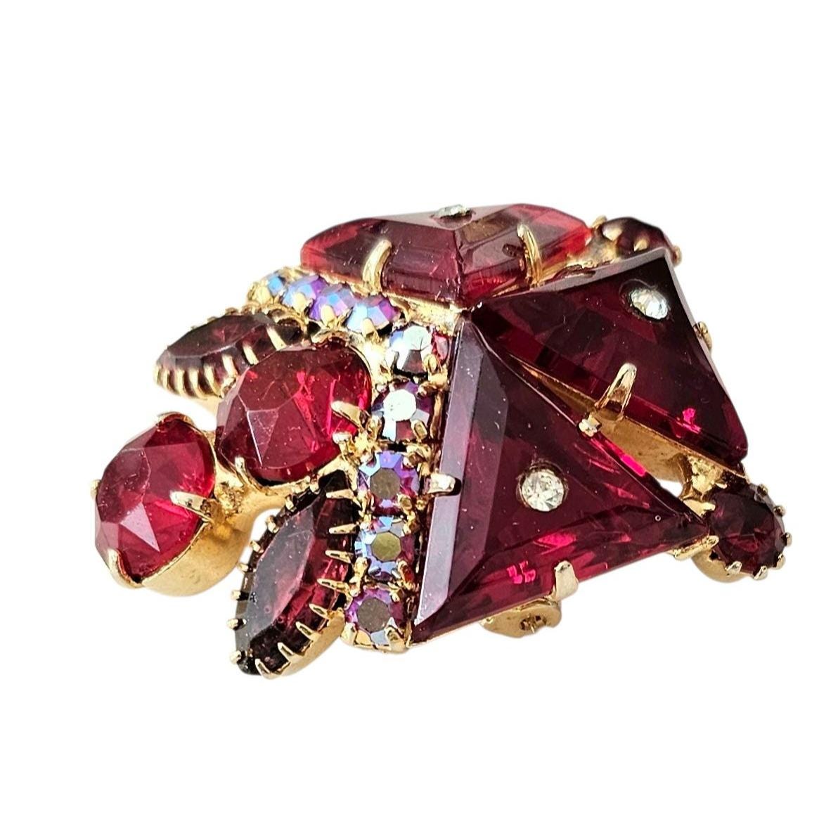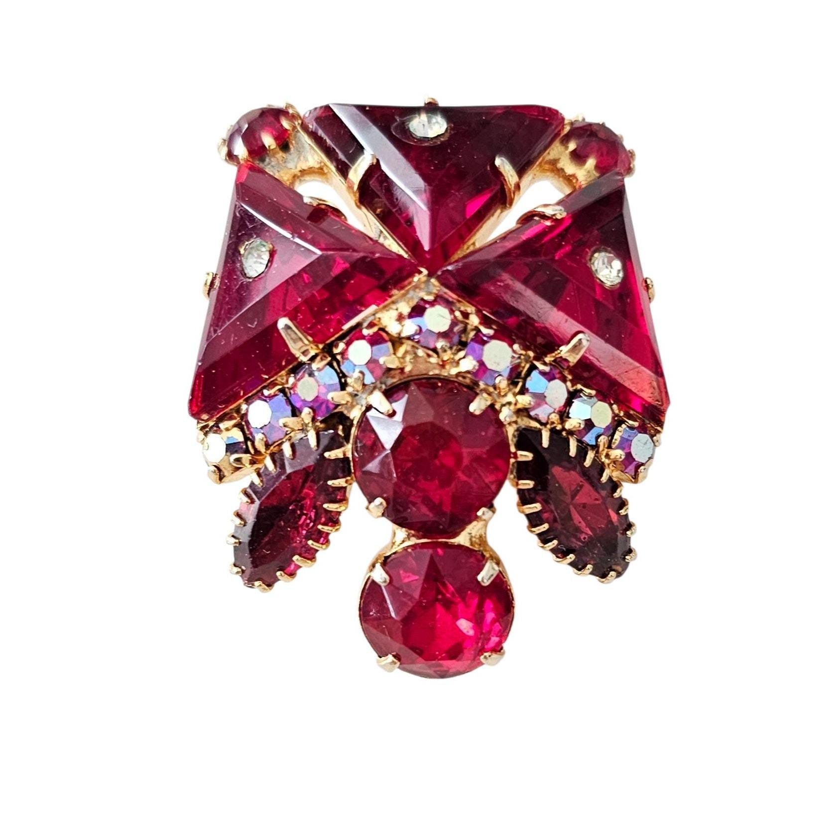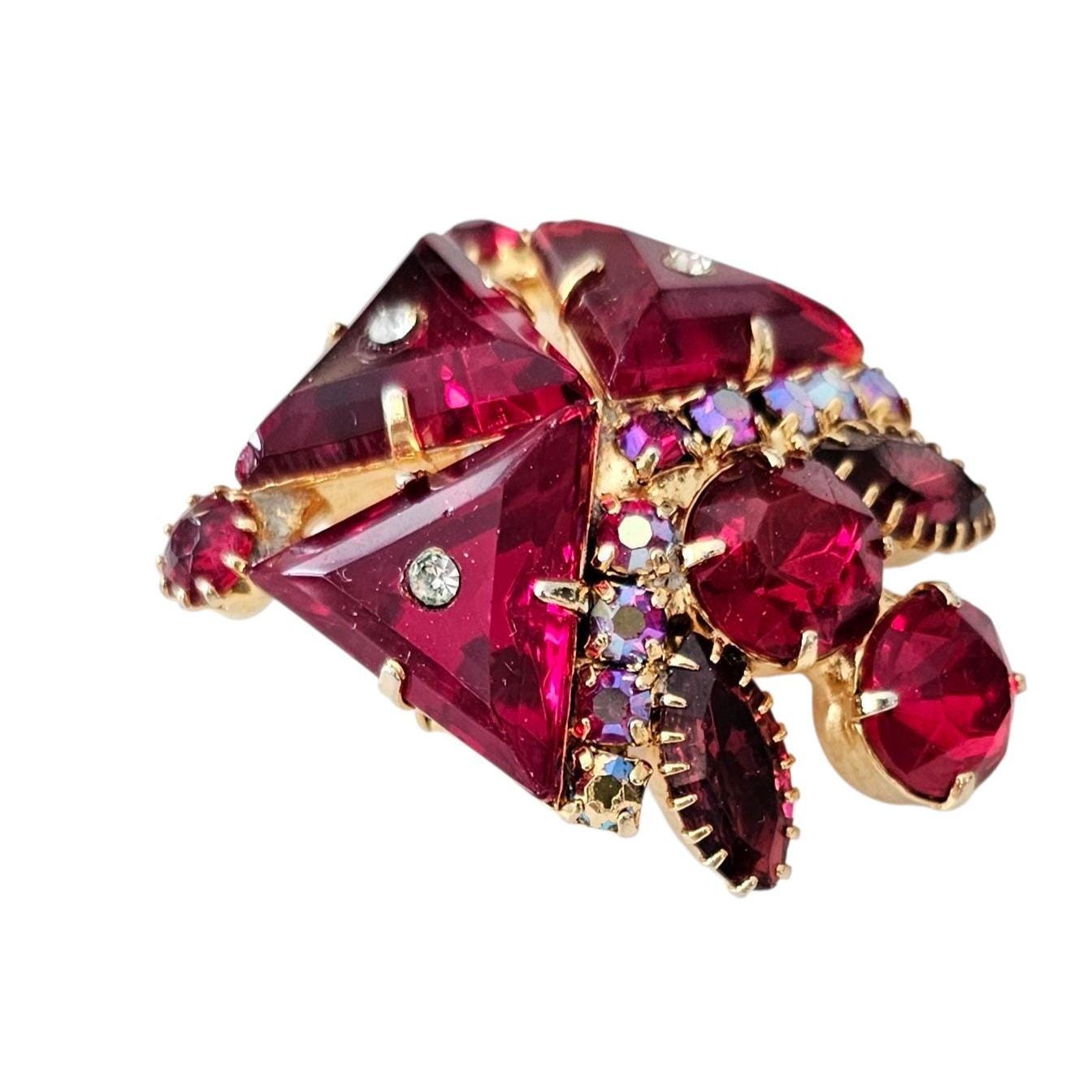 Red Rhinestone Vintage Chunky Trillion Navette Round Glass Cluster Brooch Pendant C285
