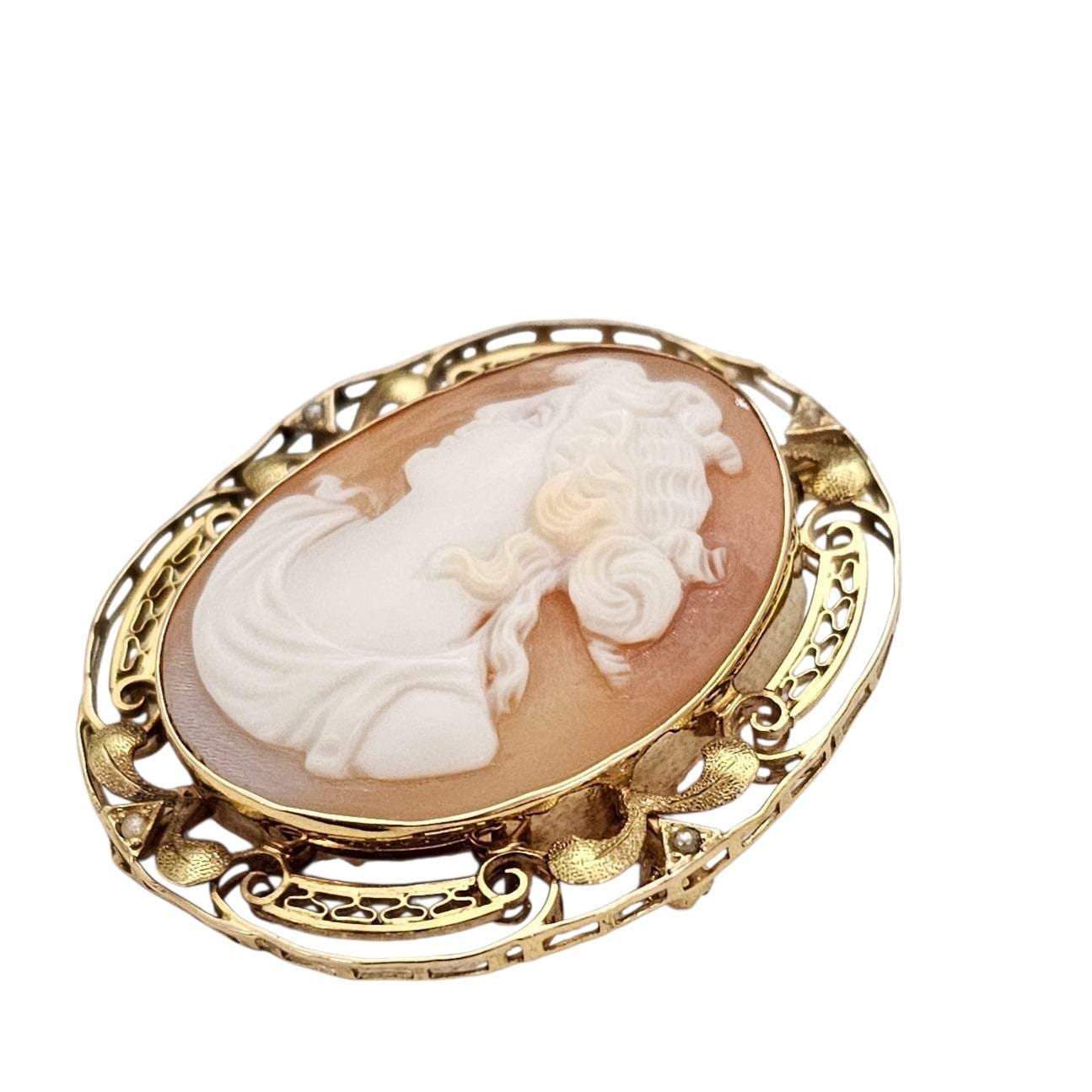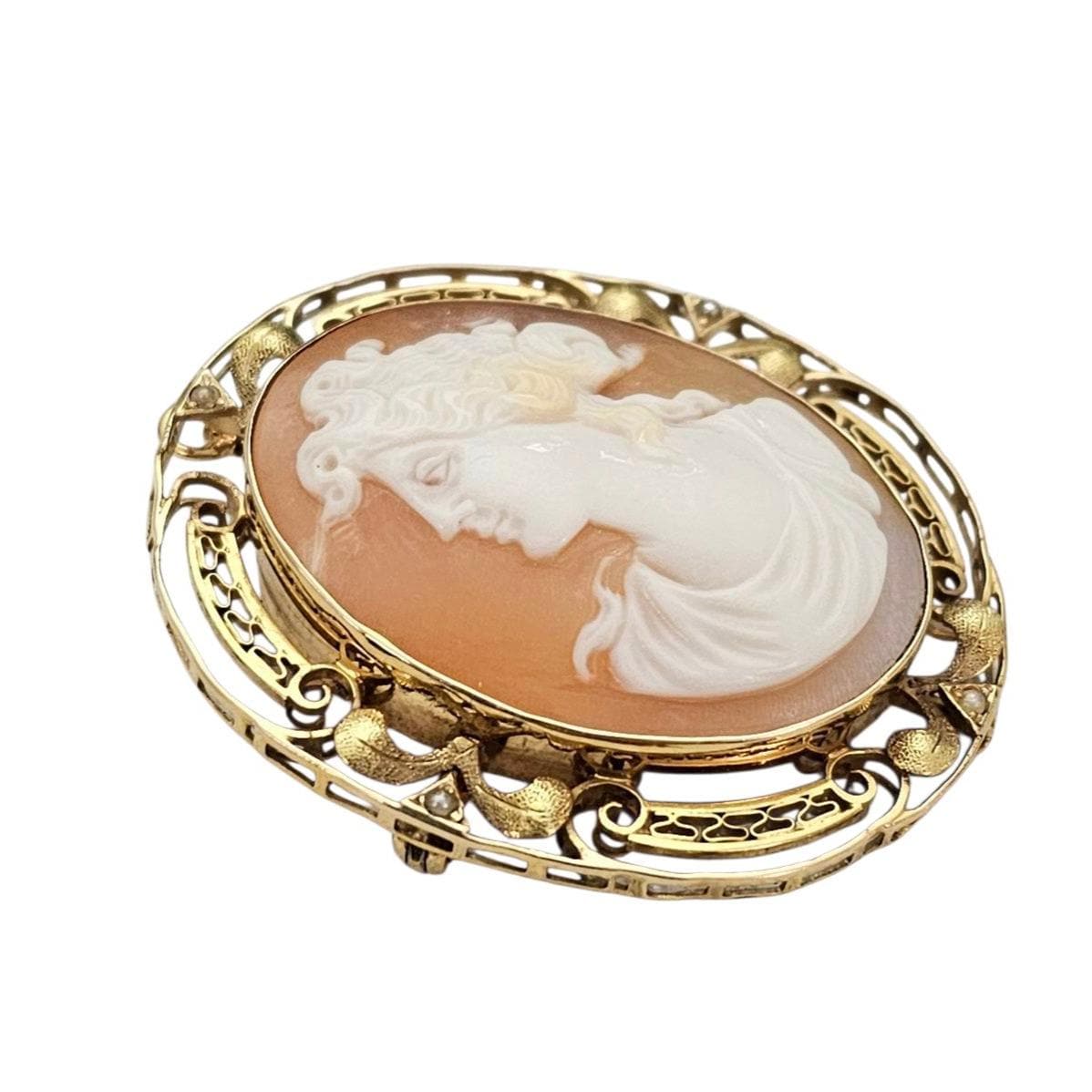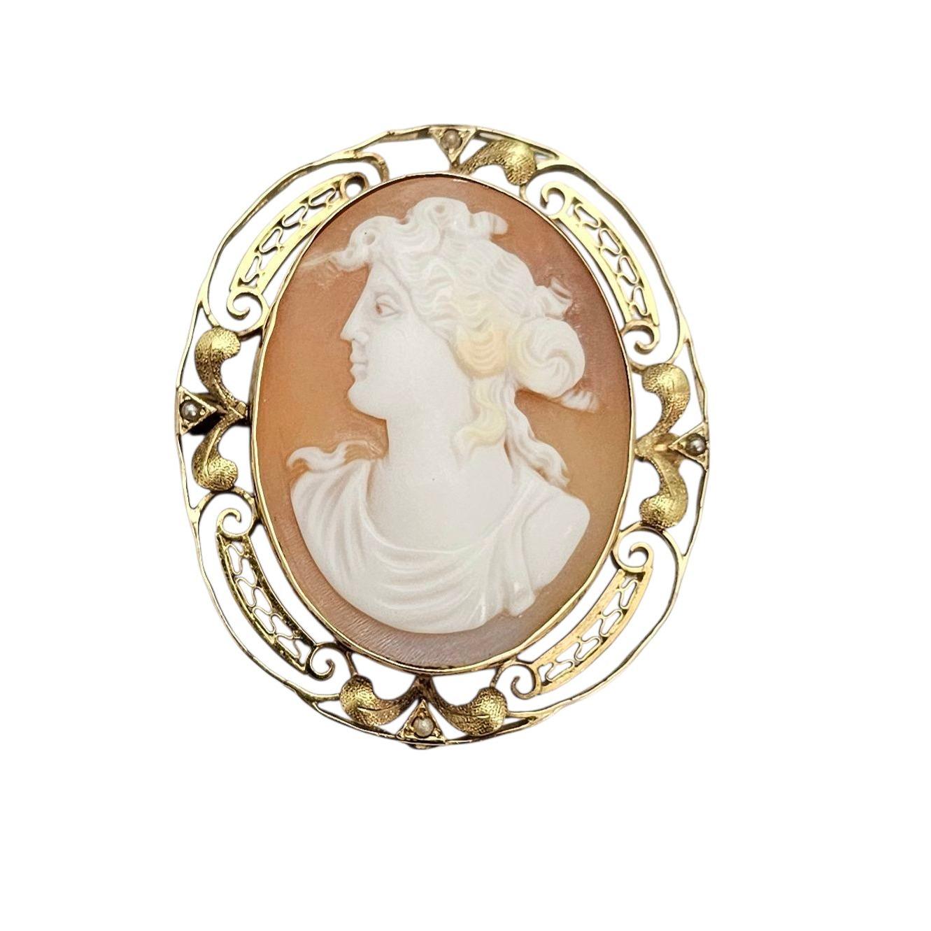10K Yellow Gold Cameo Left-Facing Lady's Profile Seed Pearl Brooch Pendant, C300