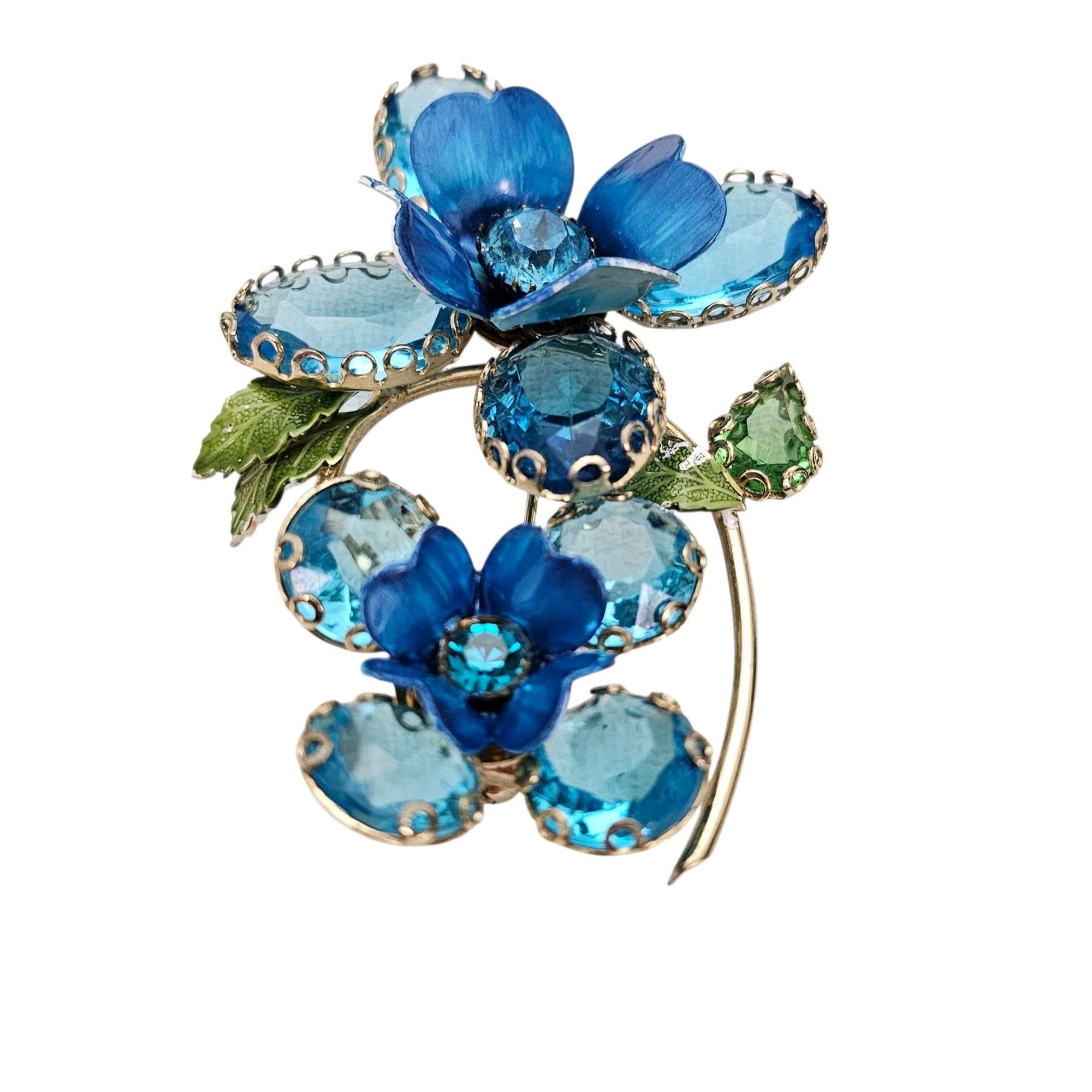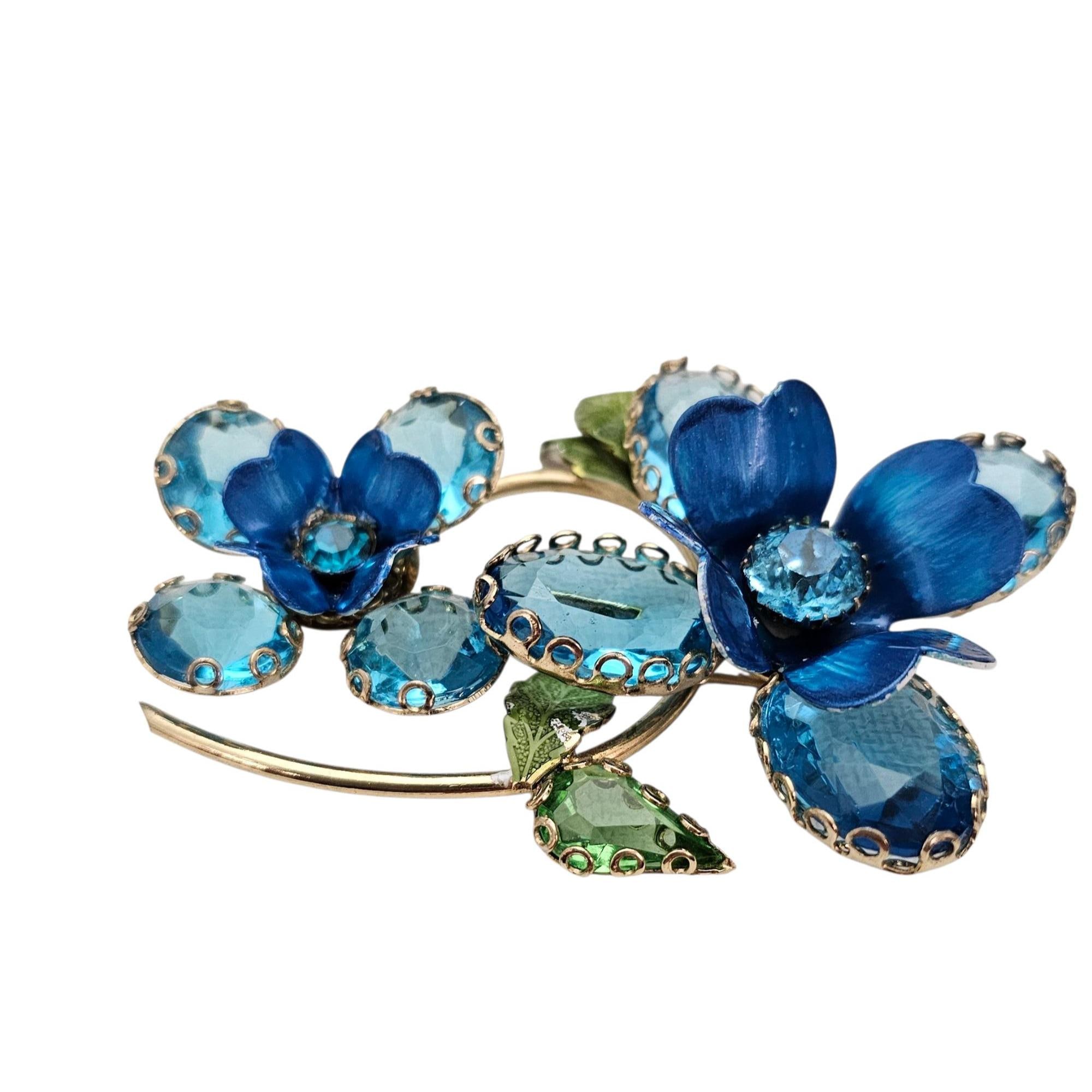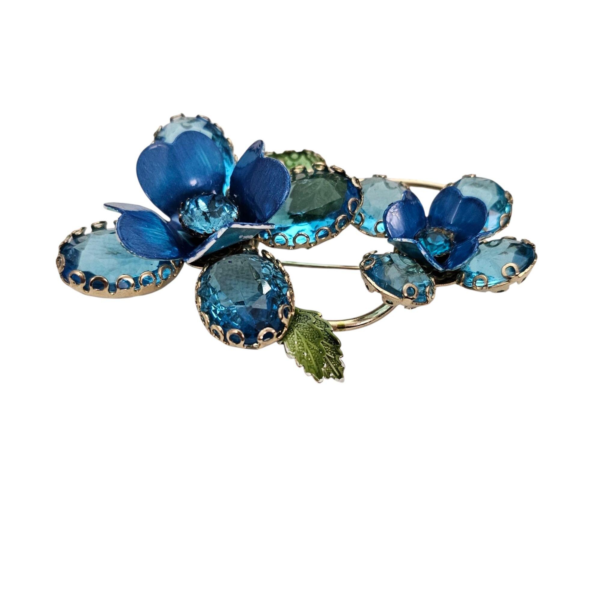 Blue Enamel And Caged Rhinestone Flower Brooch C316