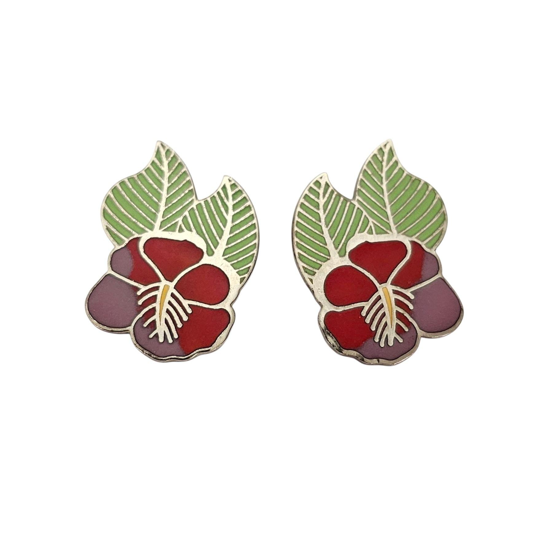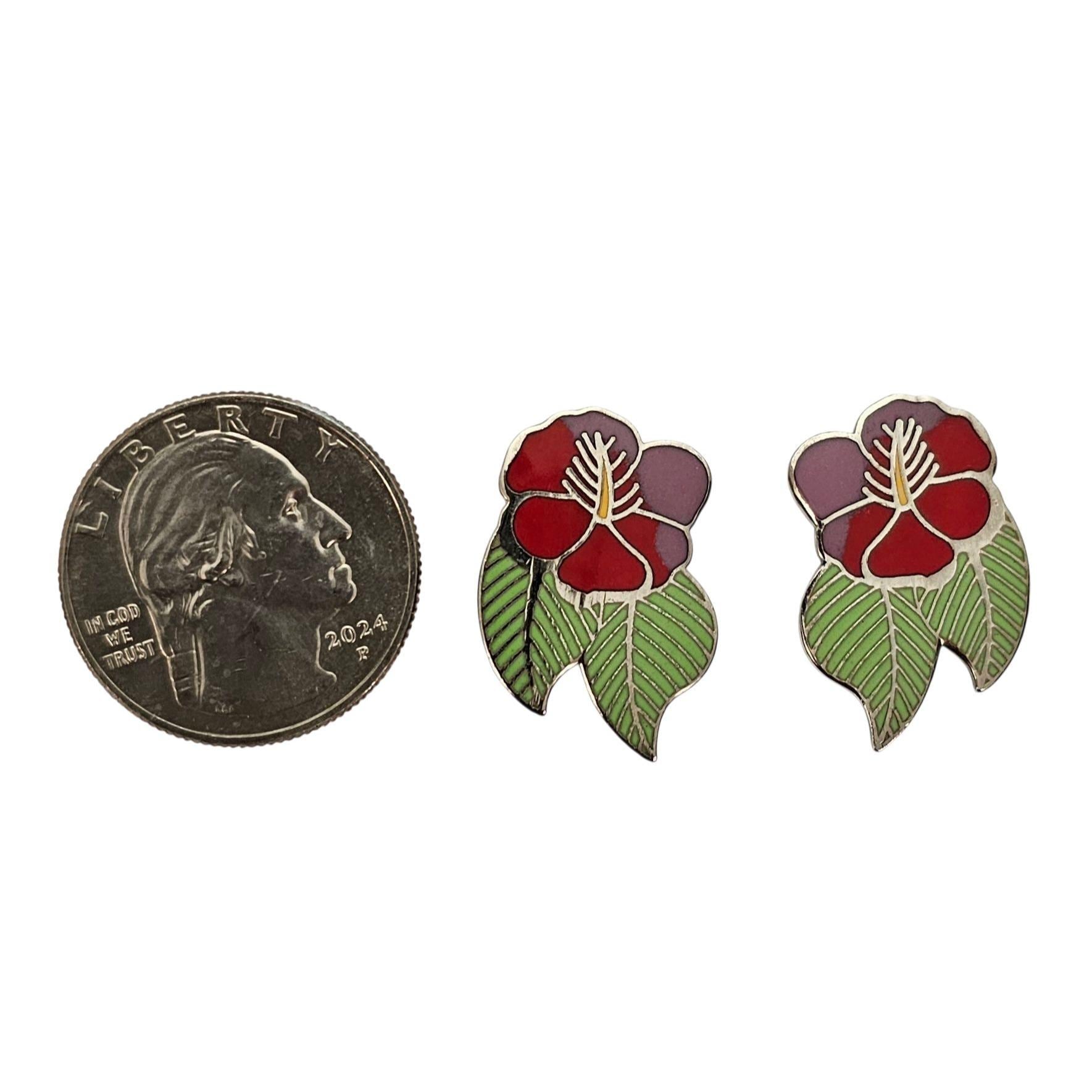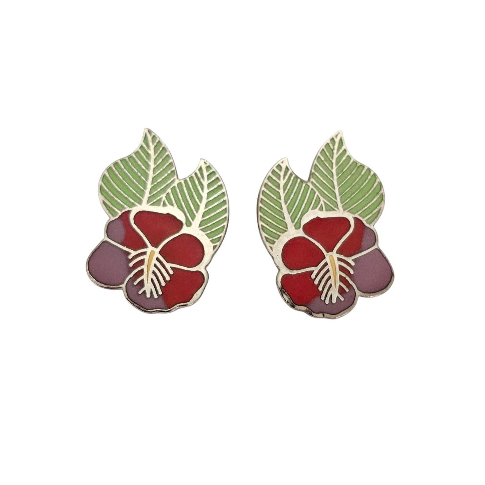 Laurel Burch Hibiscus Purple Red Green Enamel Post Earrings Signed, C311