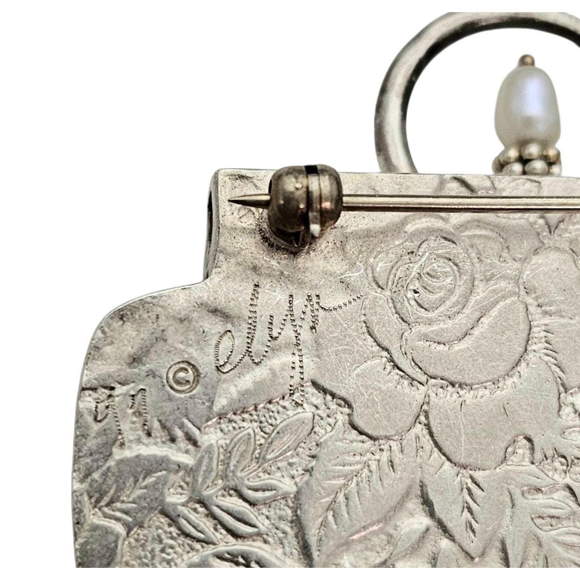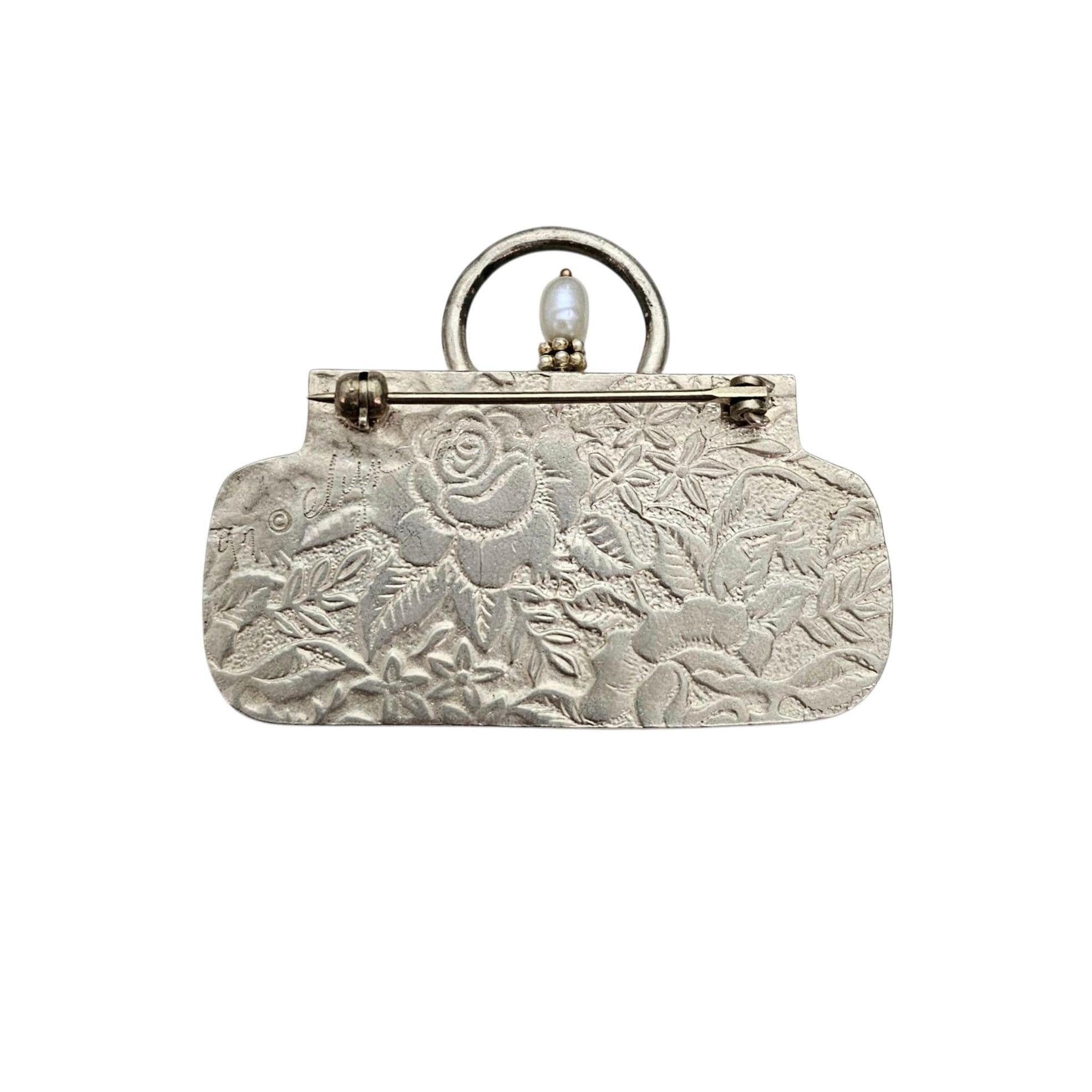 • It features a baroque-shaped pearl, depicting the bag clasp