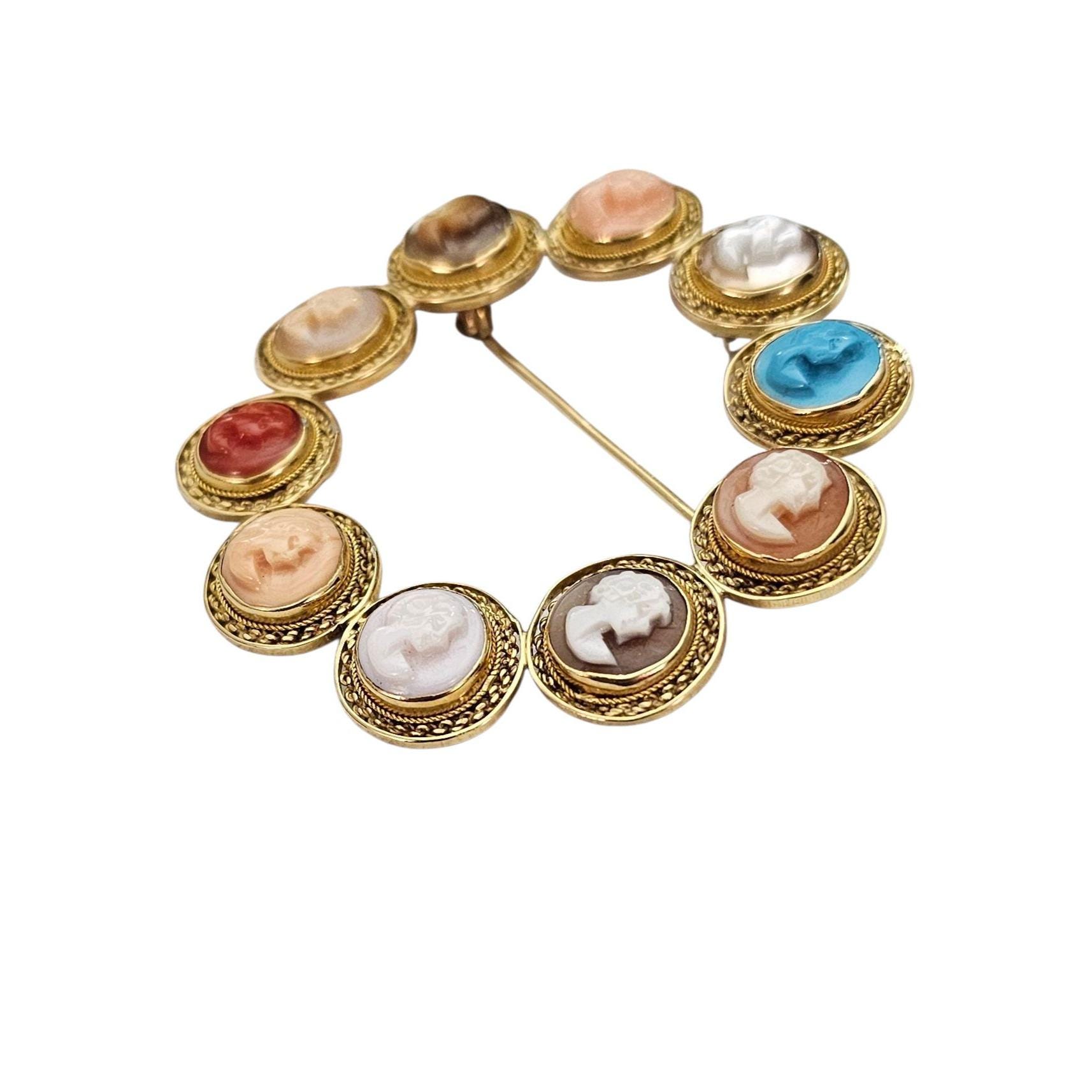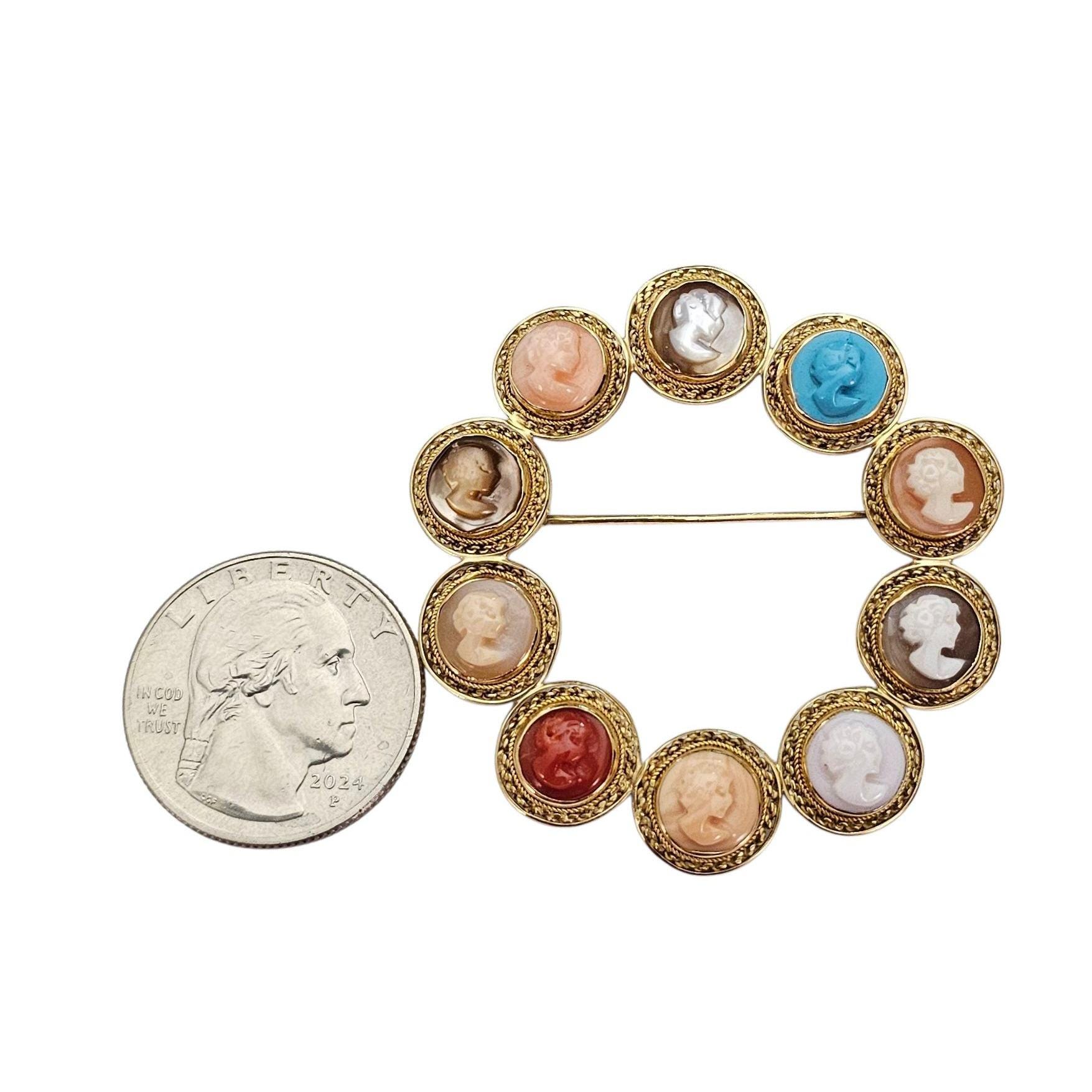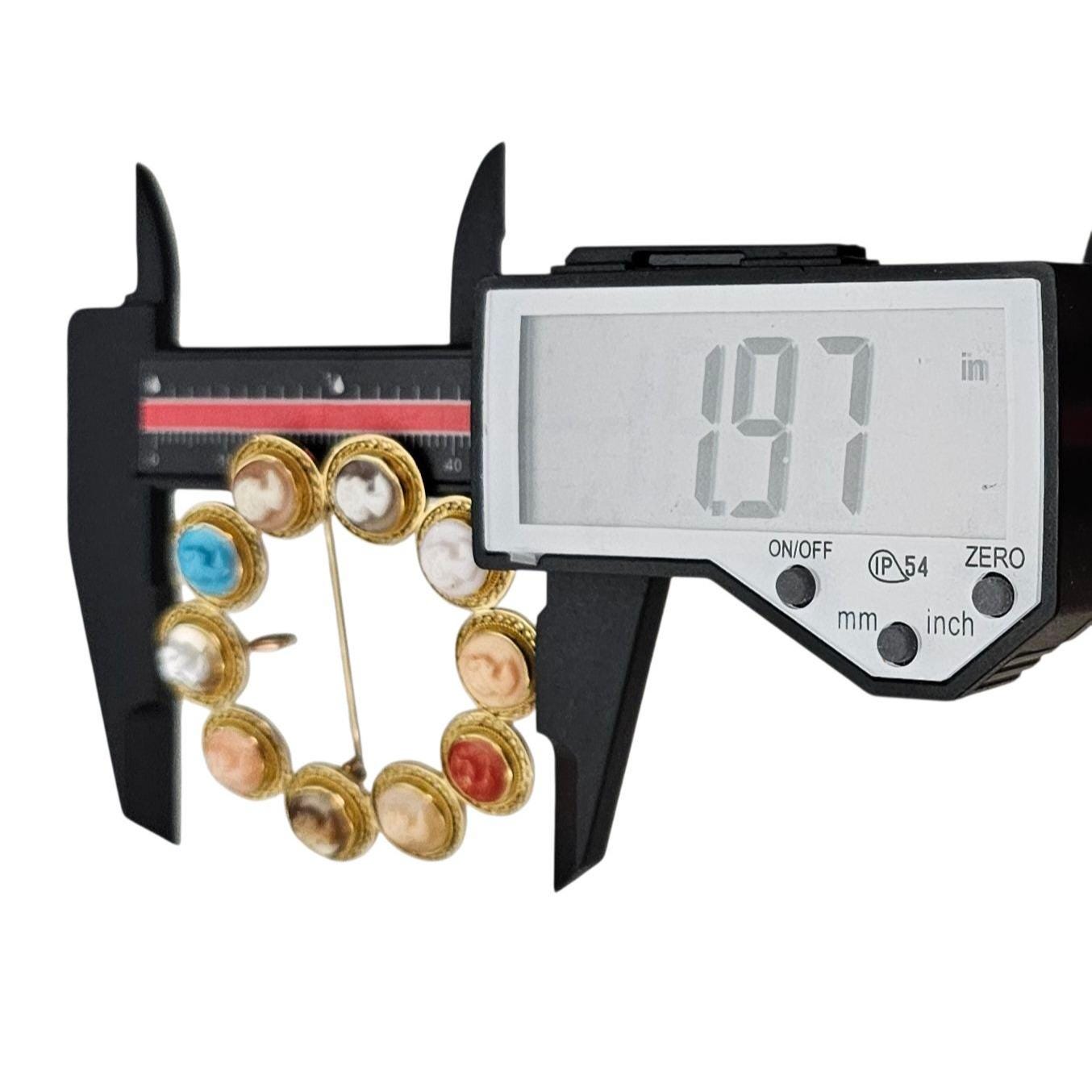 18K Yellow Gold Vintage Shell Coral Multi Cameo Brooch Pendant Round Open Pin C331