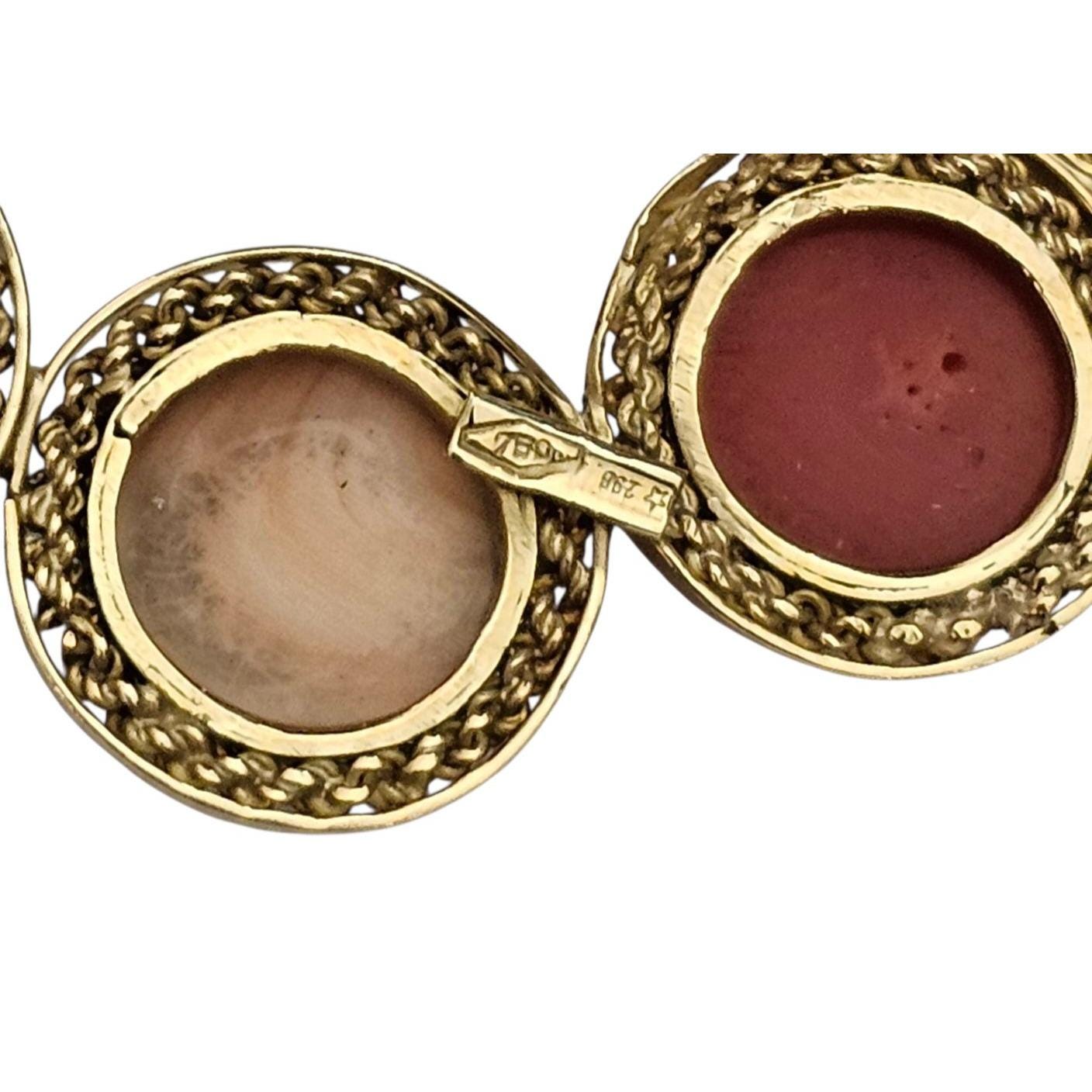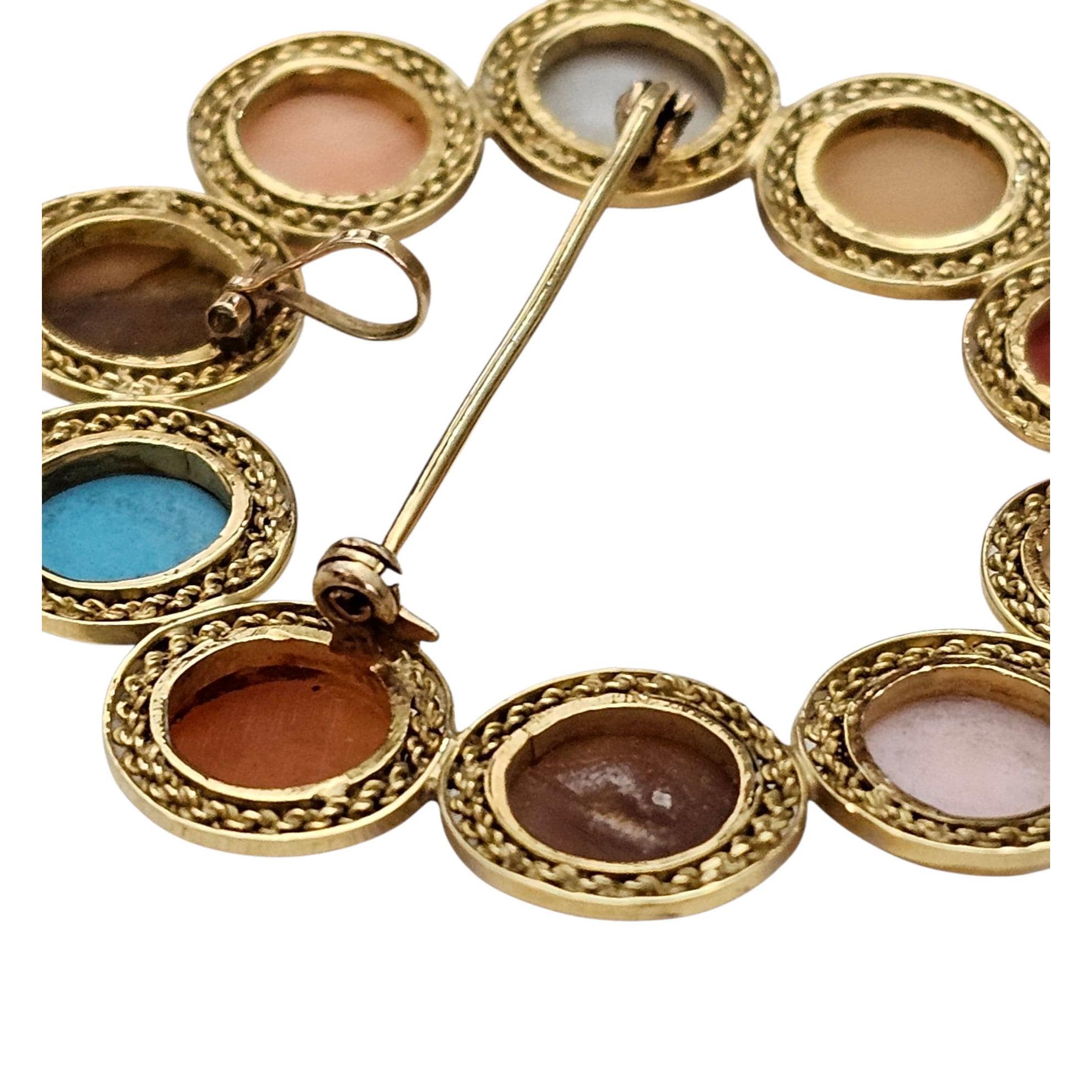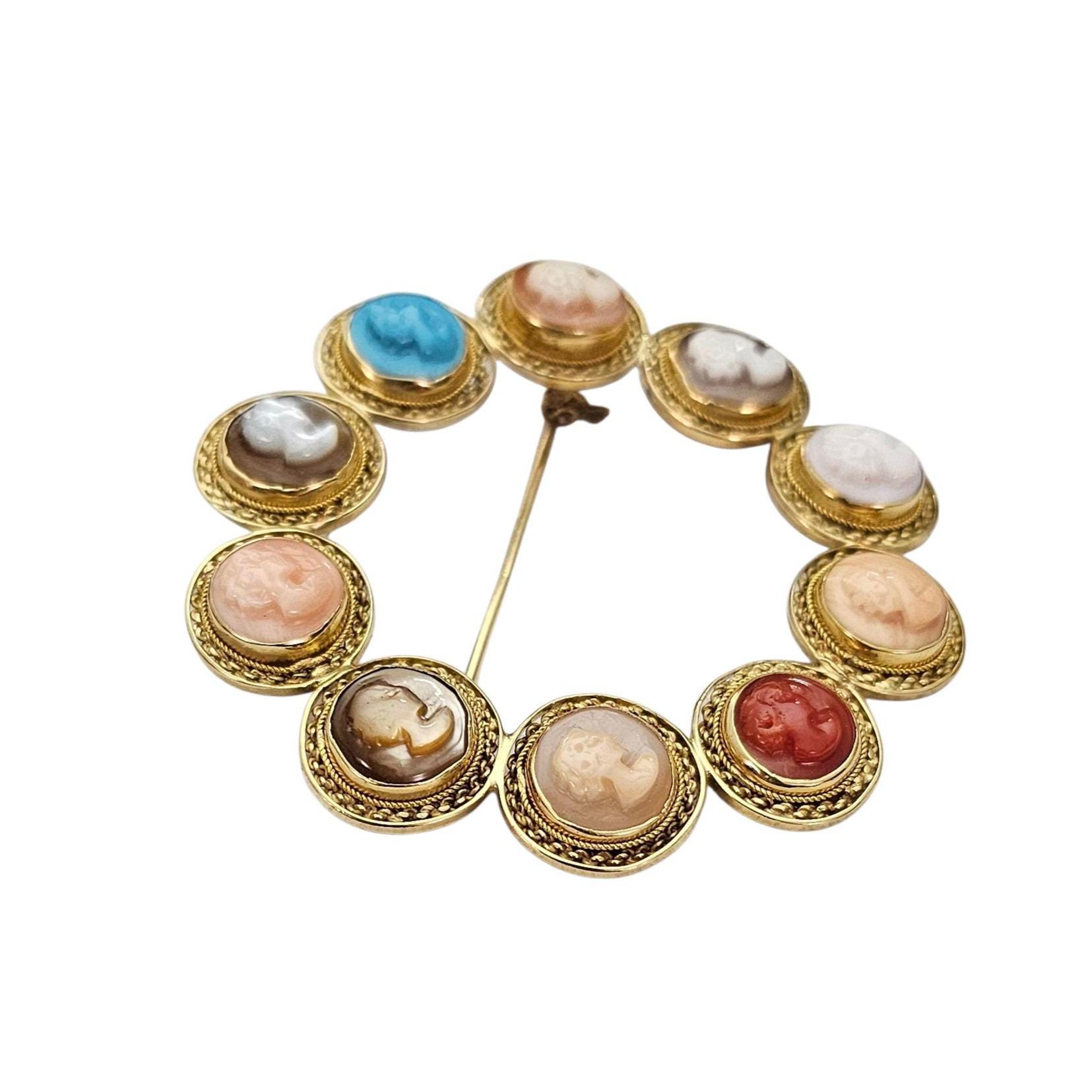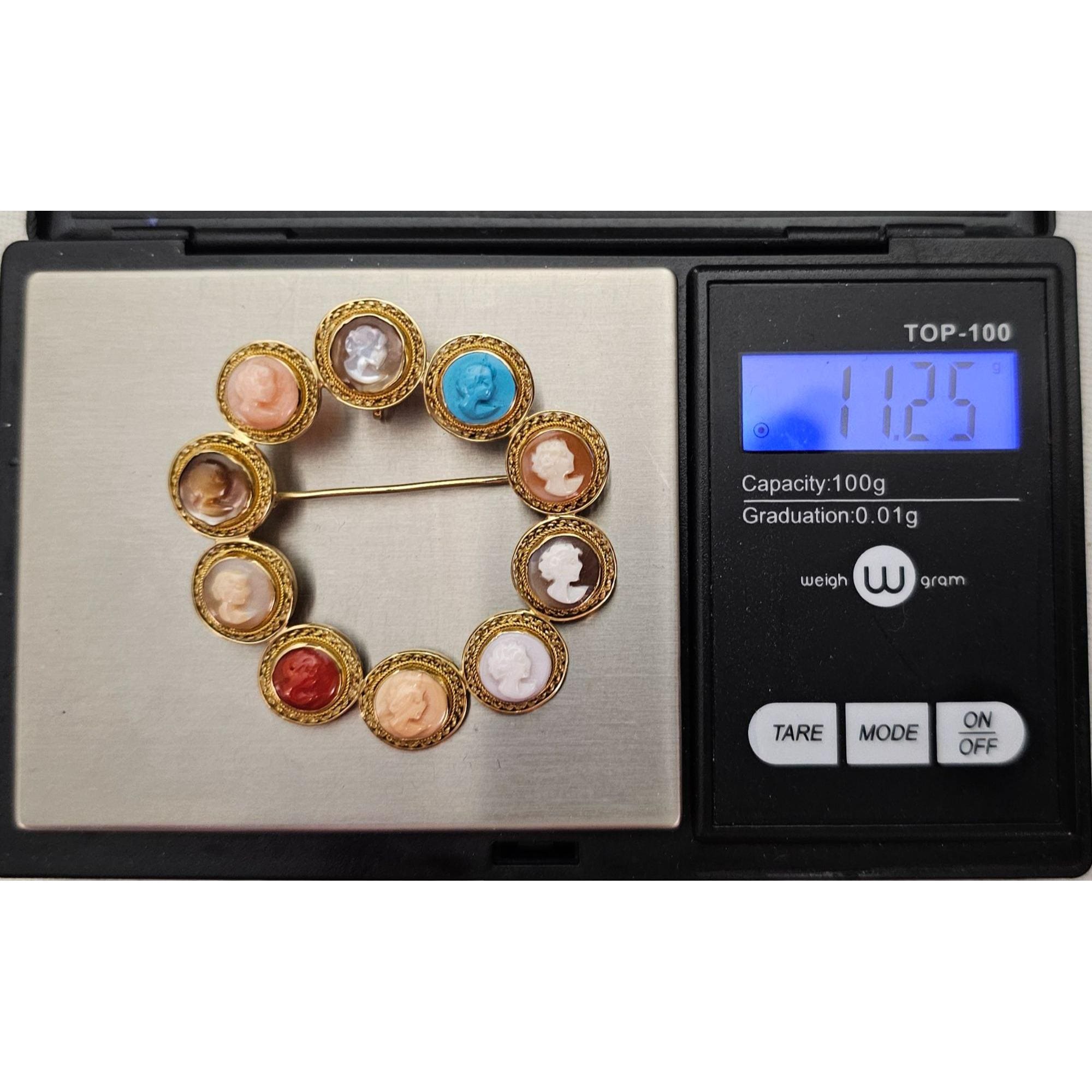 18K Yellow Gold Vintage Shell Coral Multi Cameo Brooch Pendant Round Open Pin C331