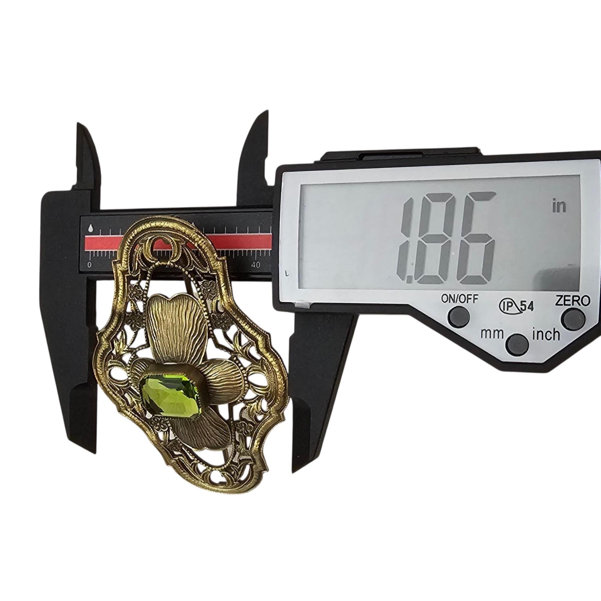 • Faceted emerald-cut green rhinestone centerpiece