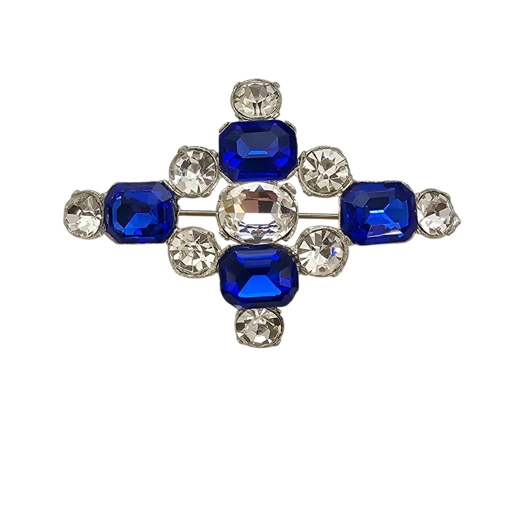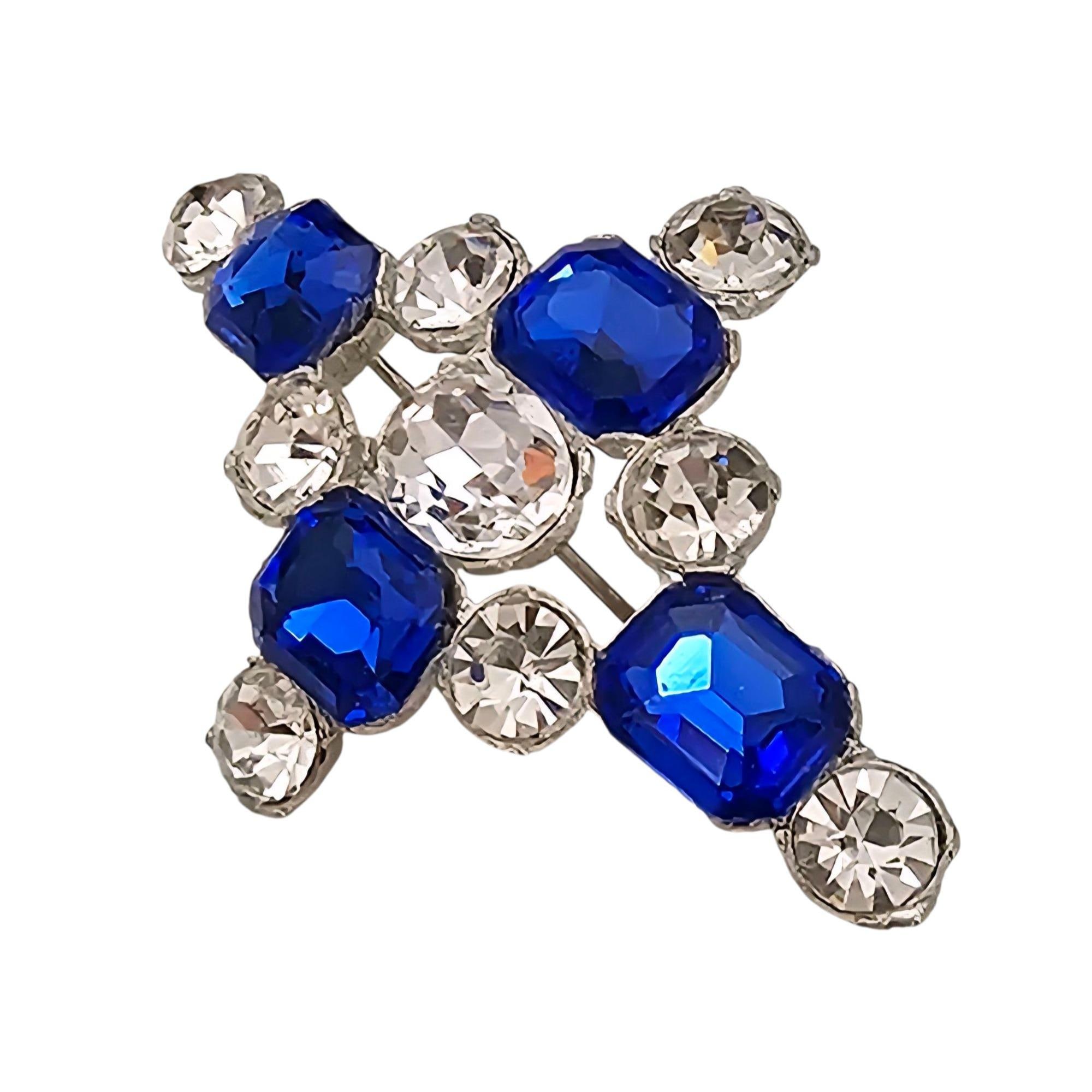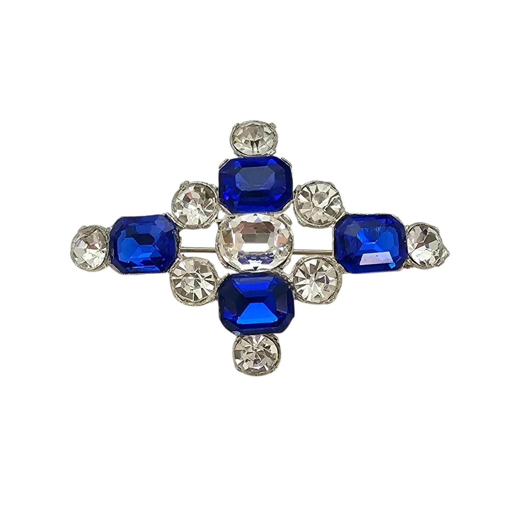 1940s Dark Blue Rhinestone Cross Brooch New Old Stock Pot Metal Pin C364