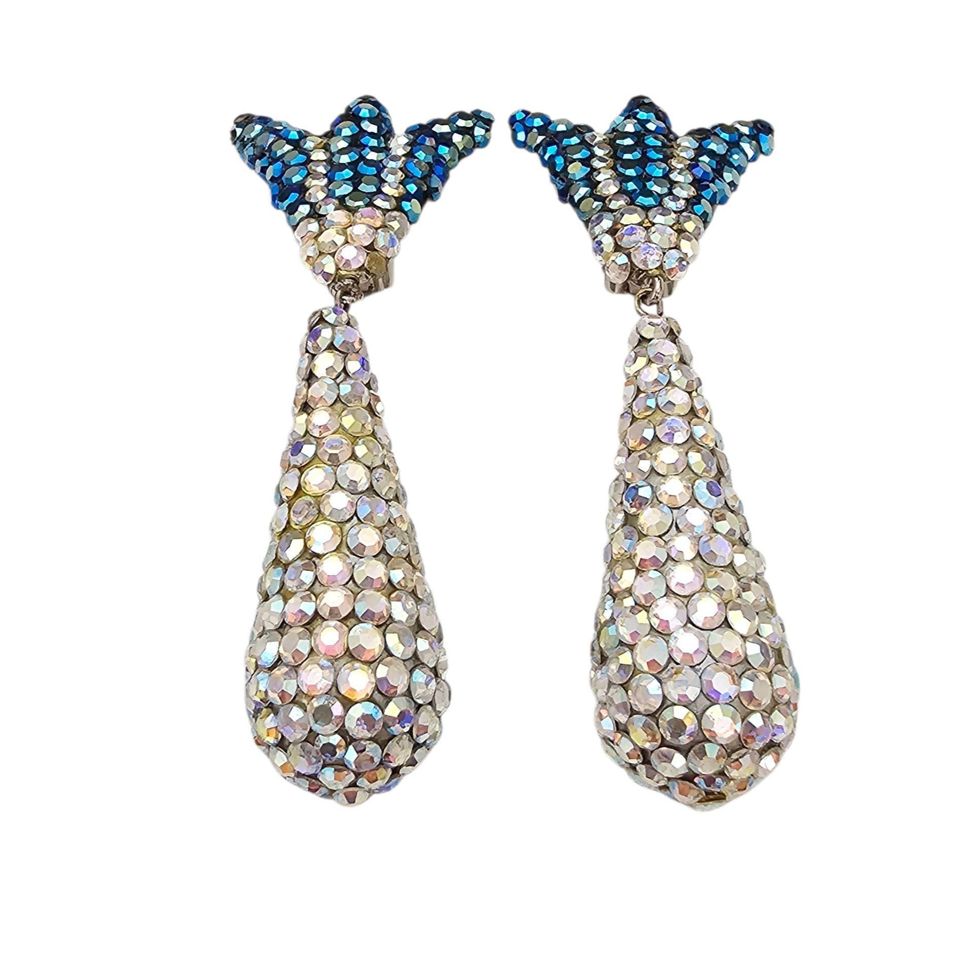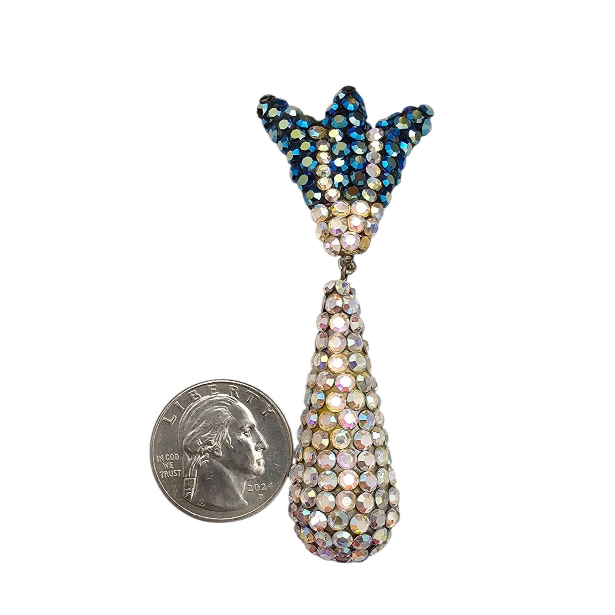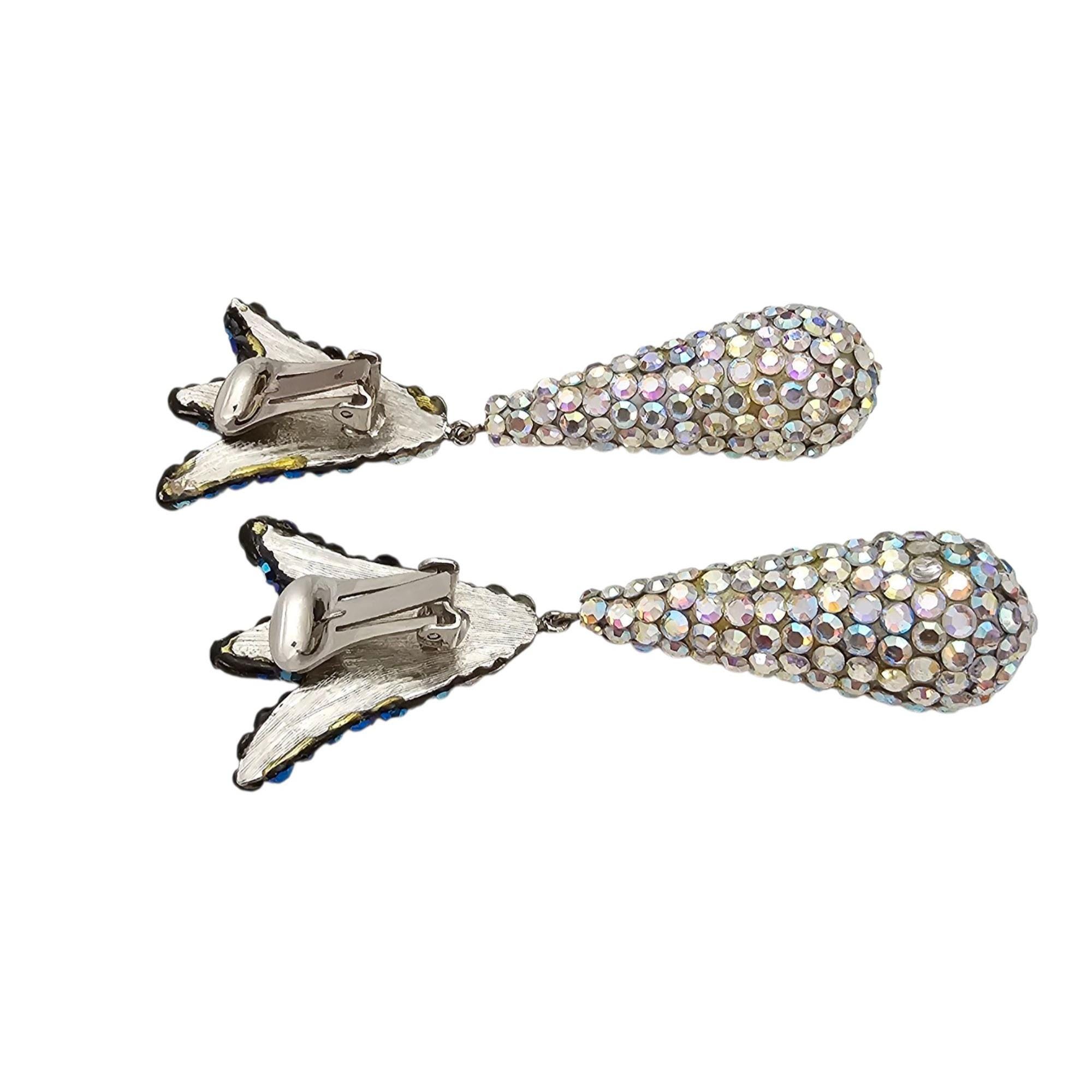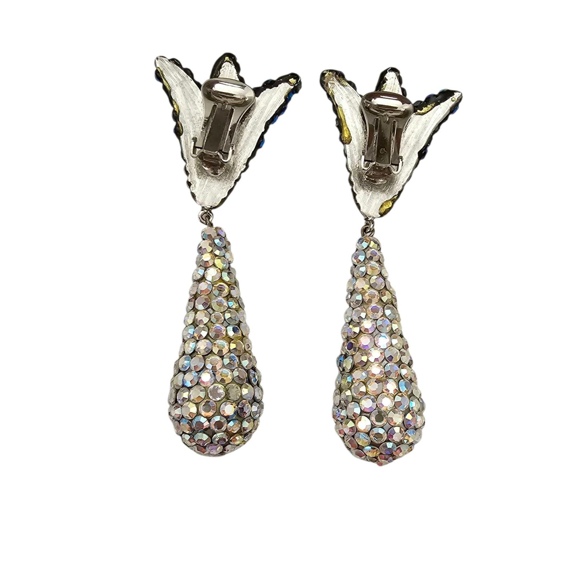 Blue AB Rhinestone Clip-On Earrings, Long Drop Dangles C366