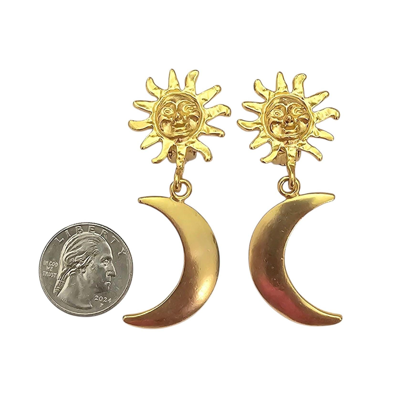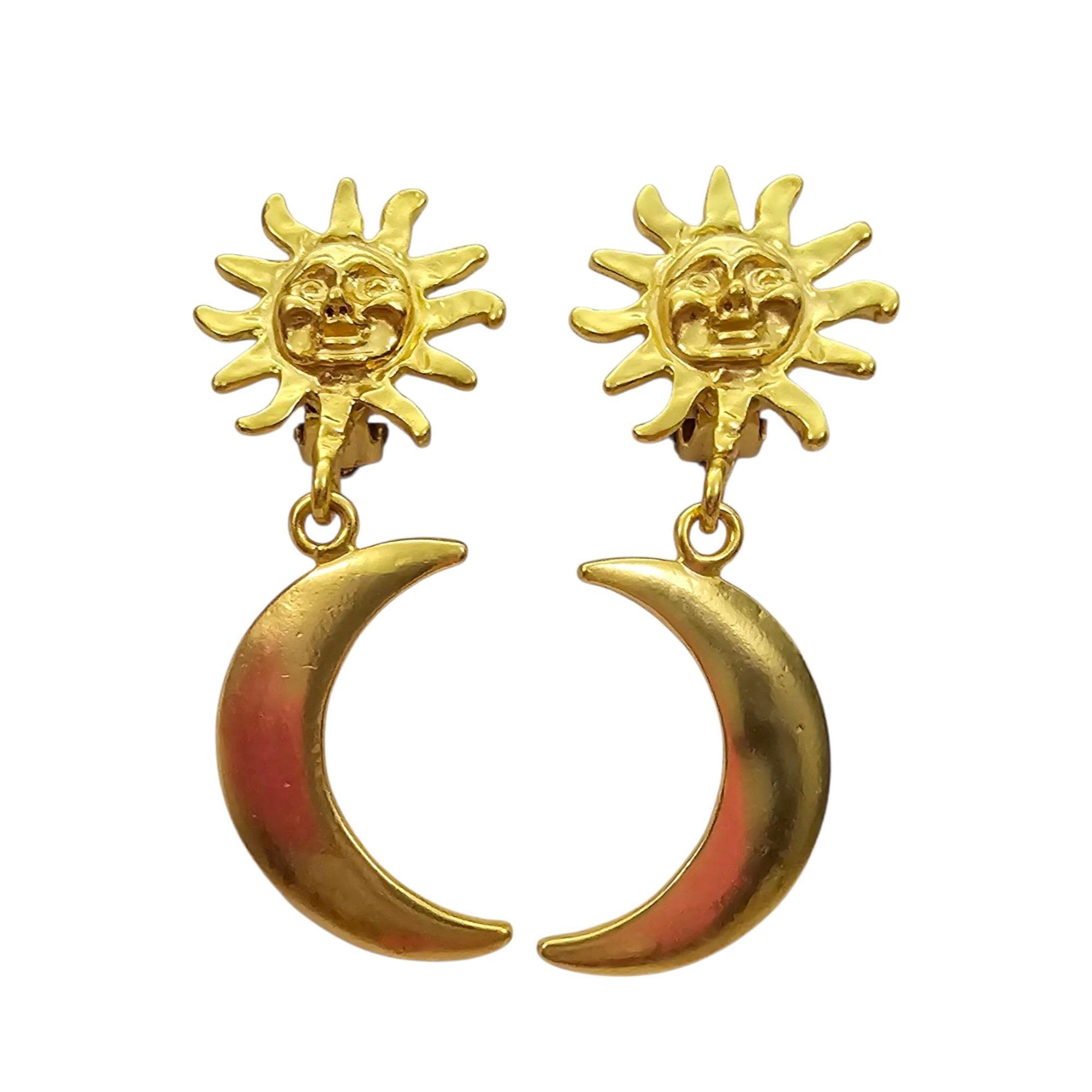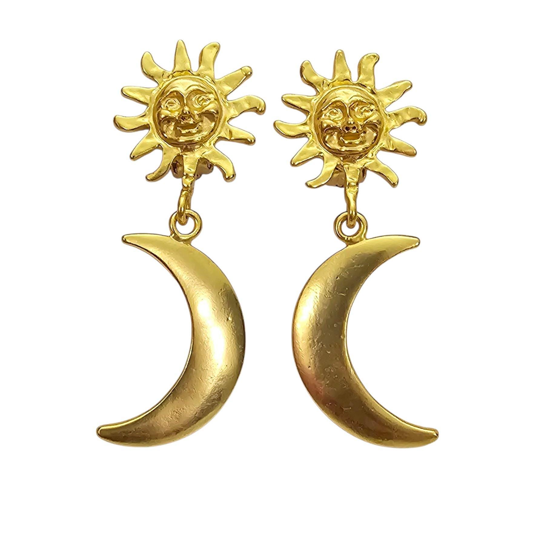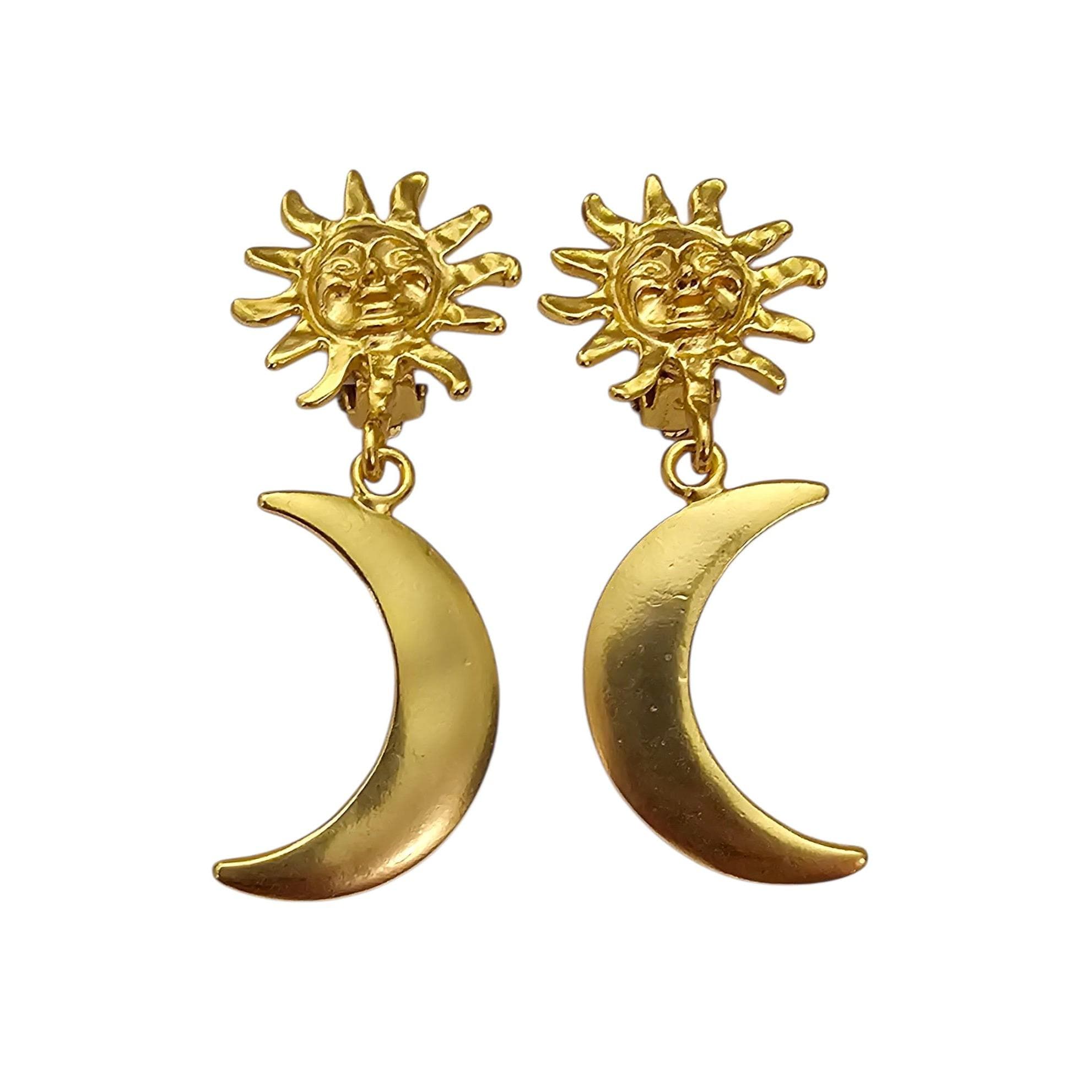Sun Crescent Moon Gold Tone Clip On Dangle Earrings C375