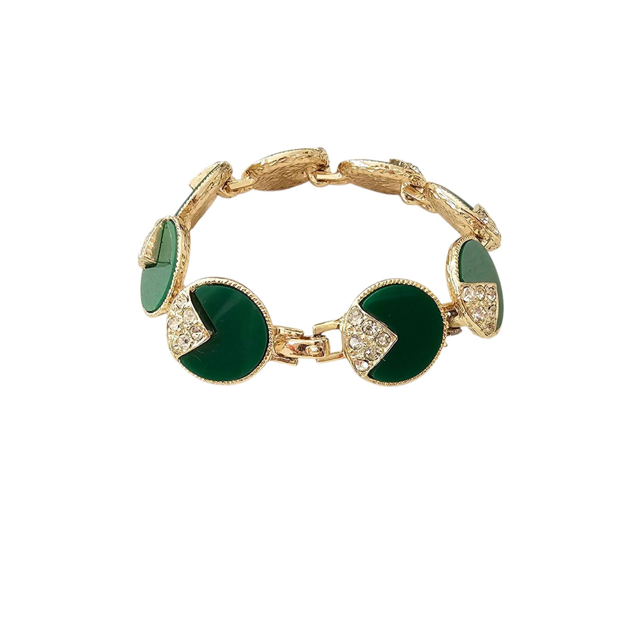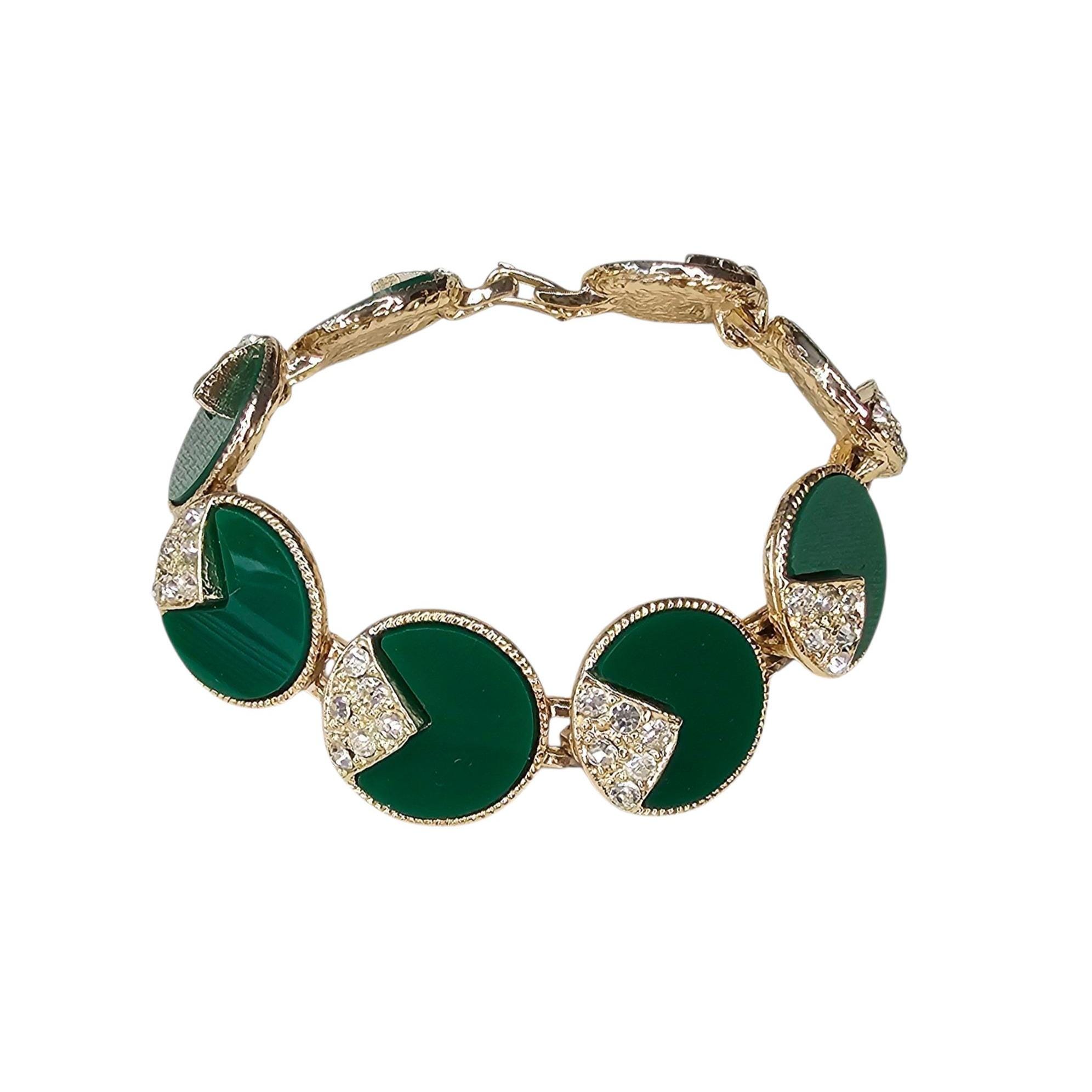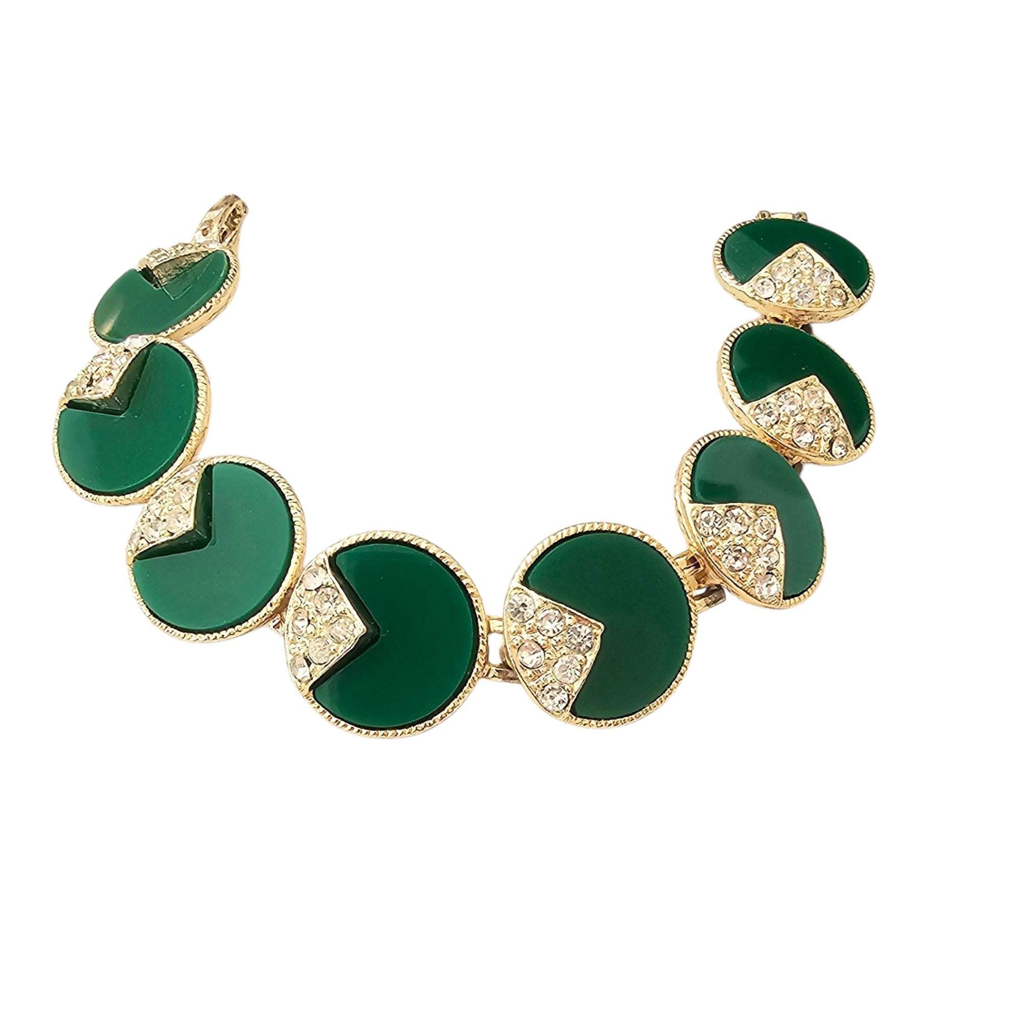 Gold Tone Clear Rhinestone Green Inlay Vintage Mid Century Link Bracelet C379