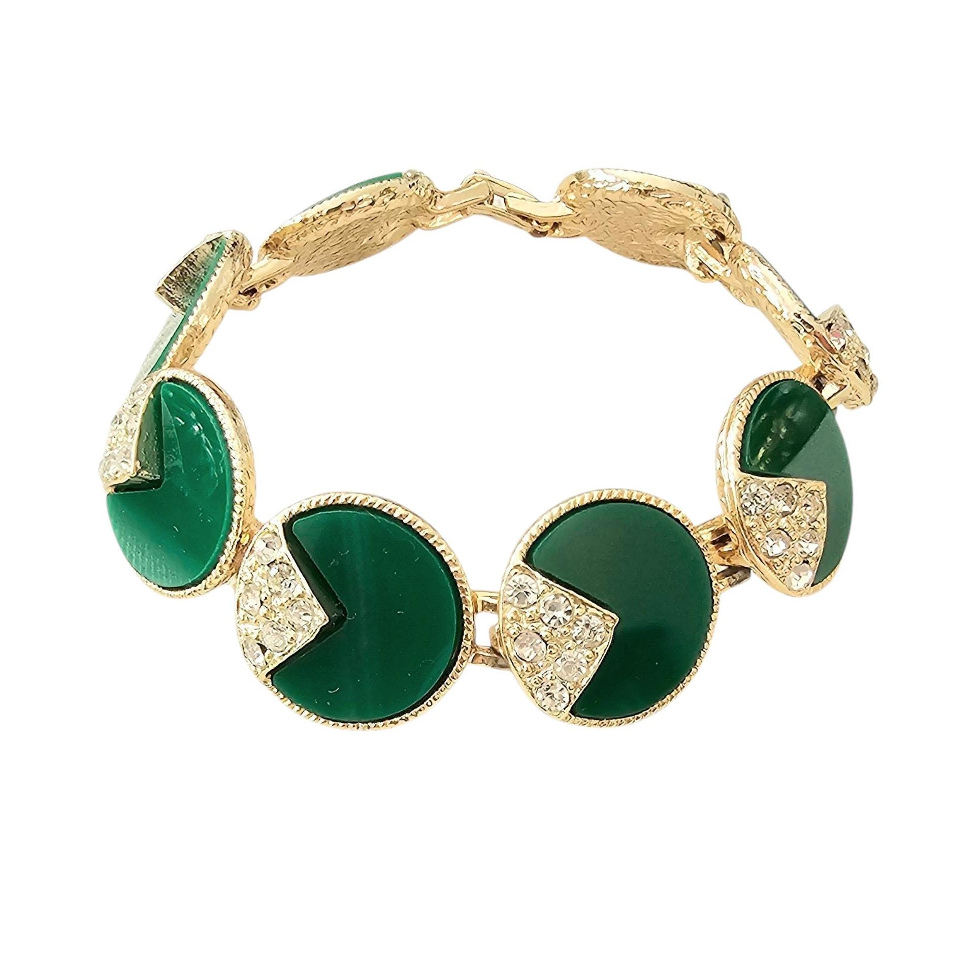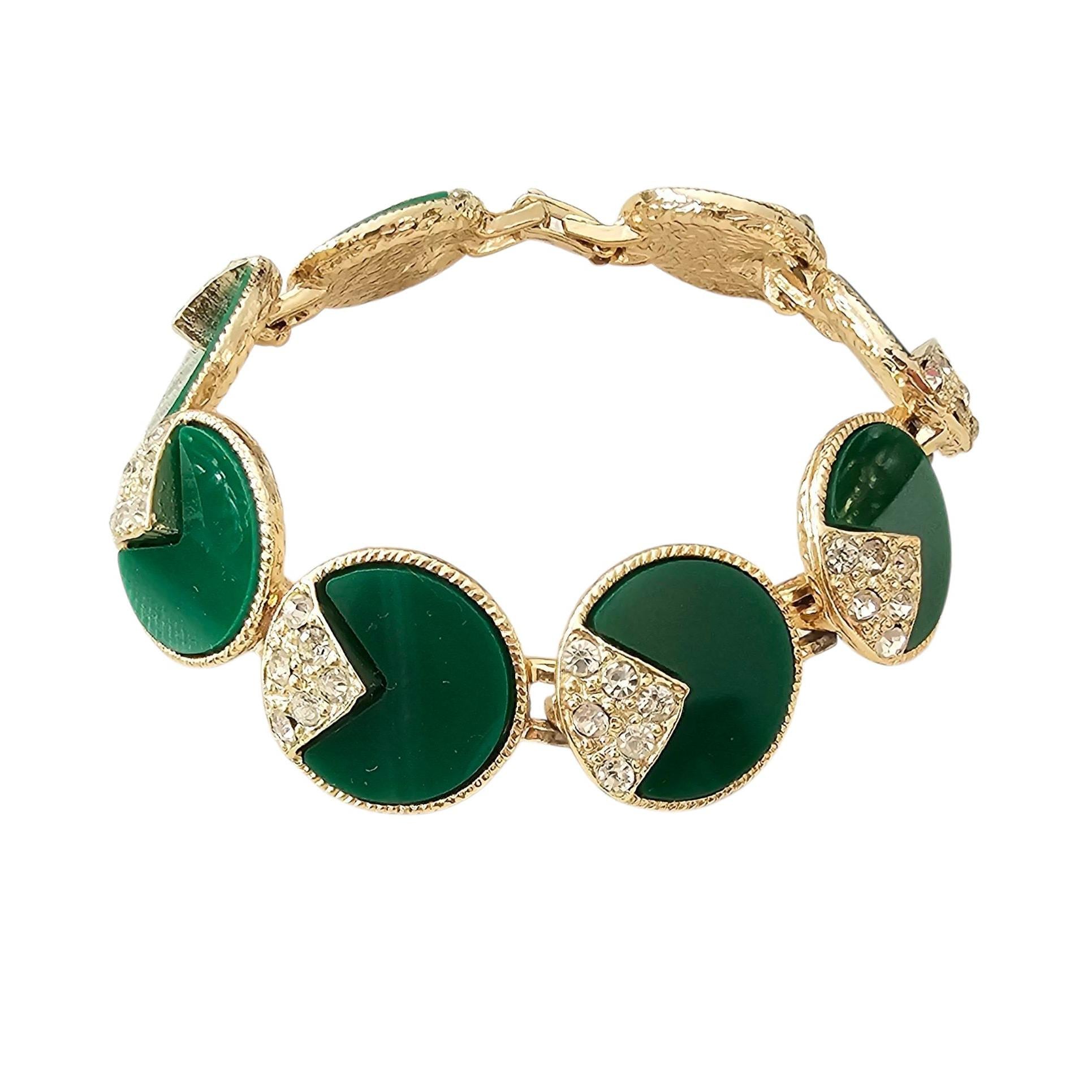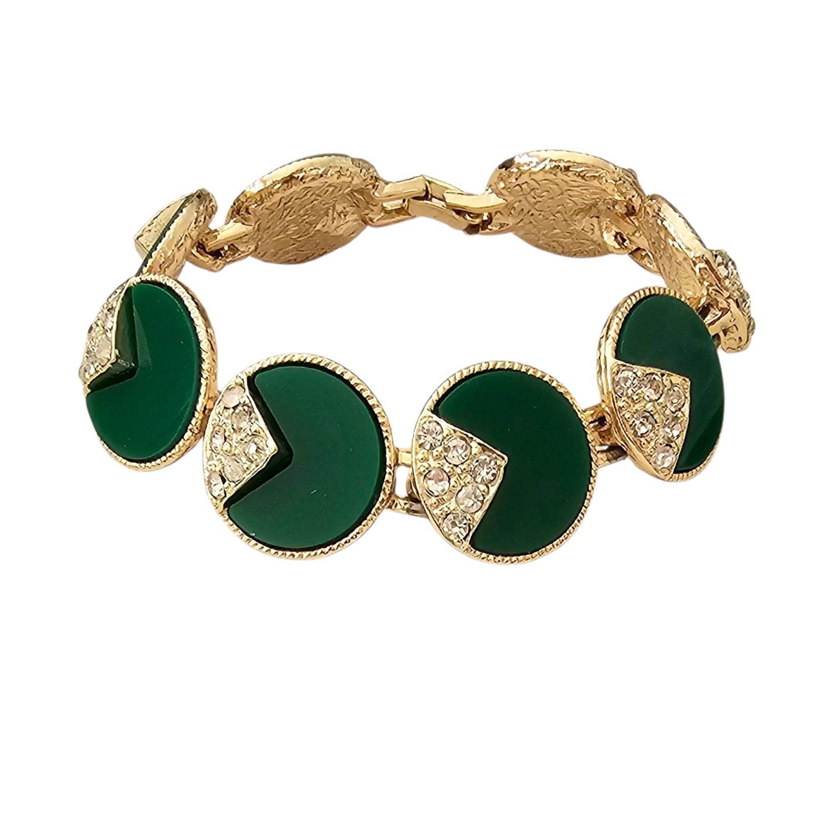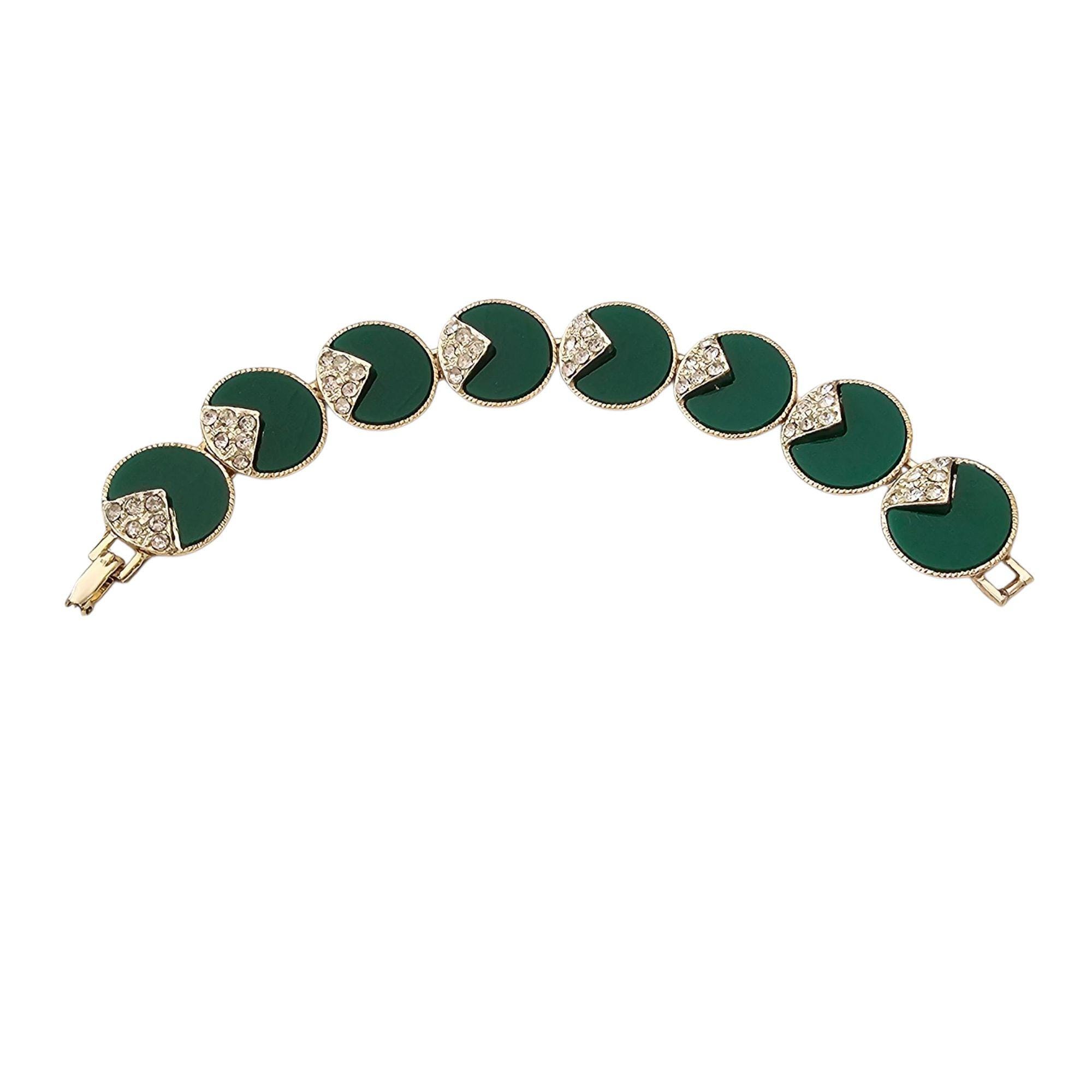 Gold Tone Clear Rhinestone Green Inlay Vintage Mid Century Link Bracelet C379