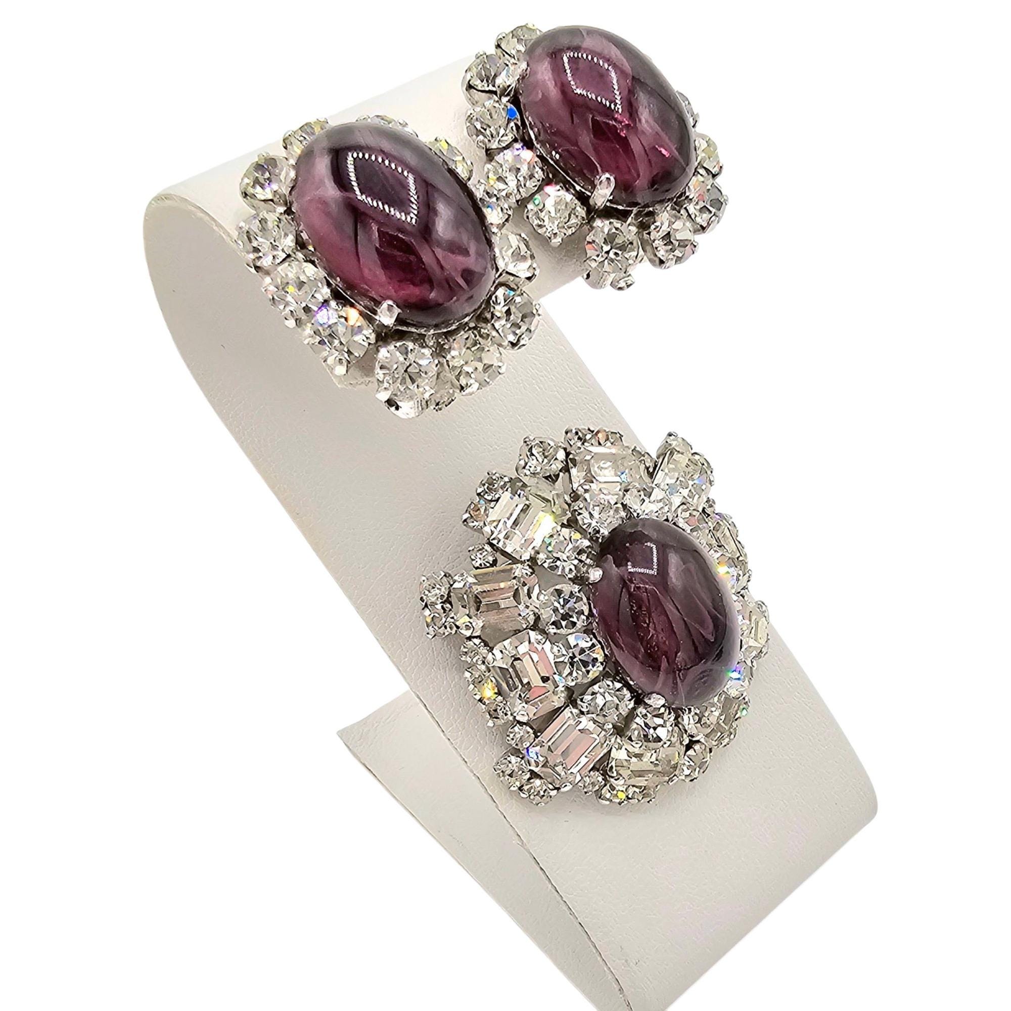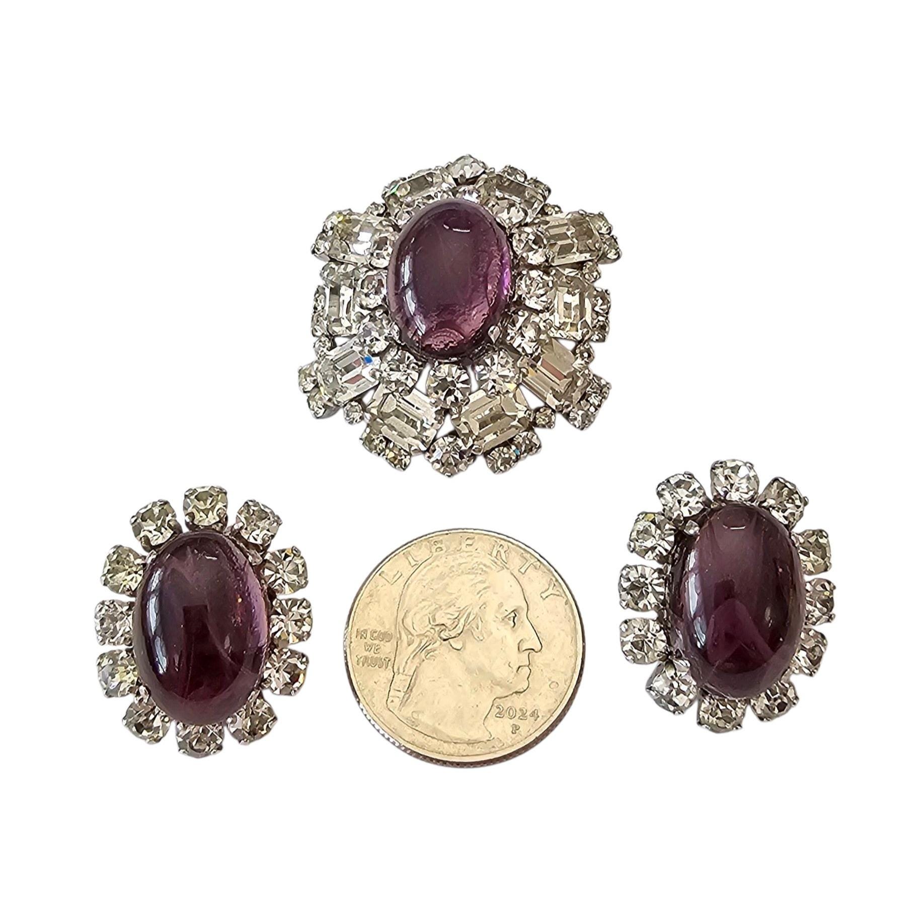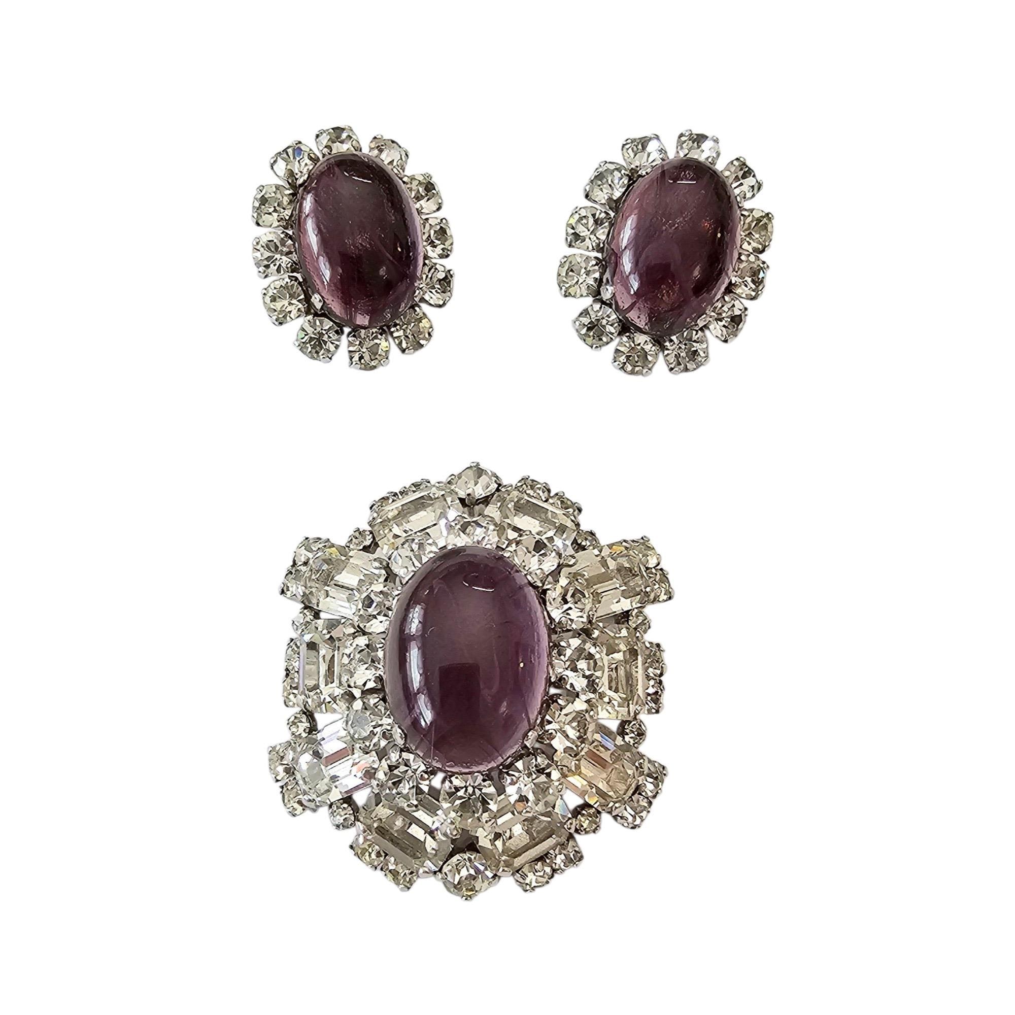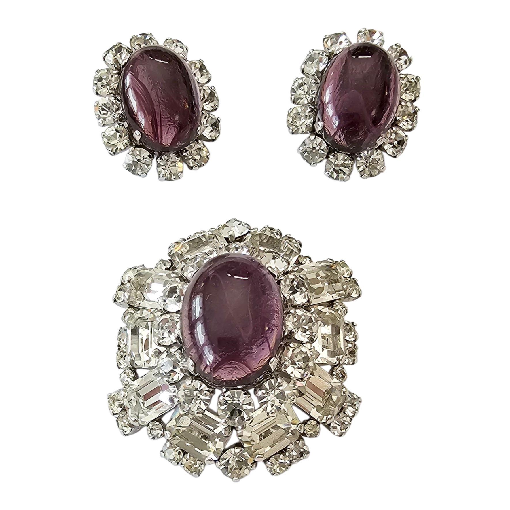 Christian Dior Oval Purple Flawed Glass Brooch, Clip On Earrings 1964 Set C479