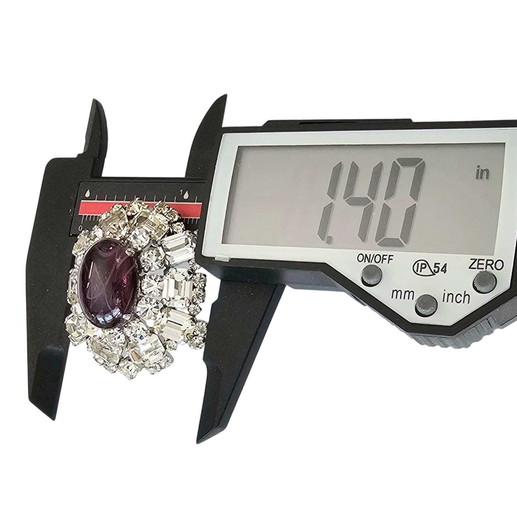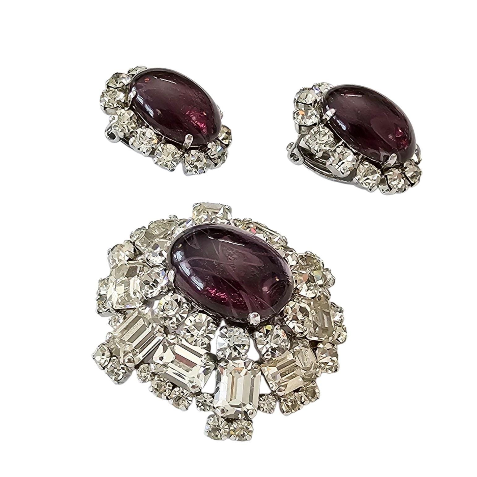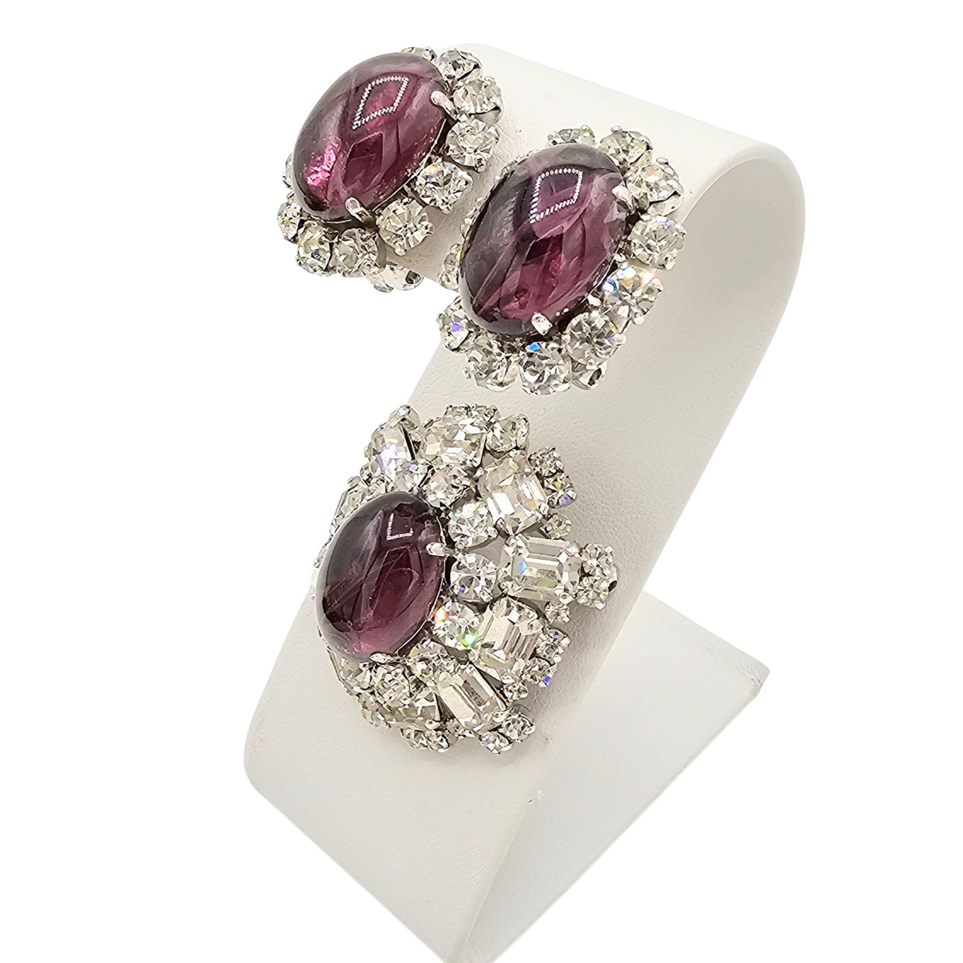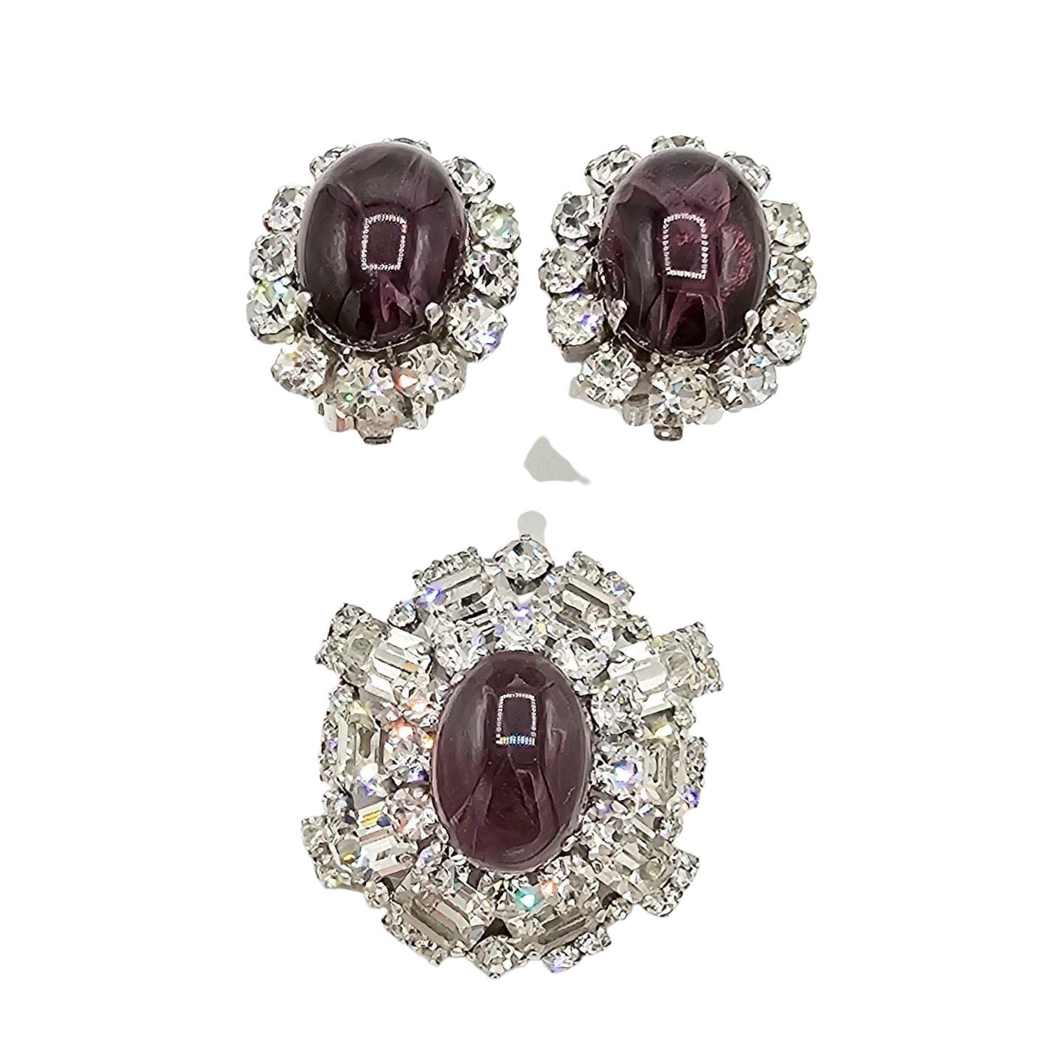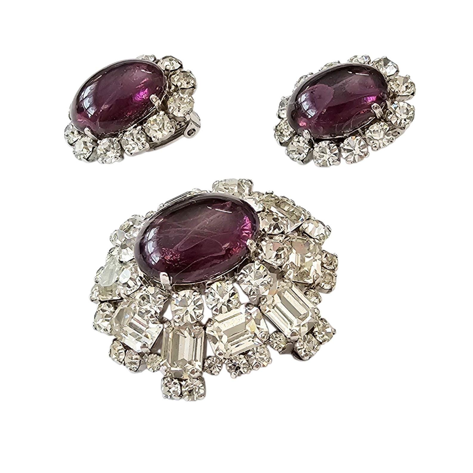 Christian Dior Oval Purple Flawed Glass Brooch, Clip On Earrings 1964 Set C479