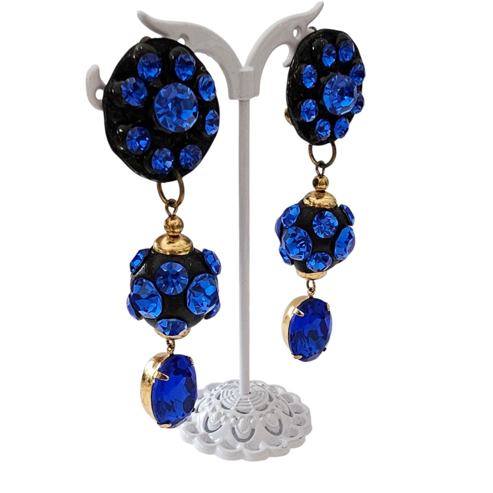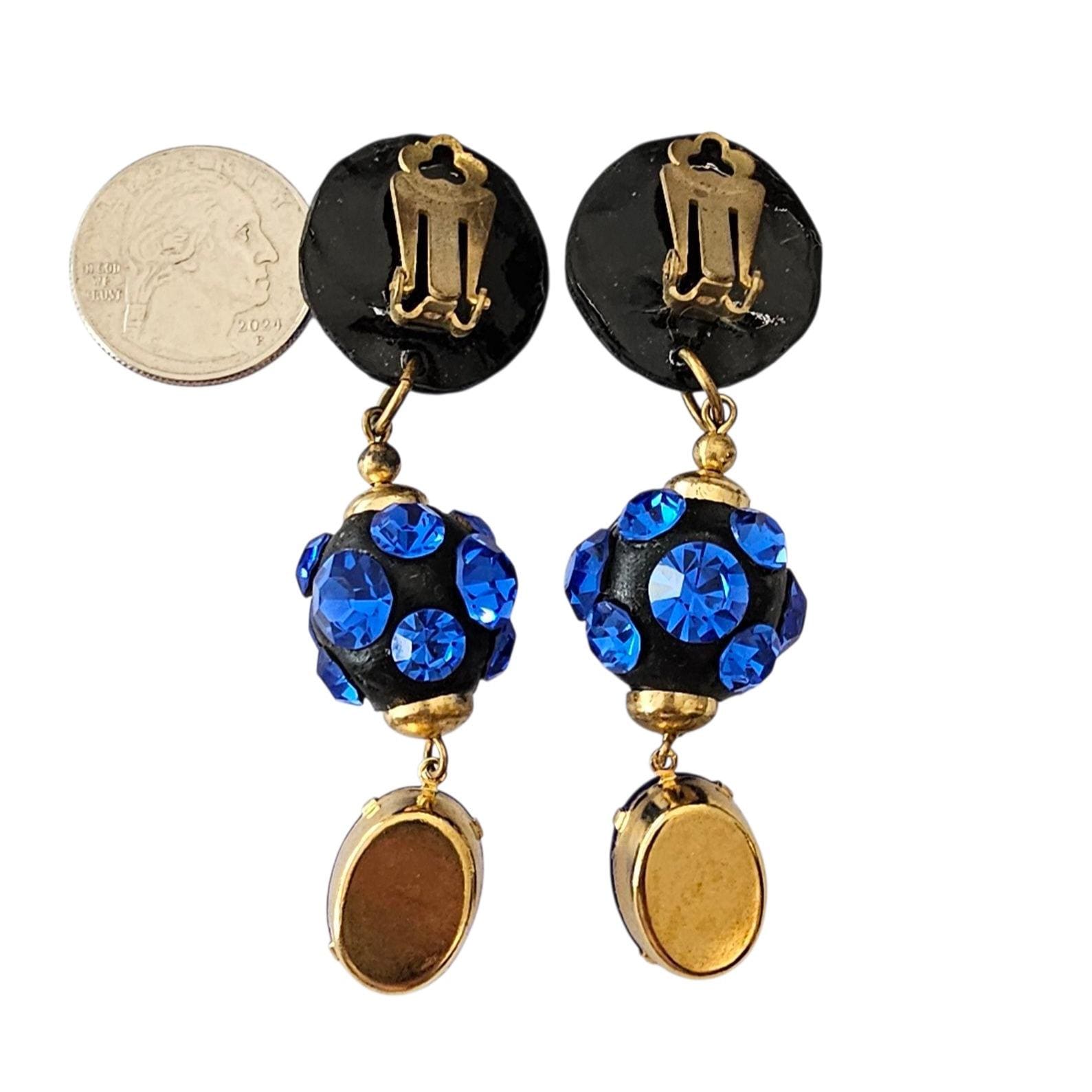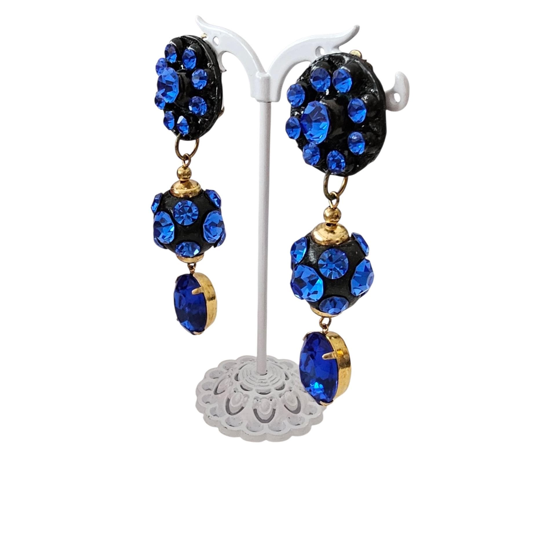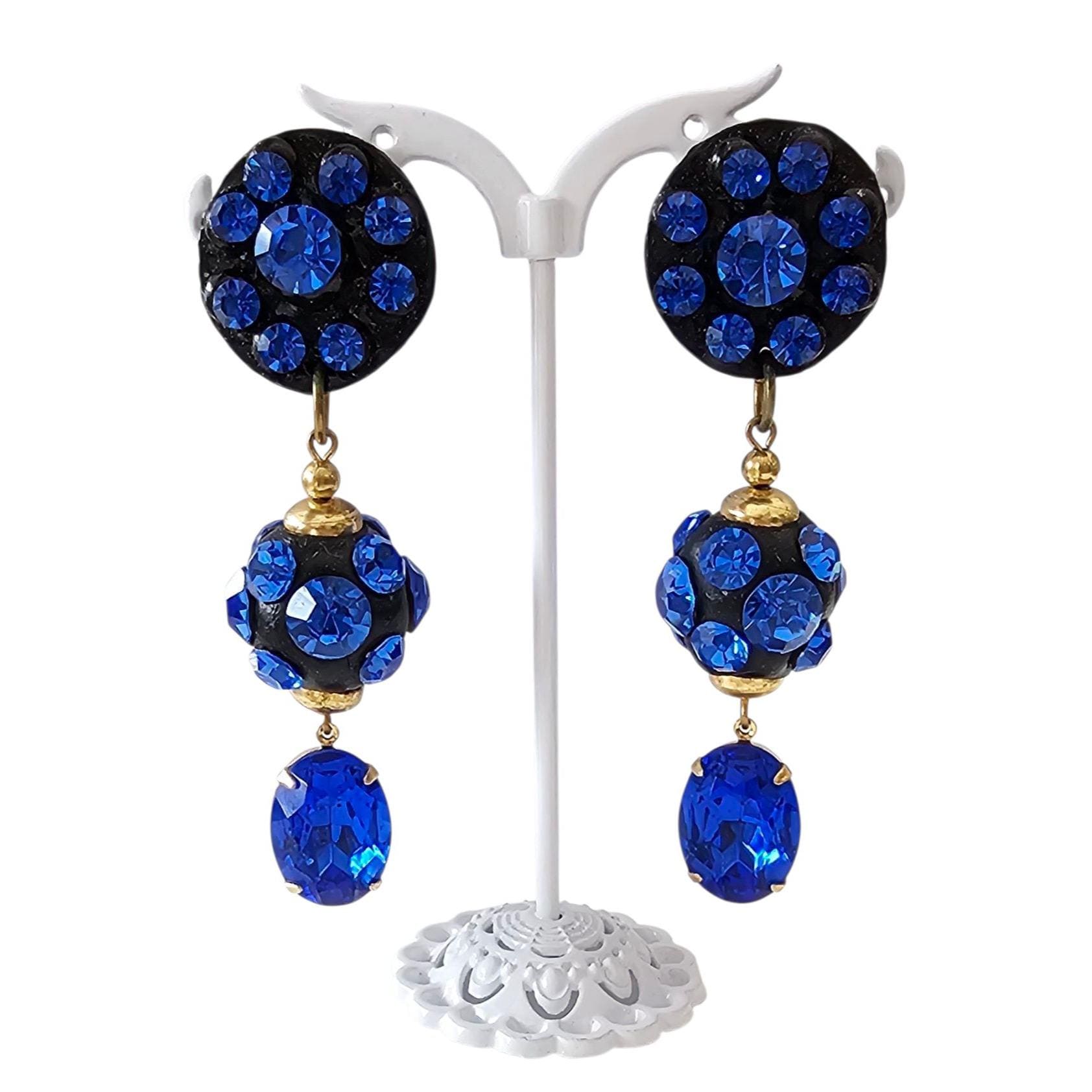 Vintage Blue Clip-On Rhinestone Ball Statement Dangle Earrings, C473
