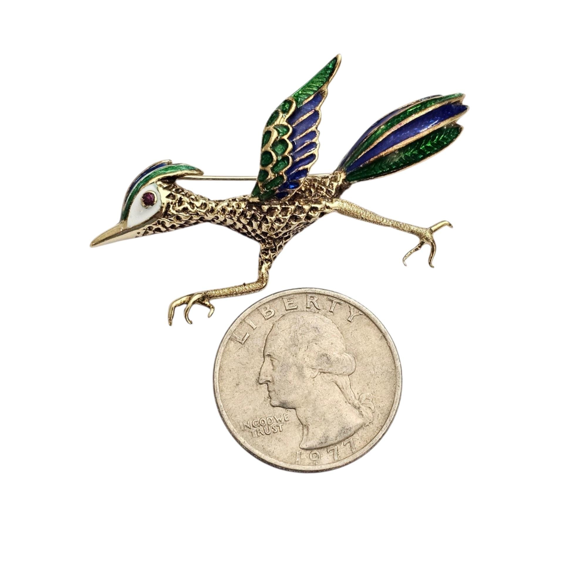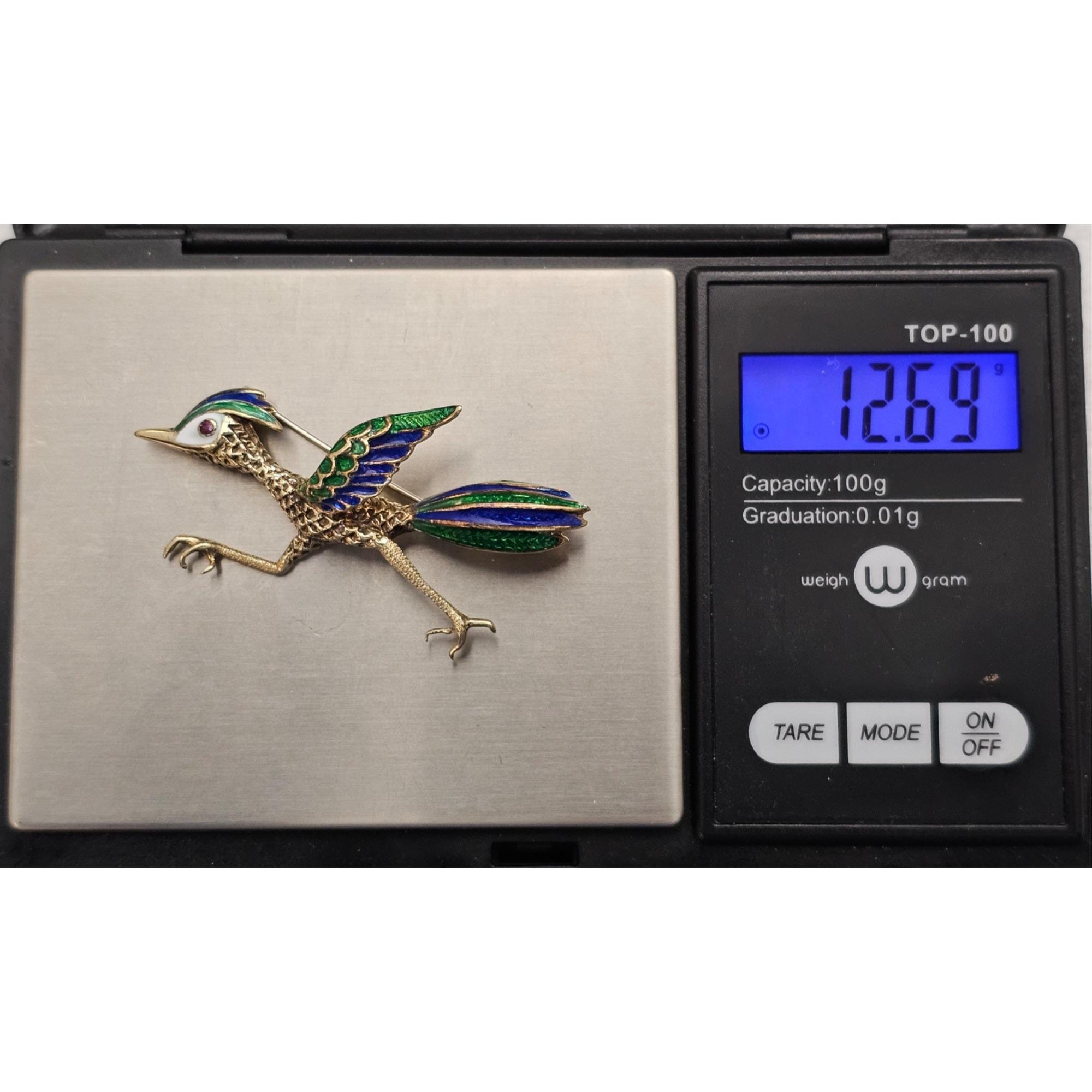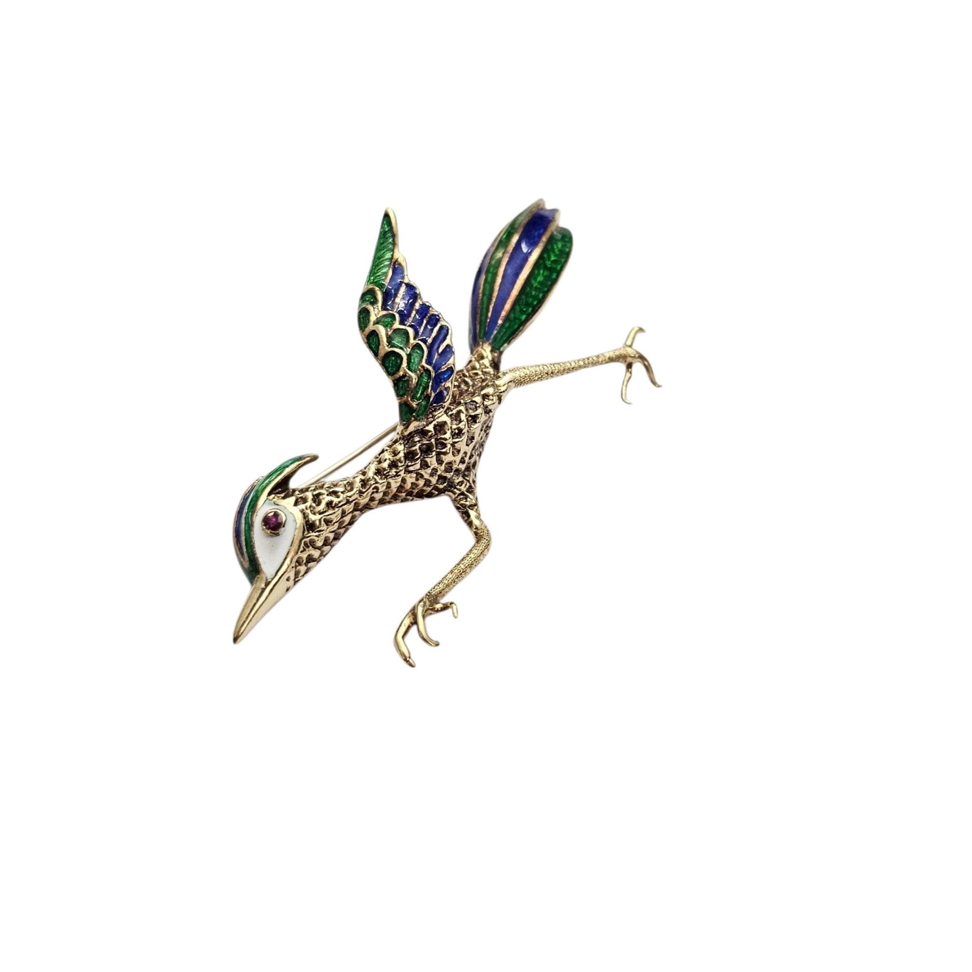 14K Gold Martine Road Runner Brooch Ruby Eye Blue Green Enamel Bird Pin Signed C481