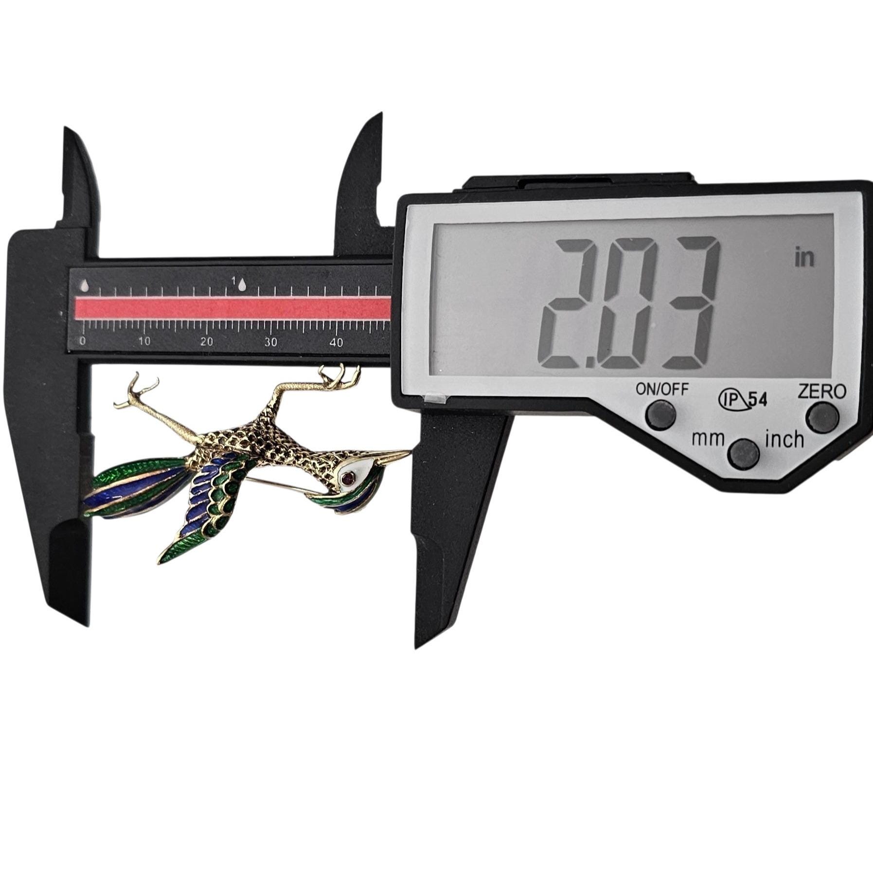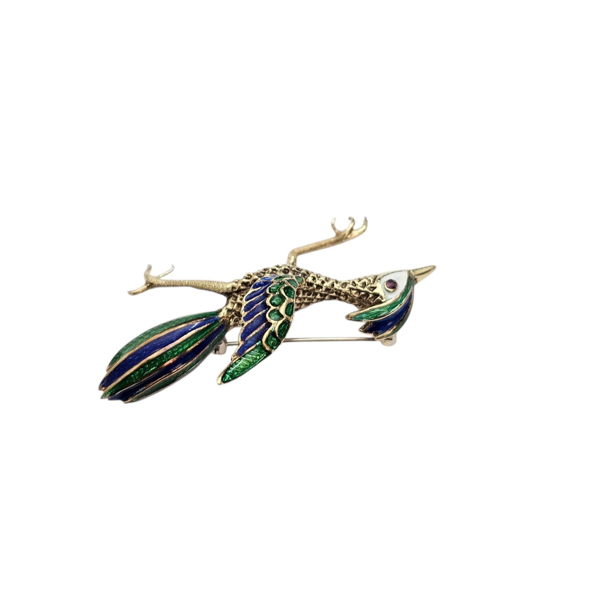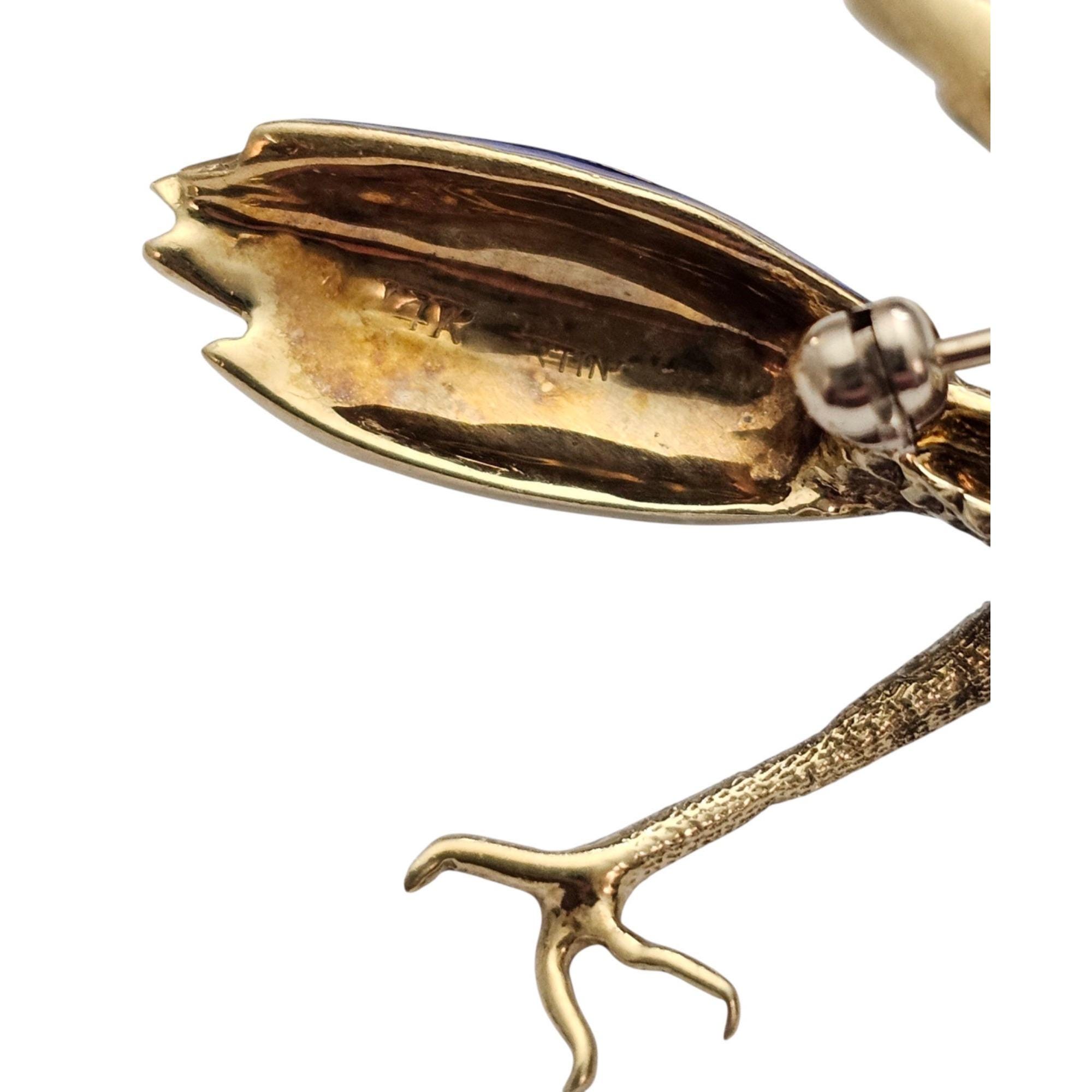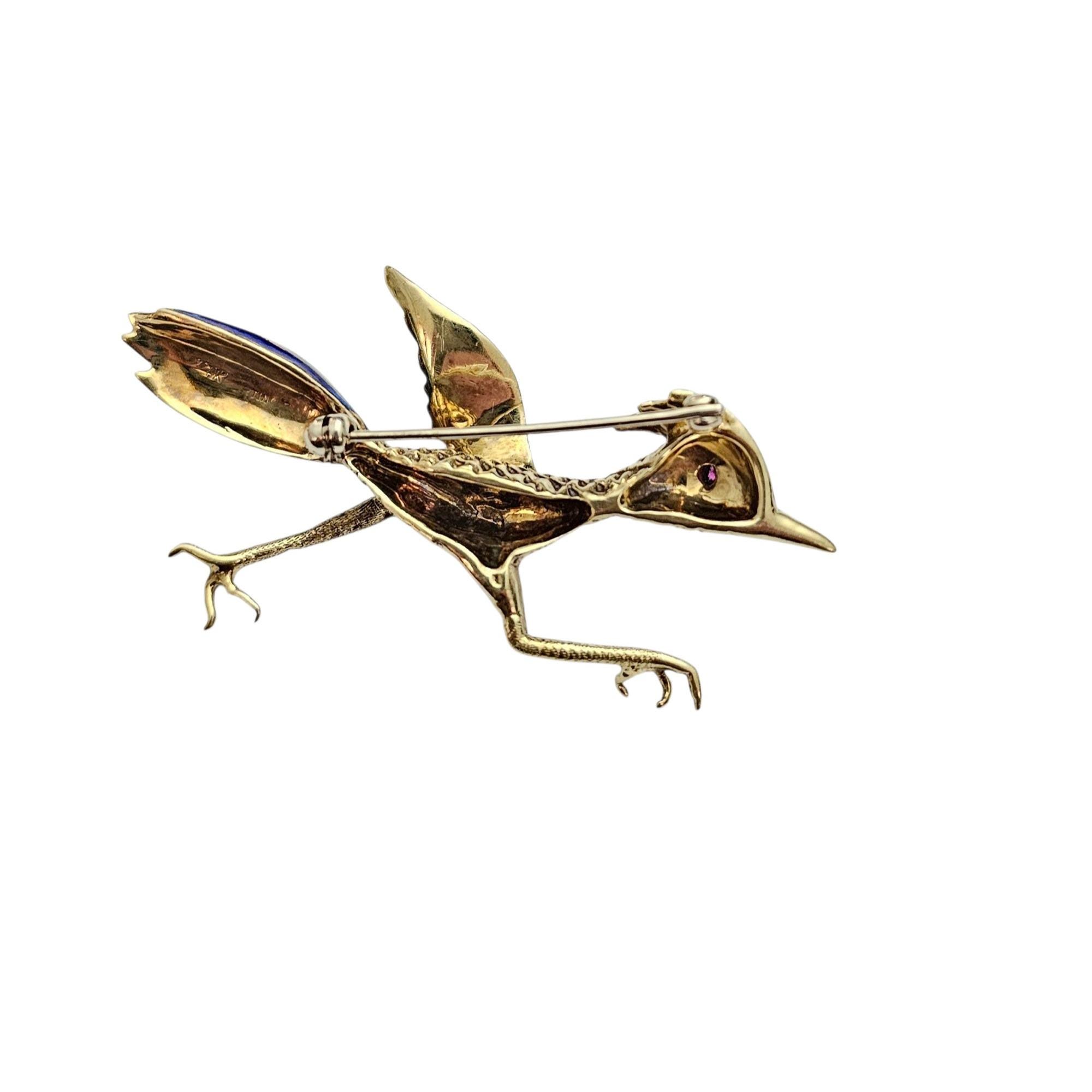 14K Gold Martine Road Runner Brooch Ruby Eye Blue Green Enamel Bird Pin Signed C481