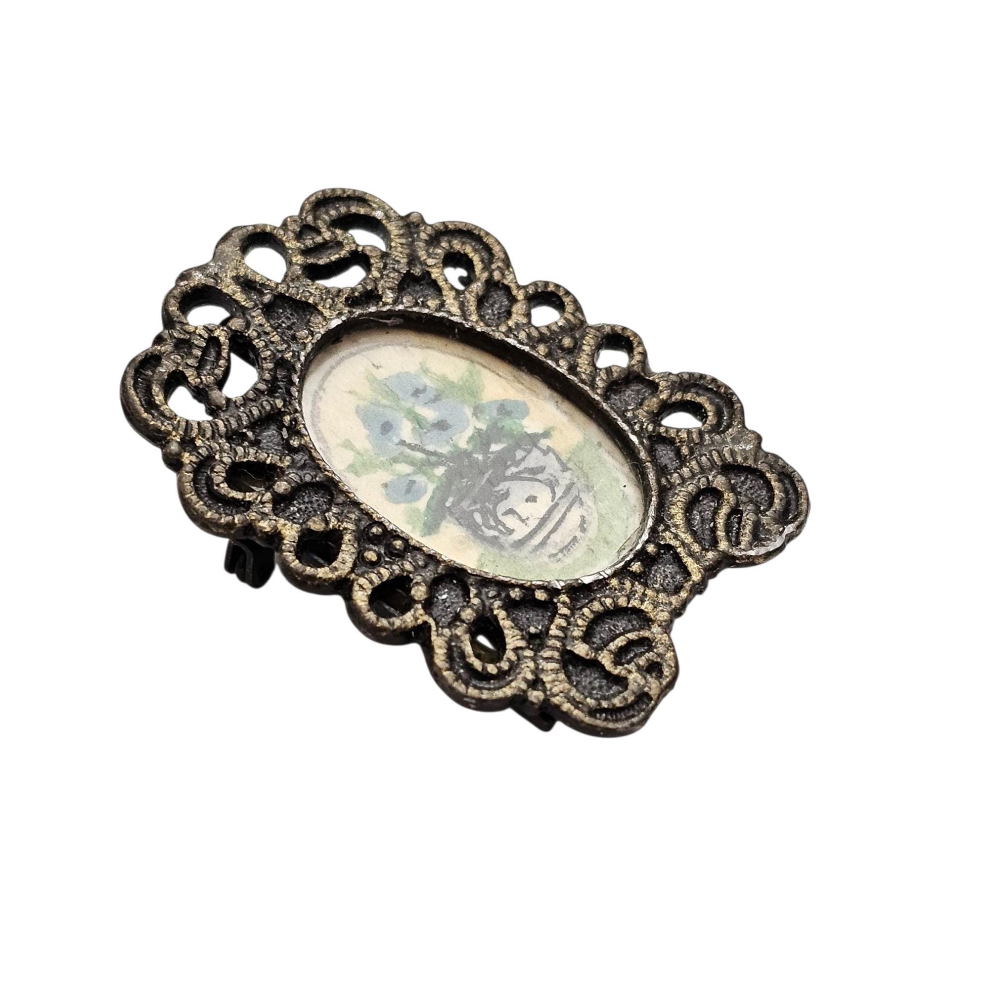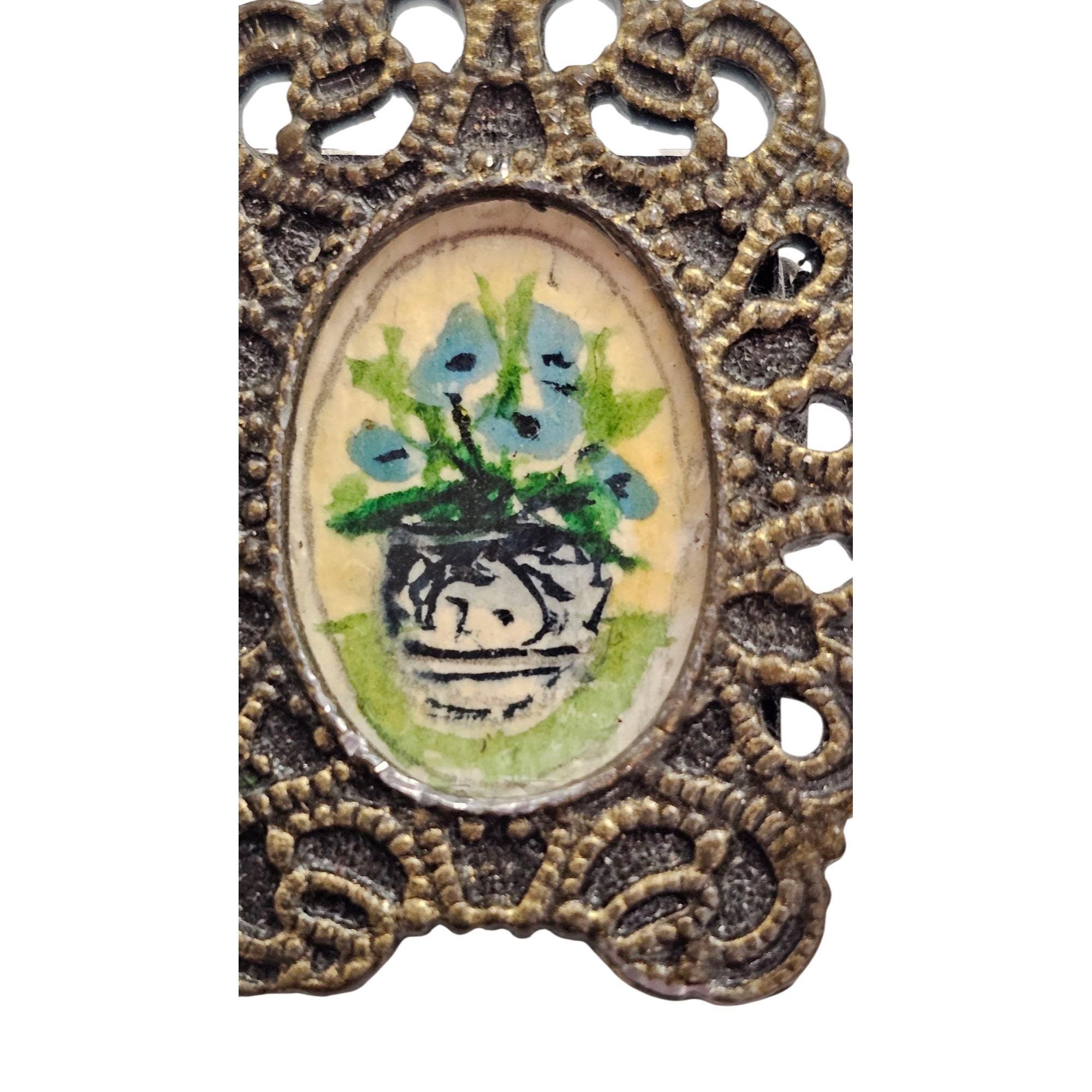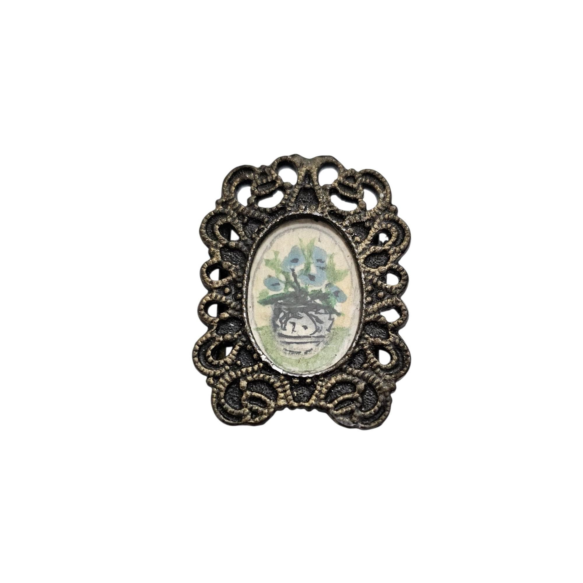 Vase of Flowers Mini Painting In Frame Brooch Water Color Vintage Pin C507