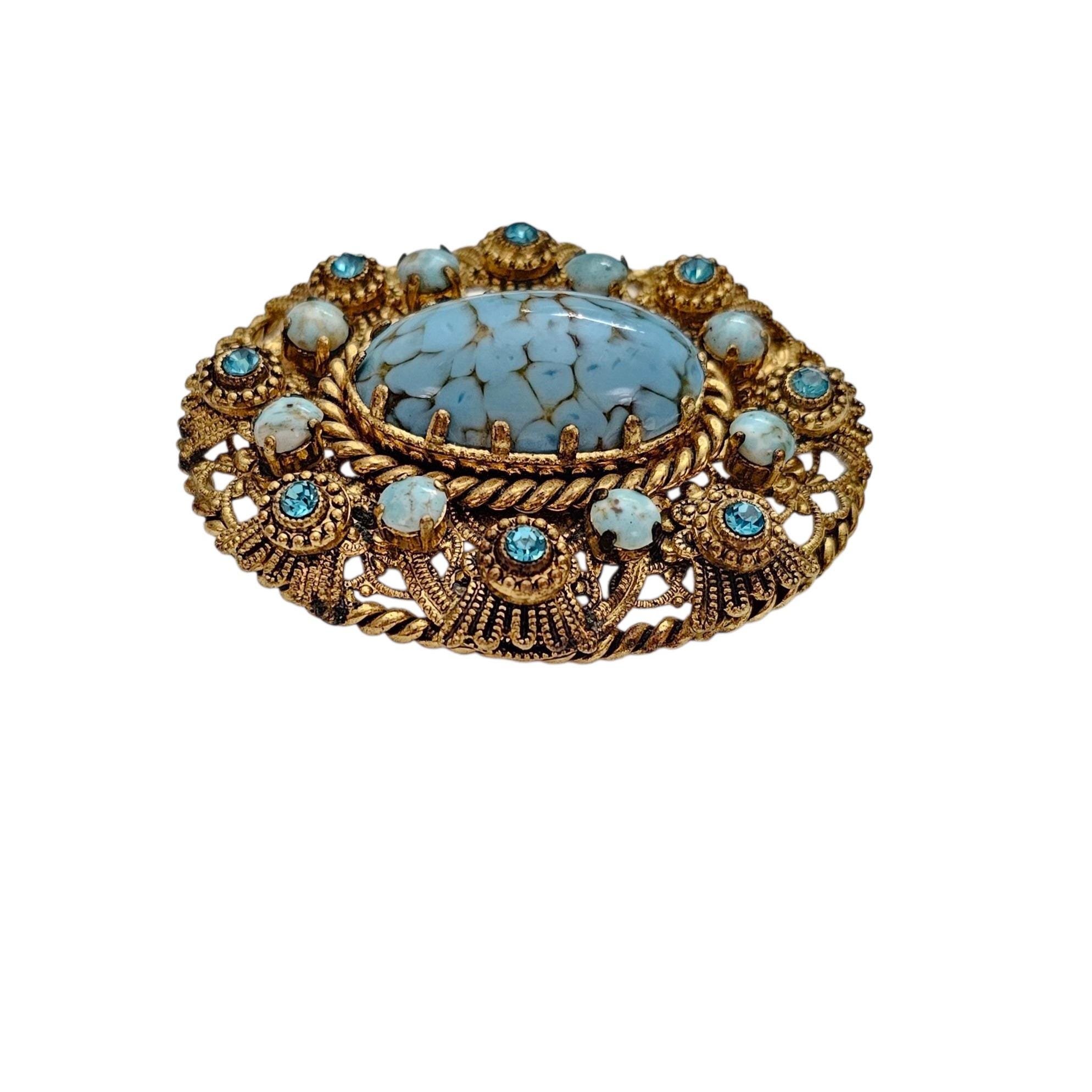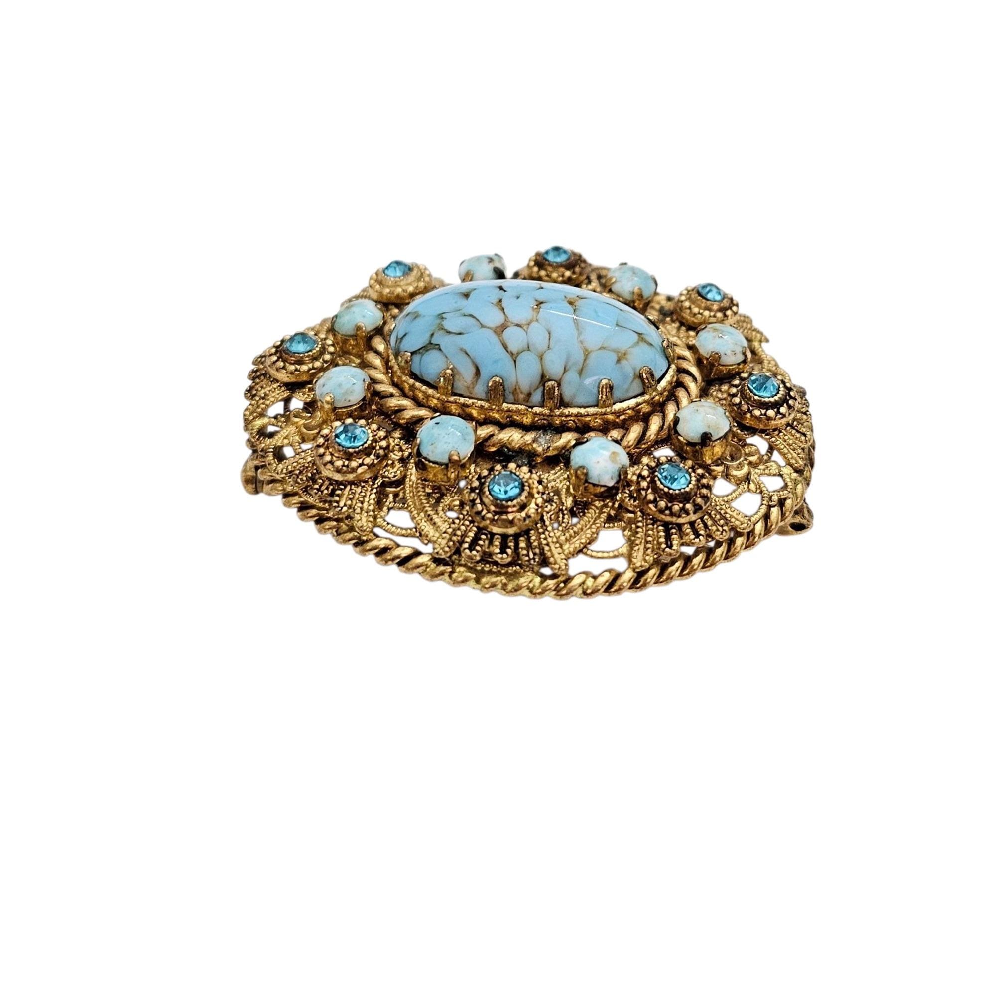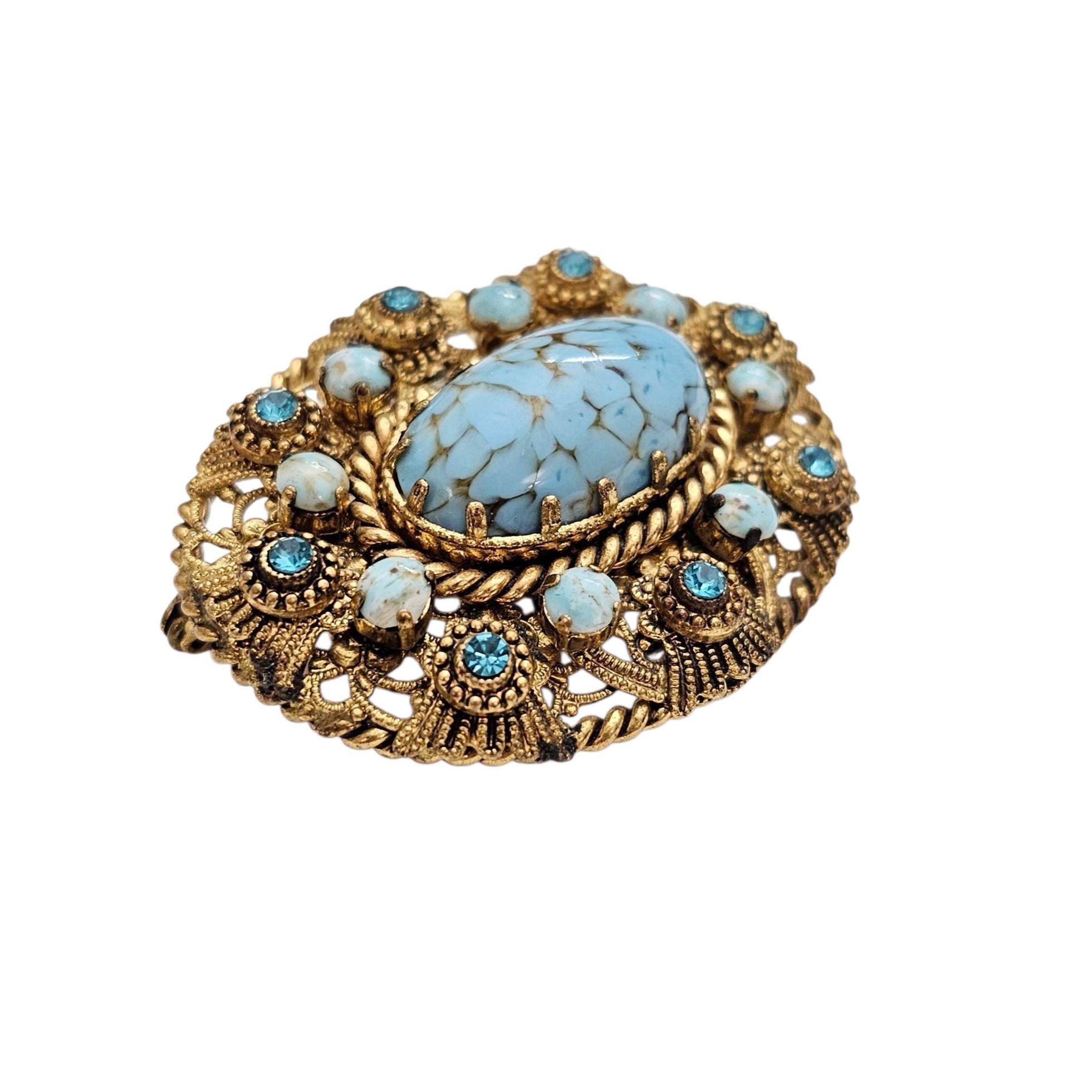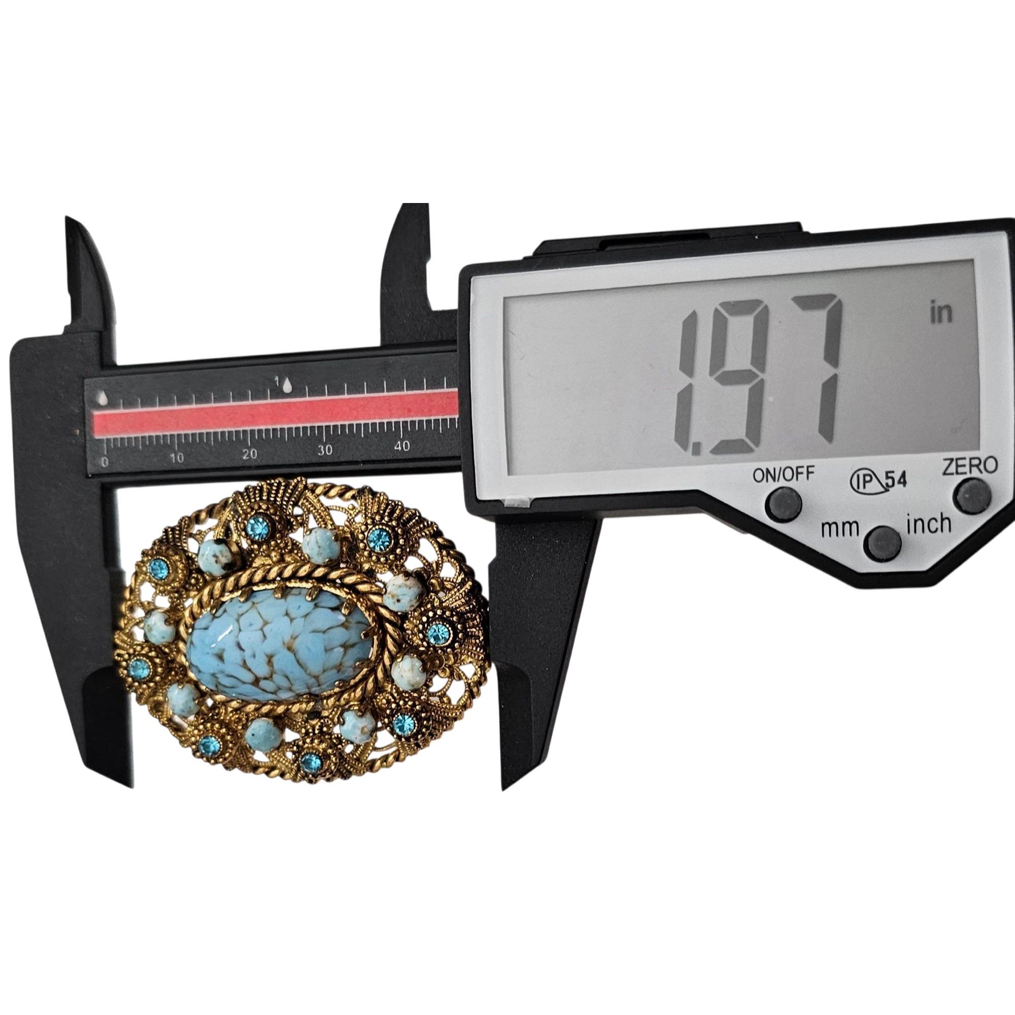 W Germany Blue Art Glass Oval Brooch Filigree Rhinestone Pin Signed, C505