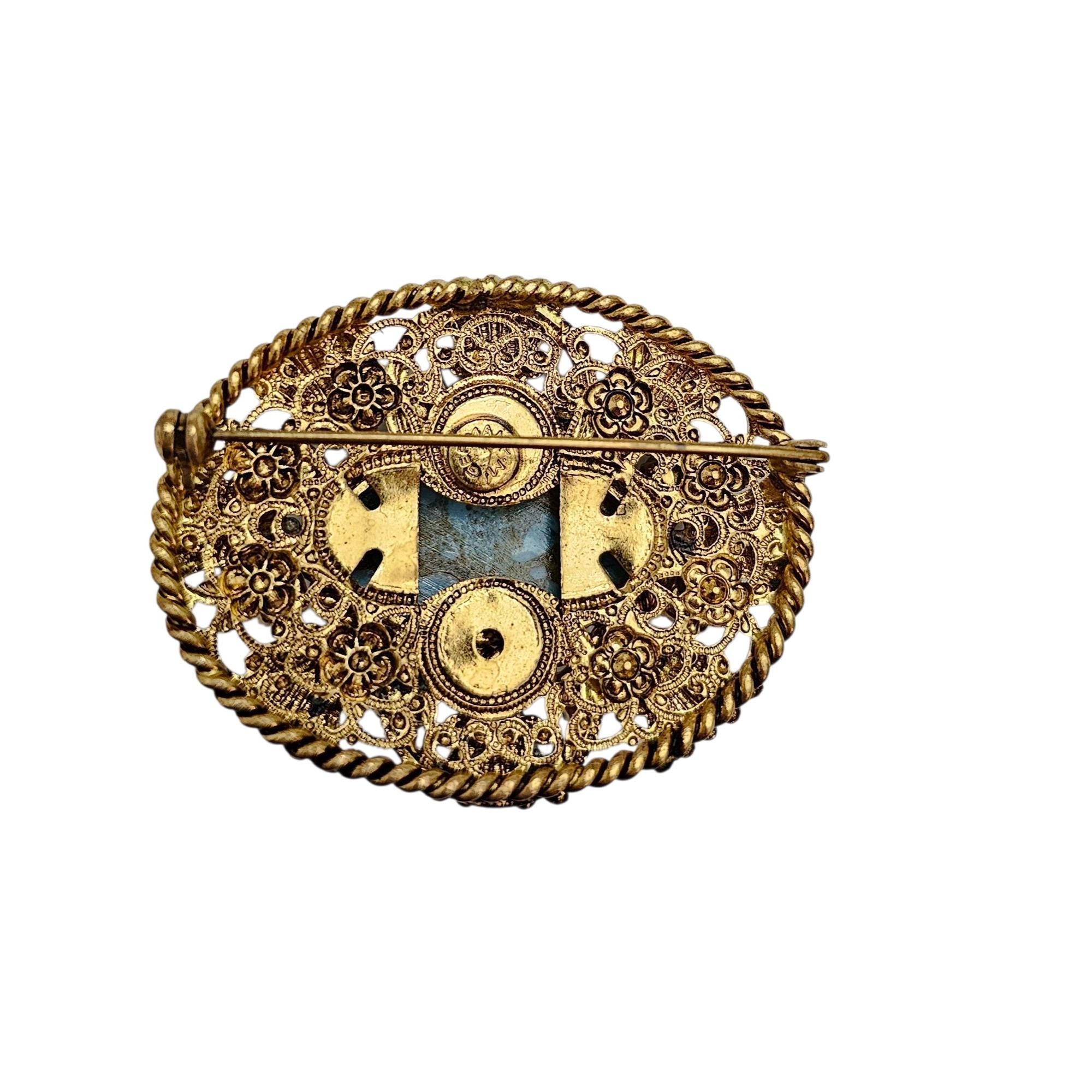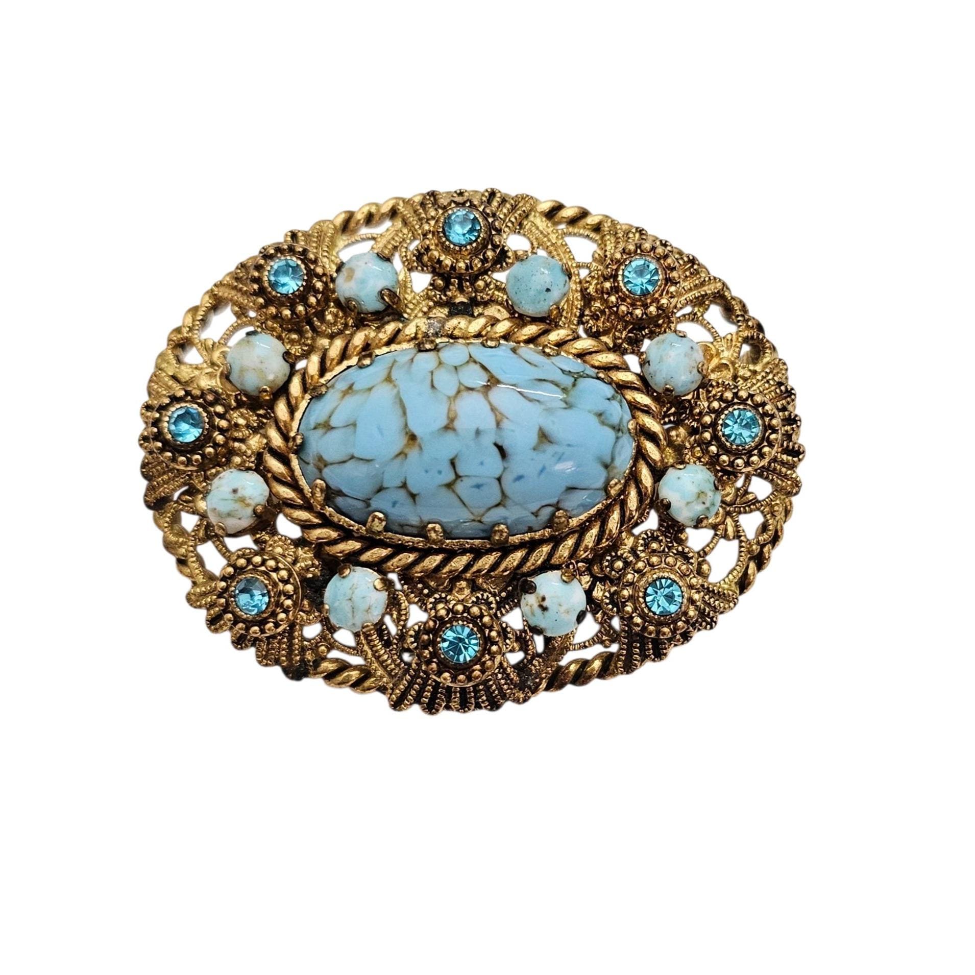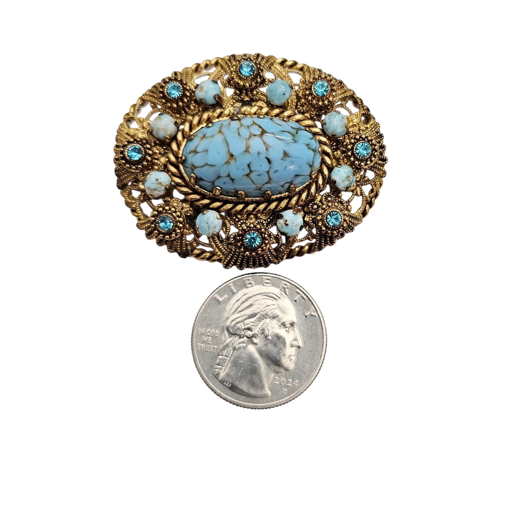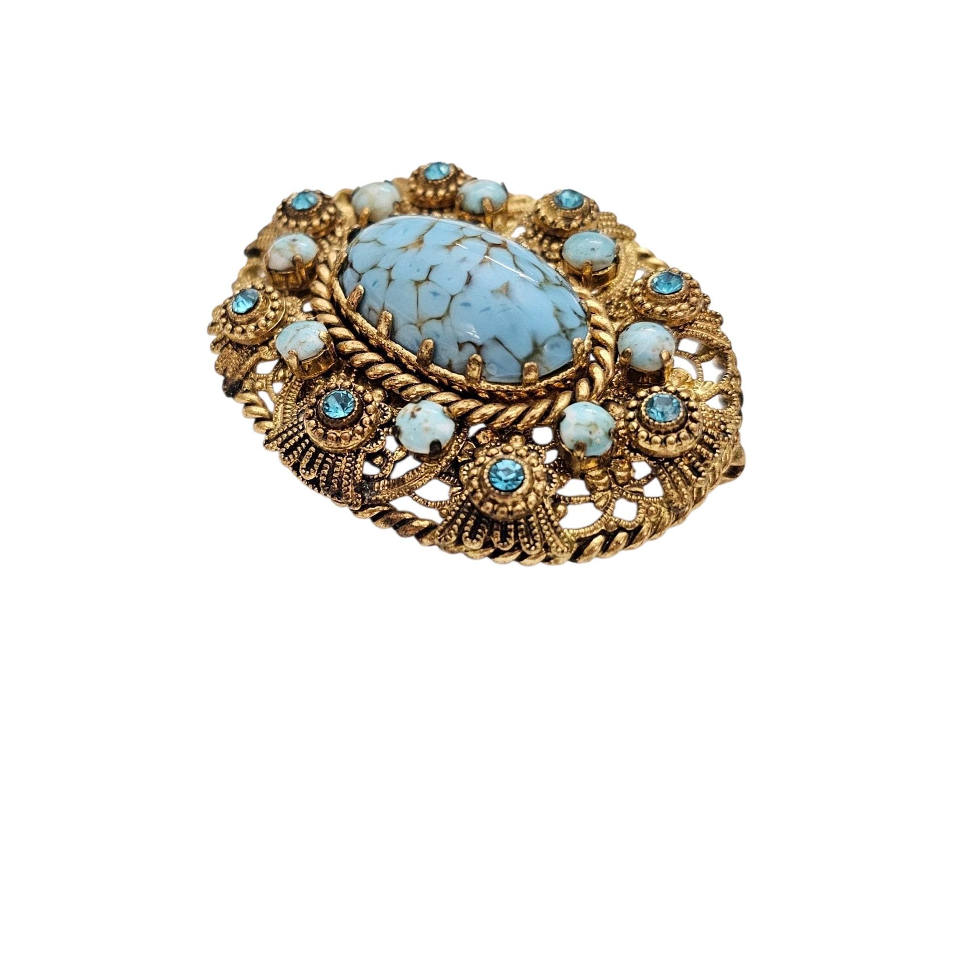 W Germany Blue Art Glass Oval Brooch Filigree Rhinestone Pin Signed, C505