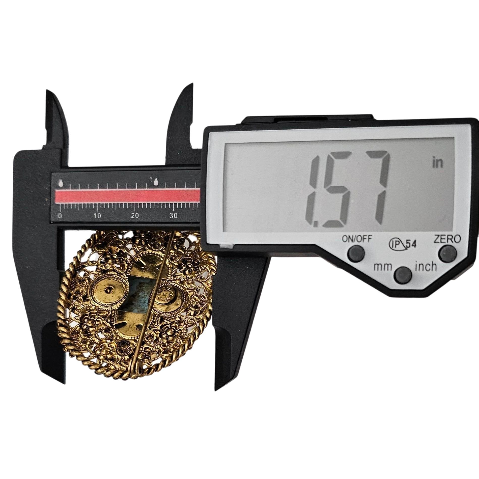 • It has an intricate, radiant gold-tone backing designed in the classic style of German costume jewelry