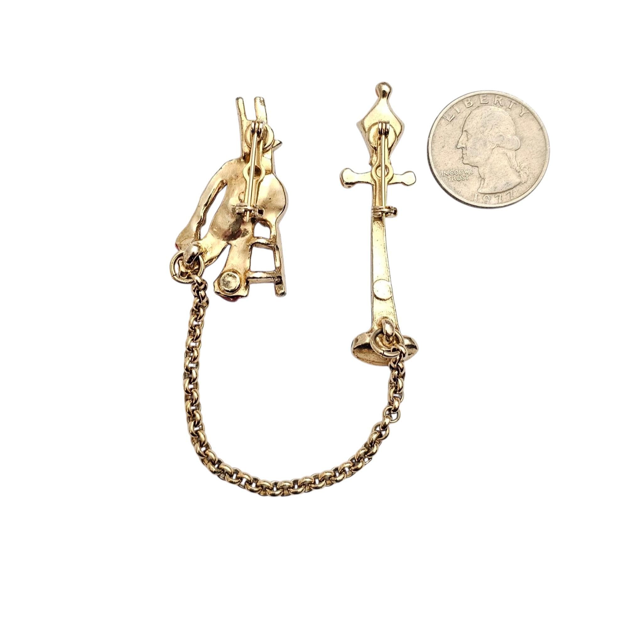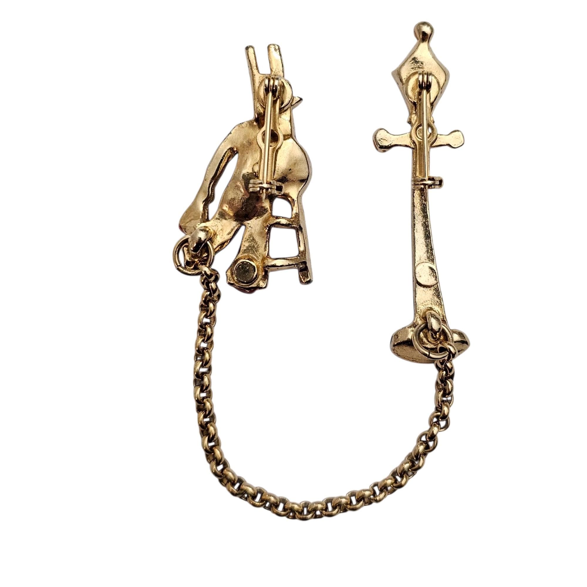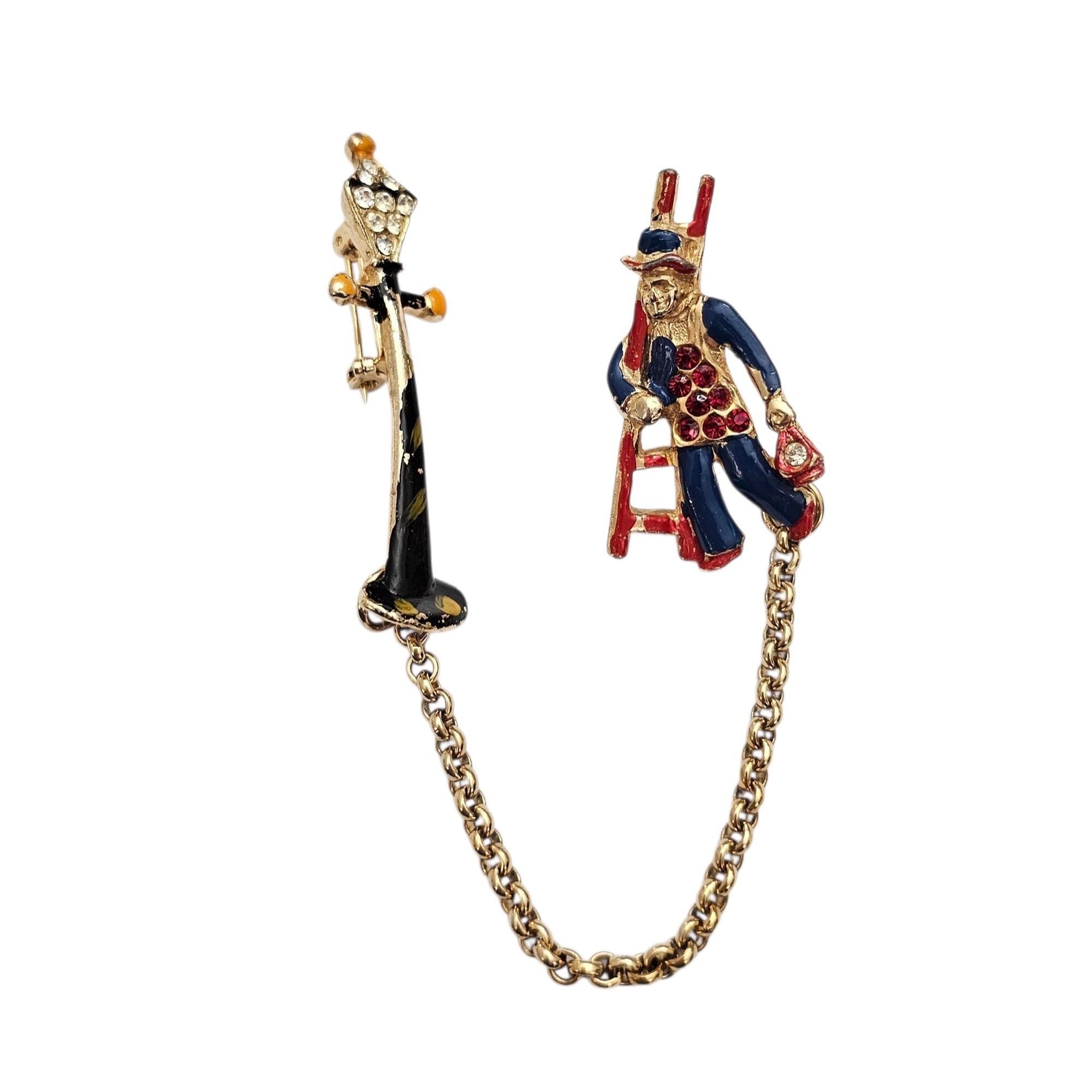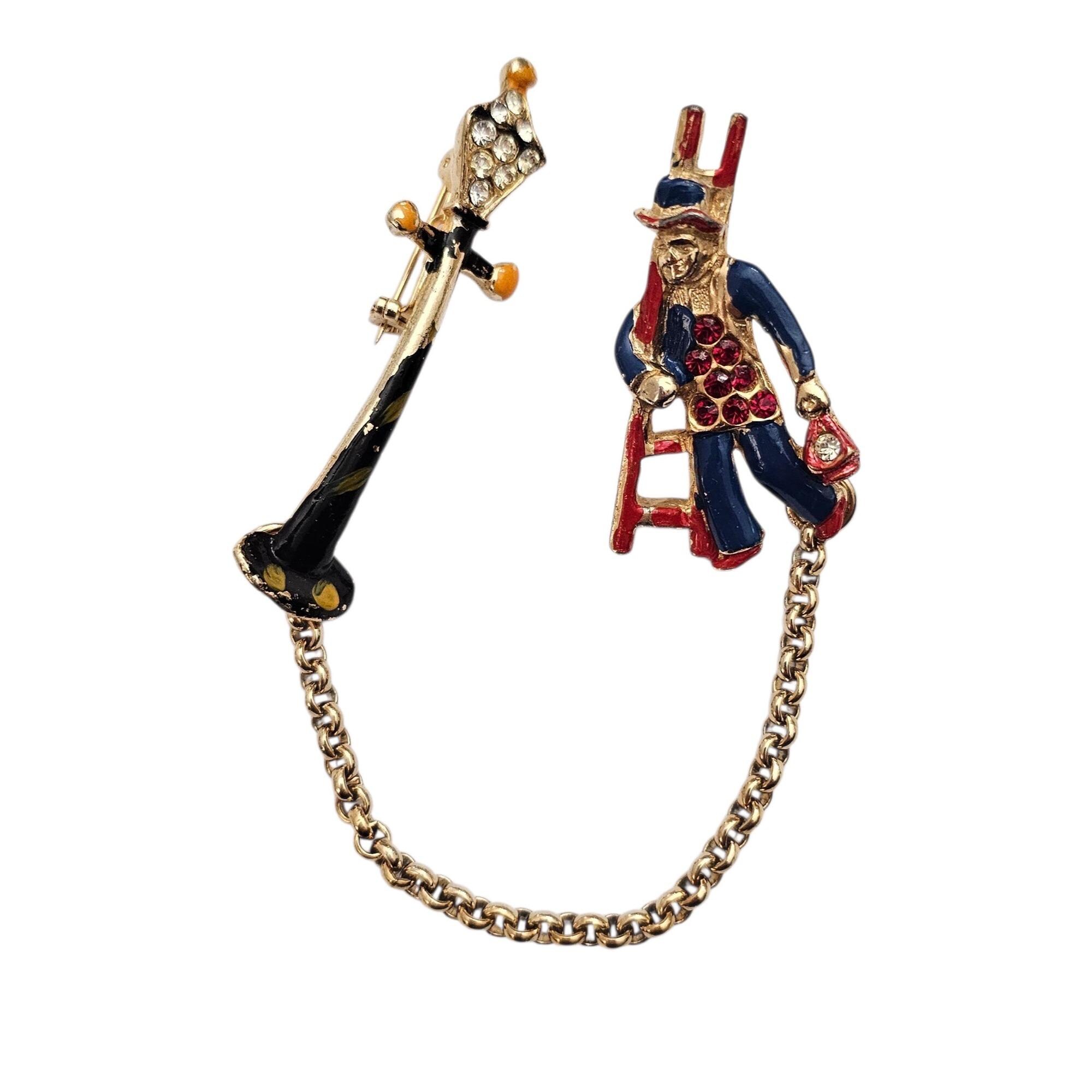 Lamp Post Ladder Man Chatelaine Brooch Set Vintage Rhinestone Enamel Pins C500