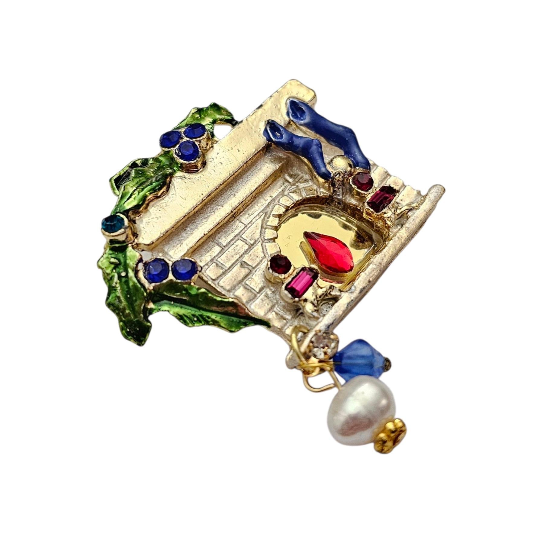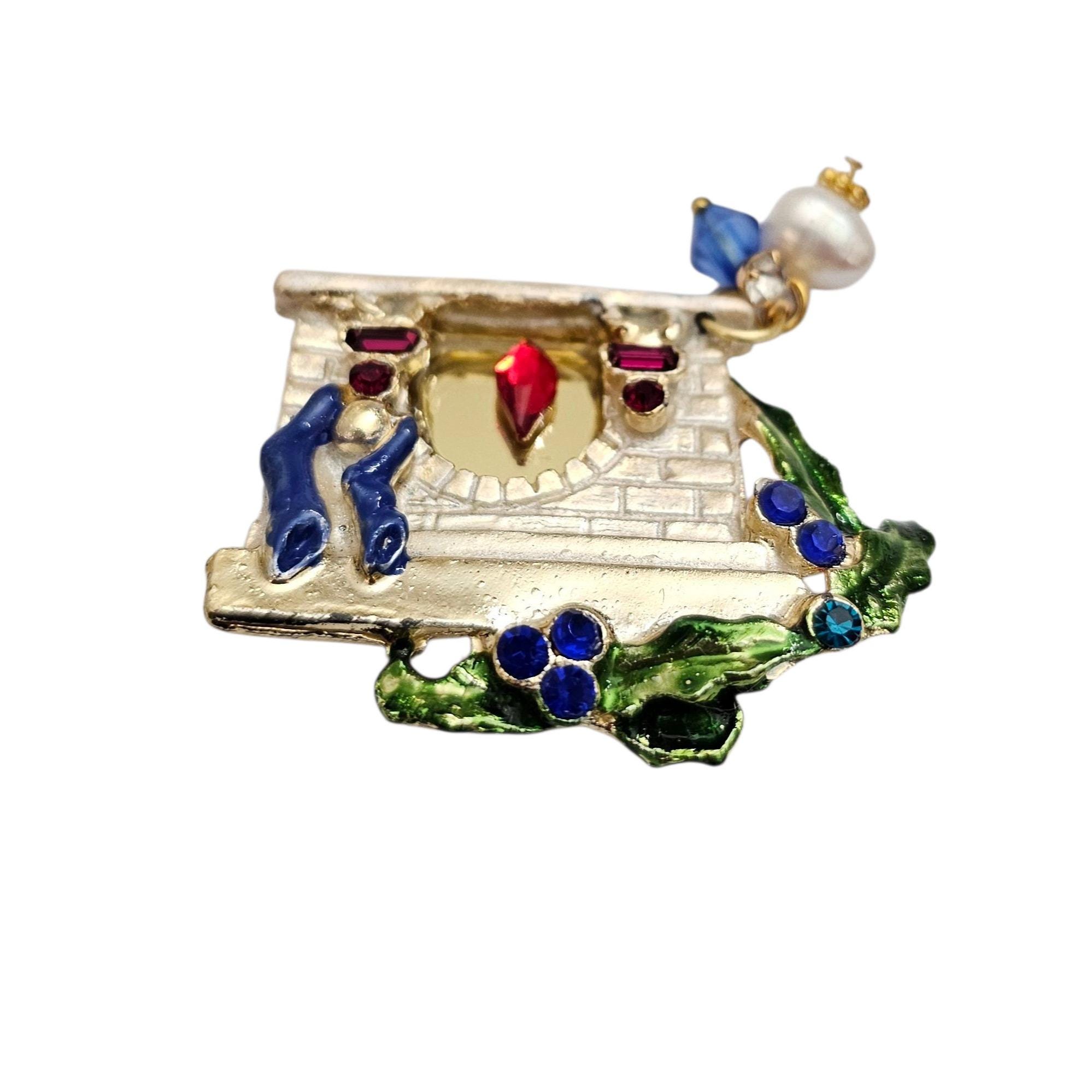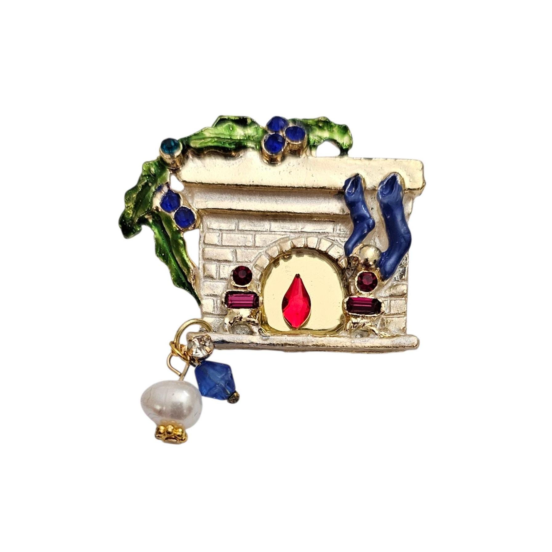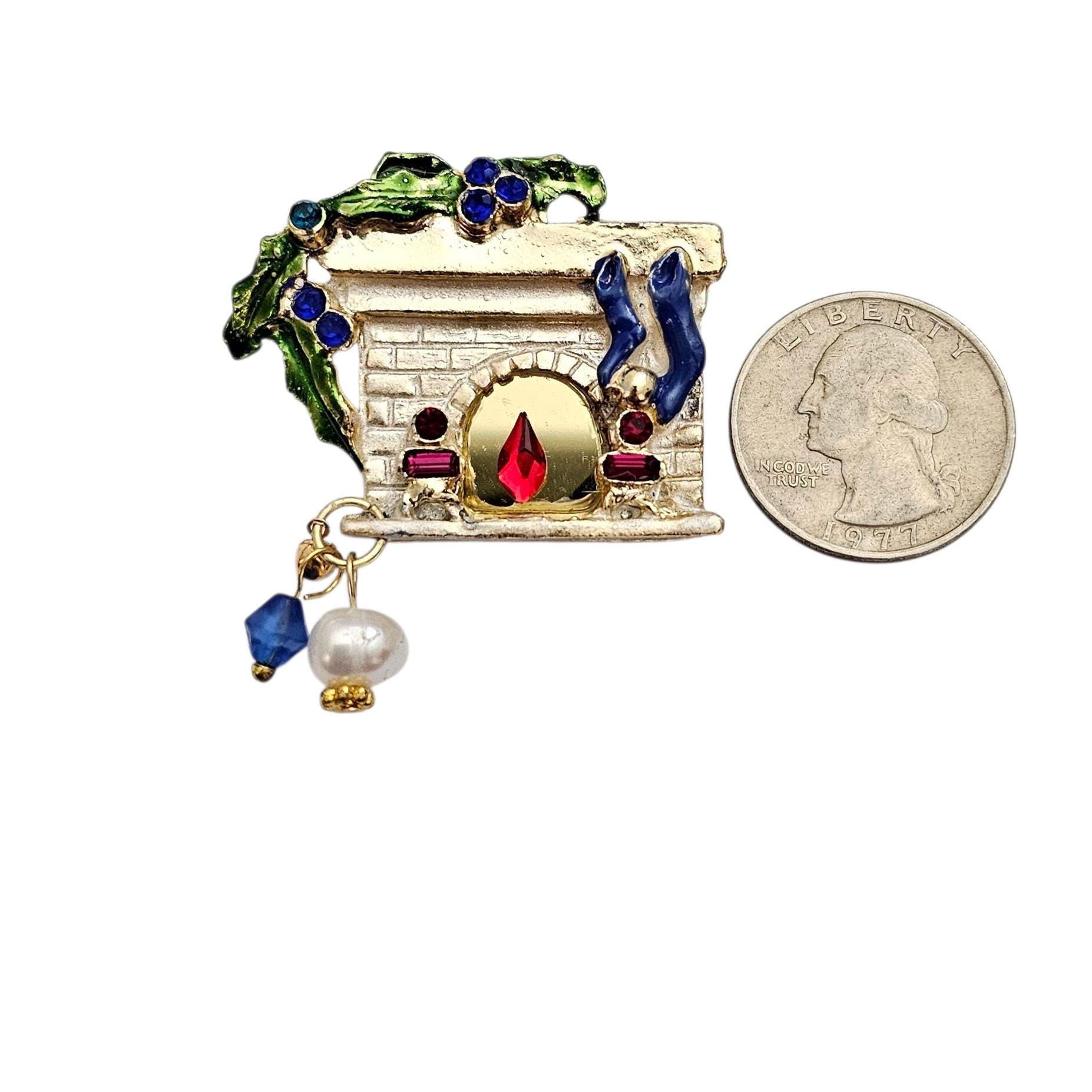 Vintage Blue Rhinestone Fireplace Brooch Christmas Holly Mantle Pearl Charm Pin c494