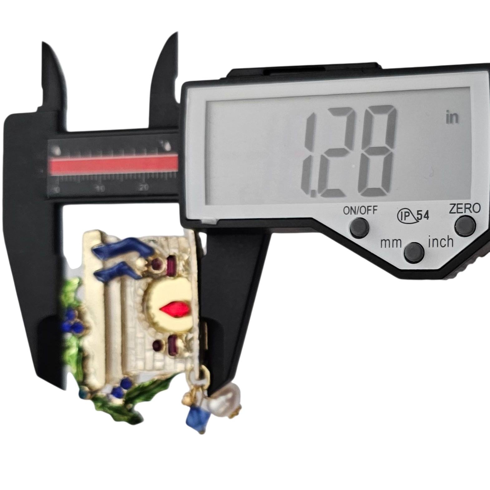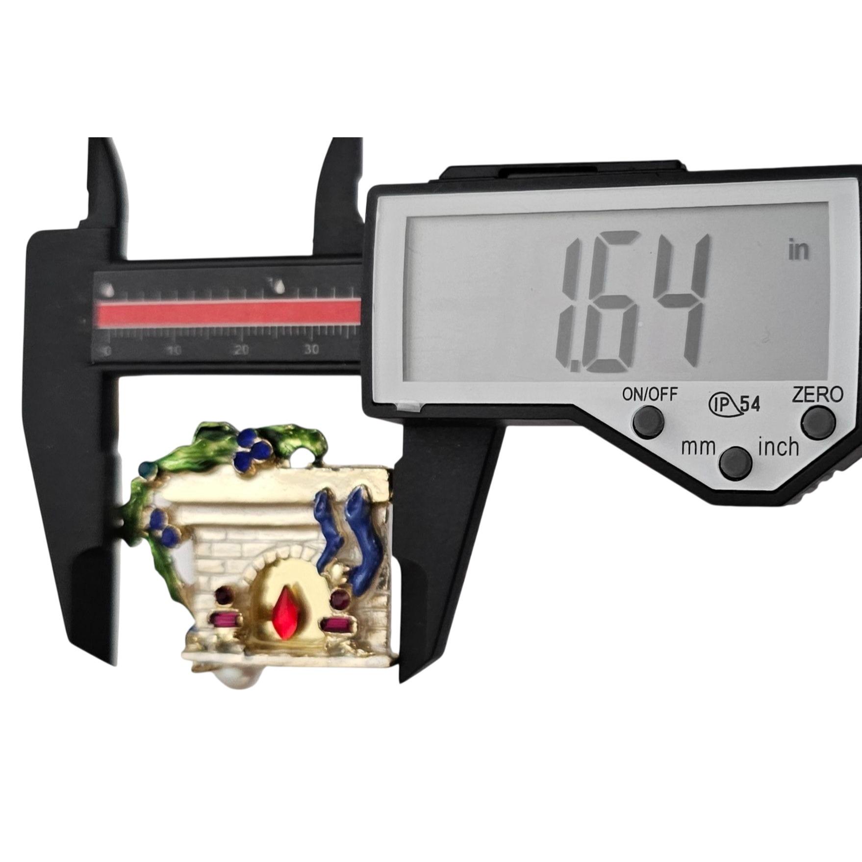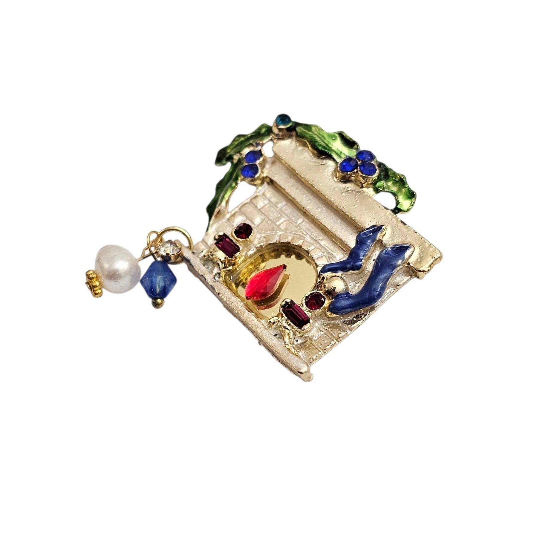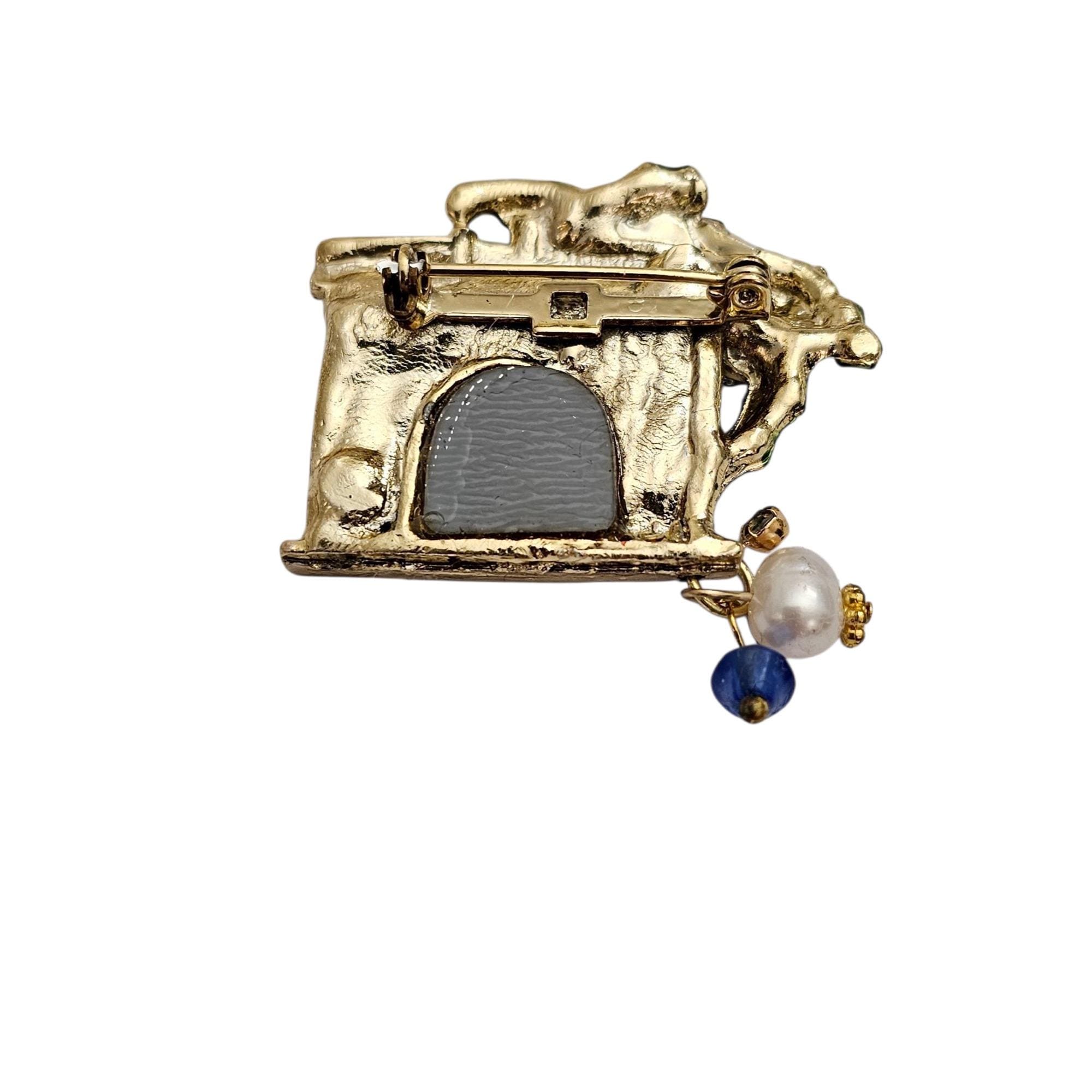 Vintage Blue Rhinestone Fireplace Brooch Christmas Holly Mantle Pearl Charm Pin c494
