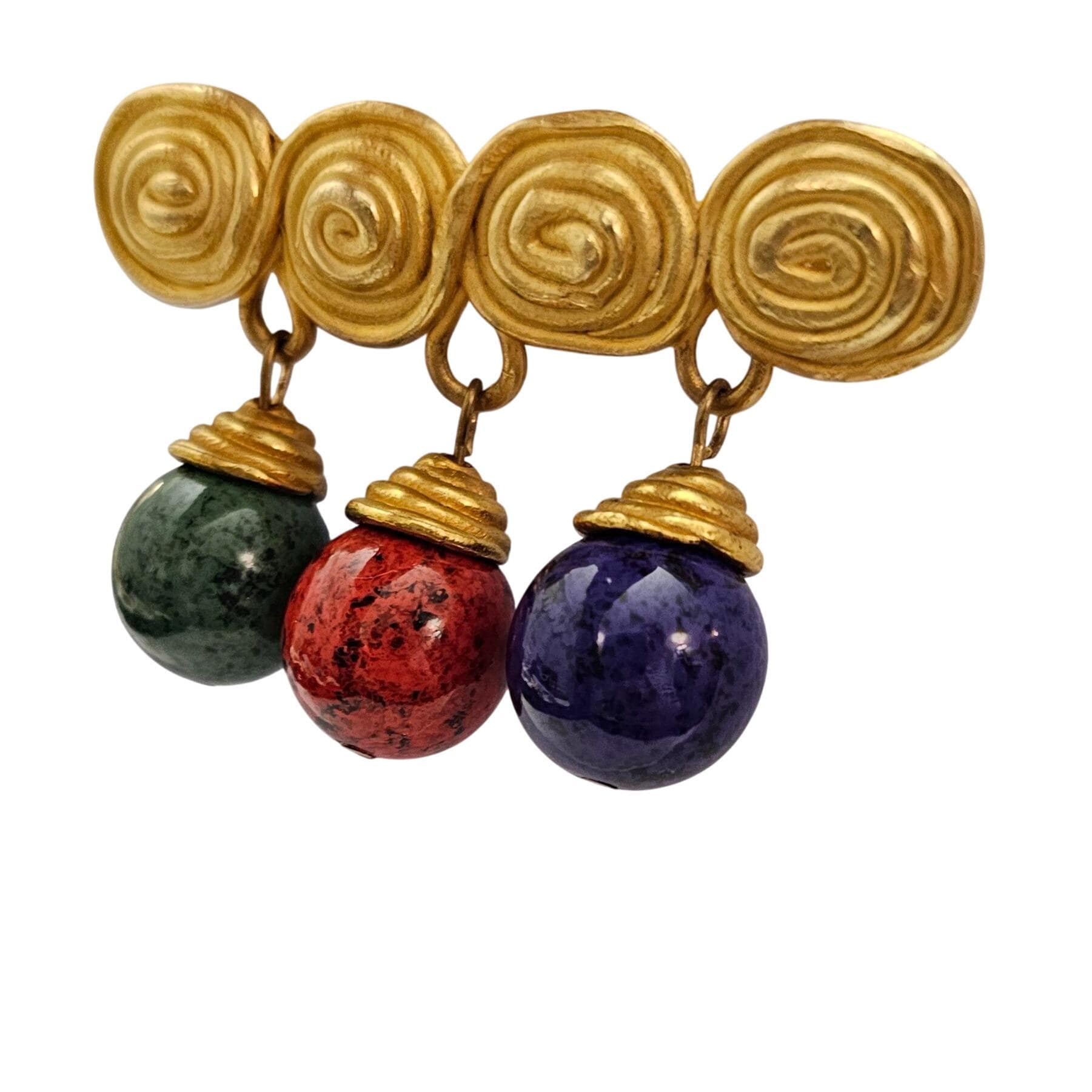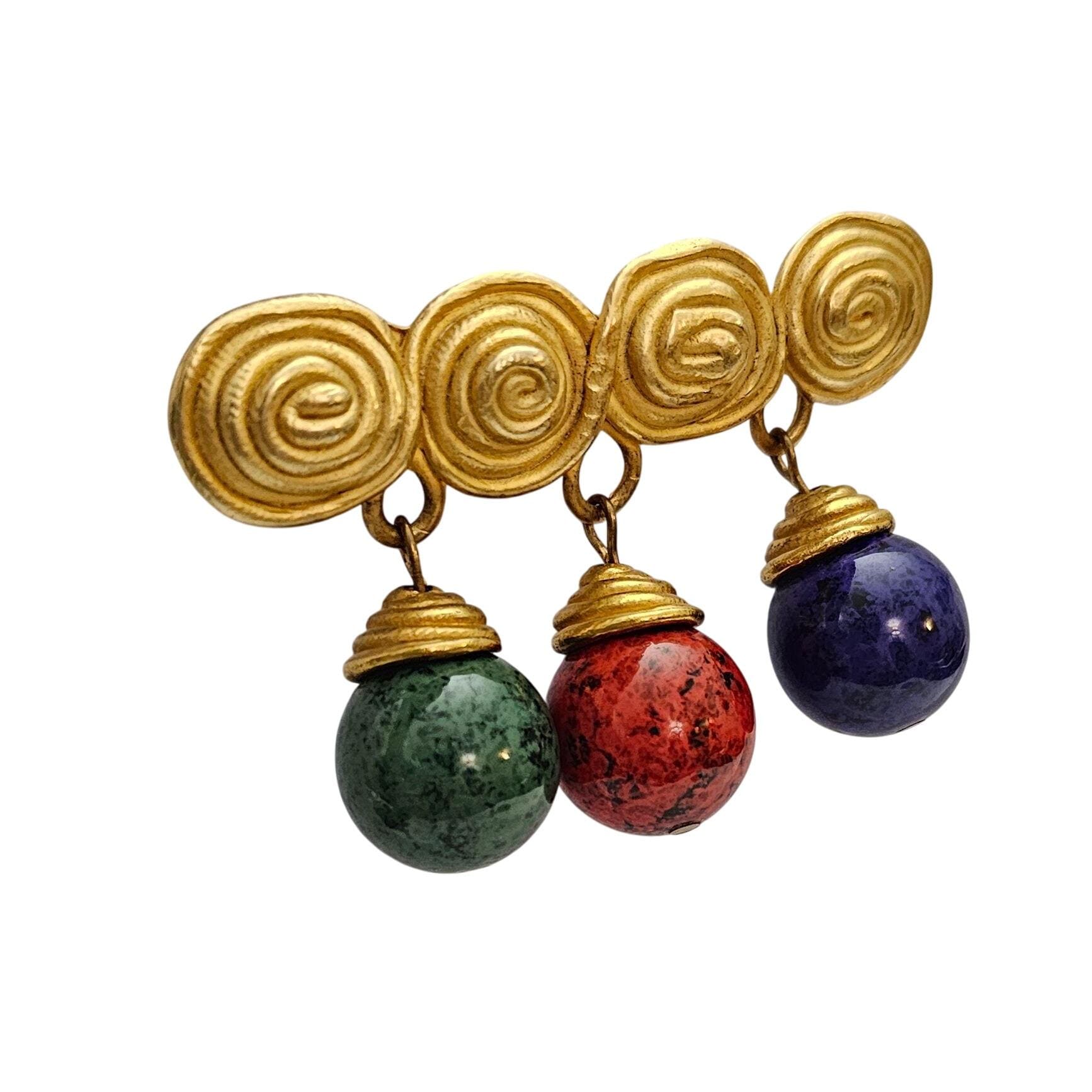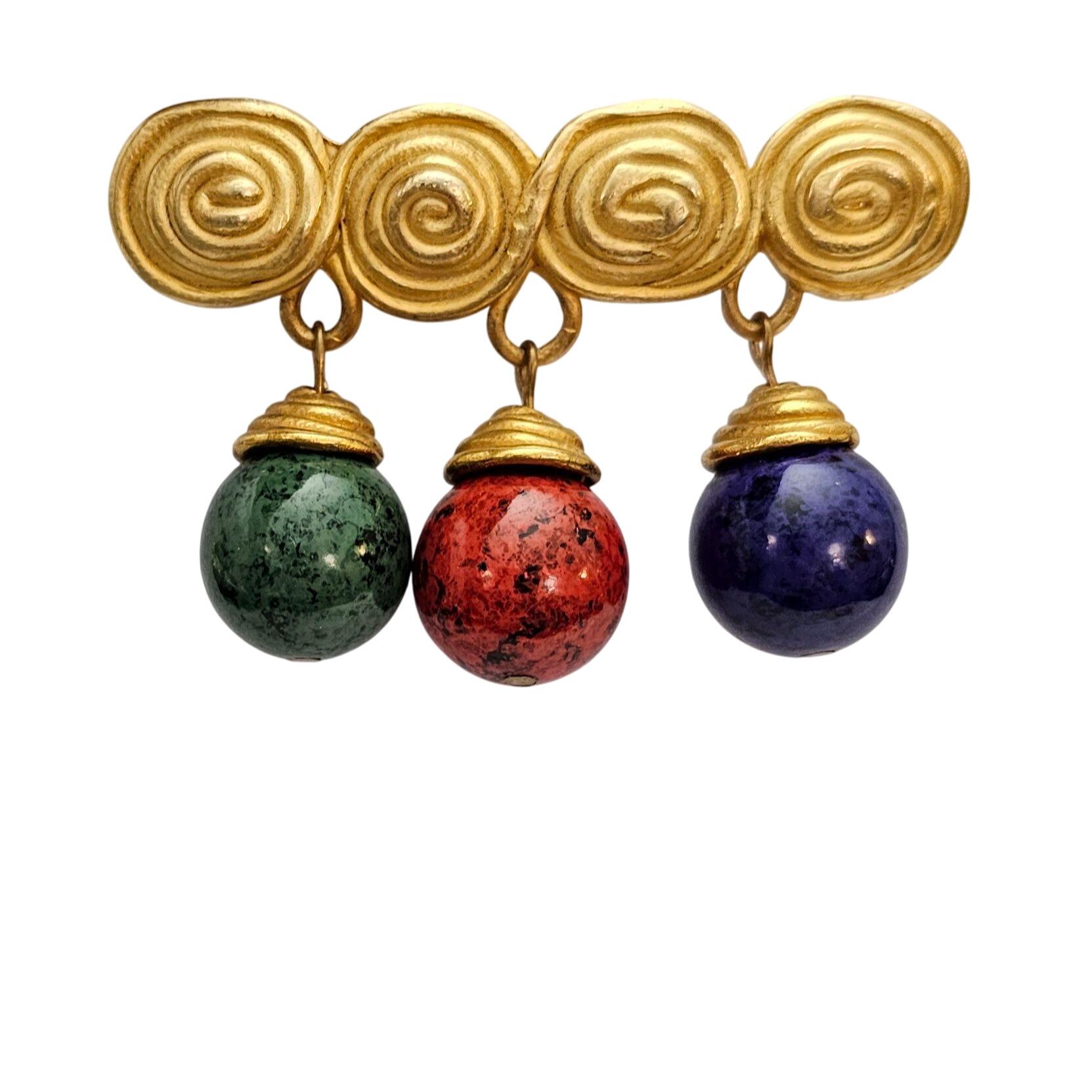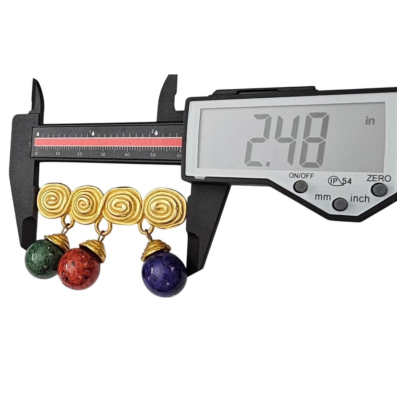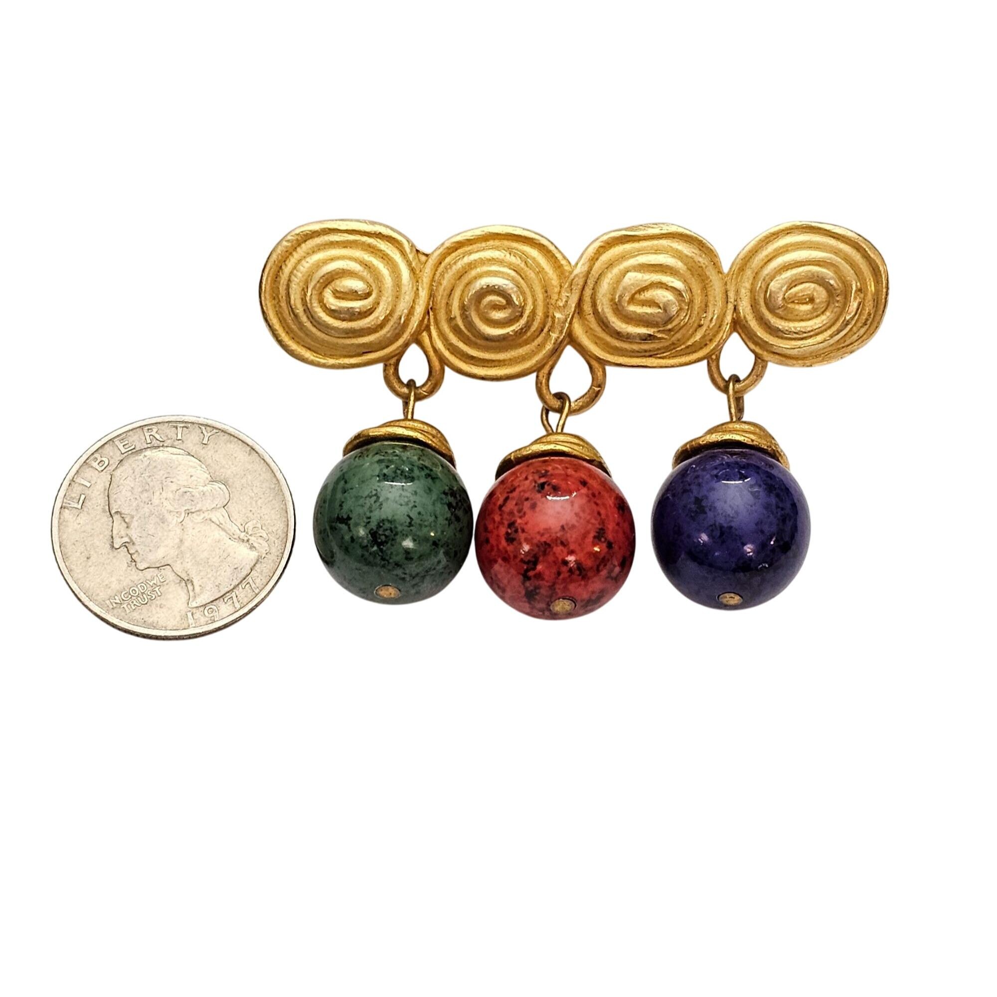 1980s Bar Brooch Red Blue Green Egypt Style Bead Dangle Matte Gold Tone Pin C537