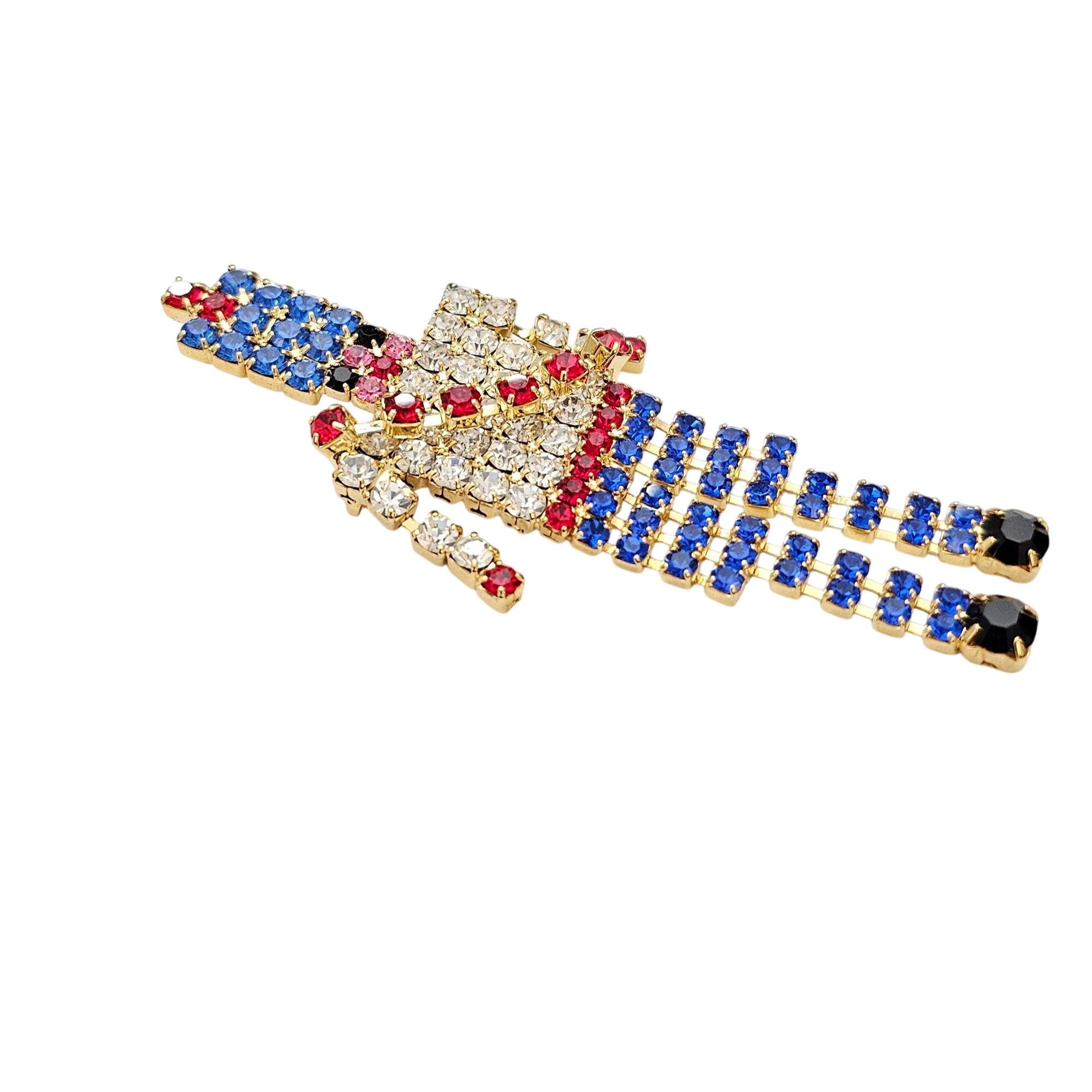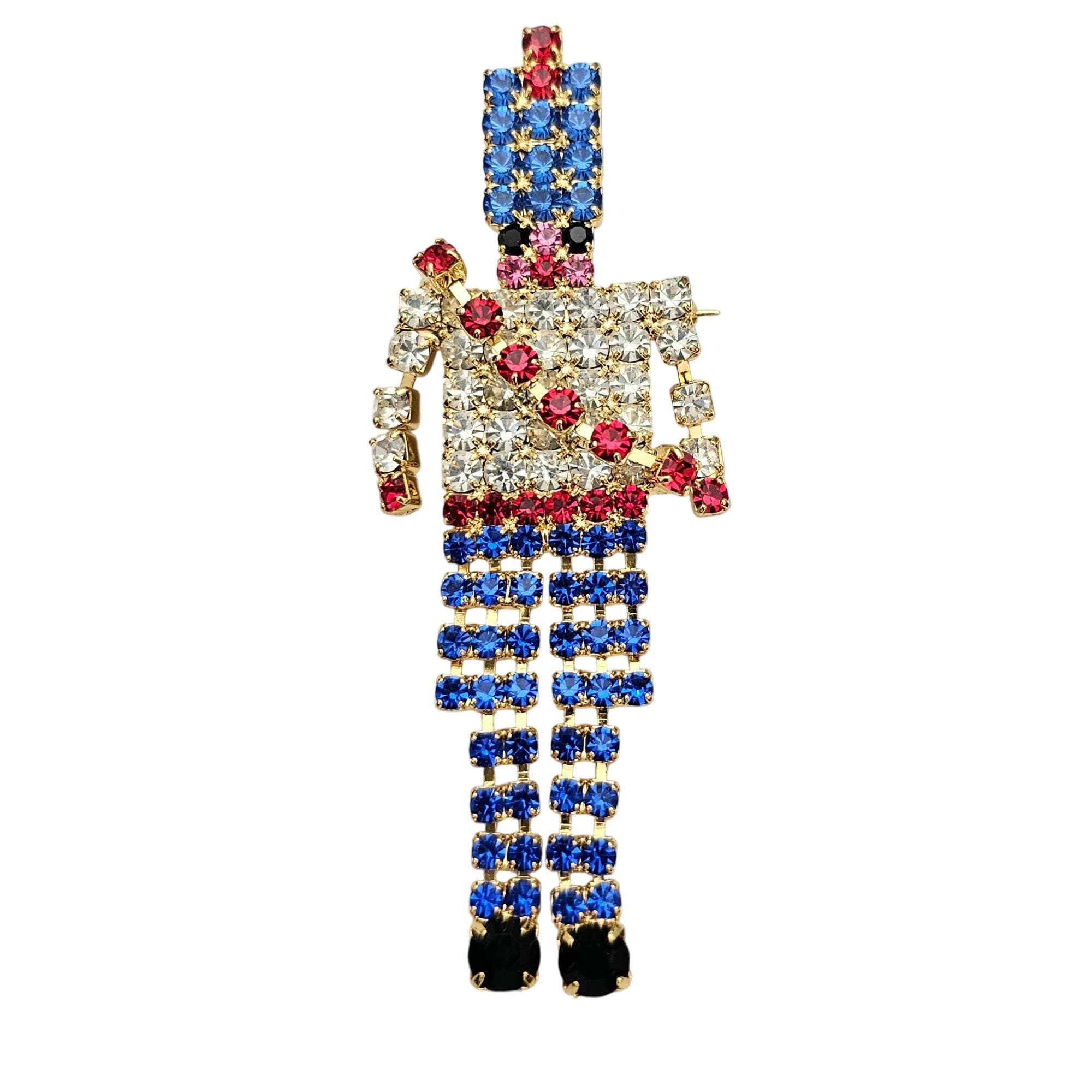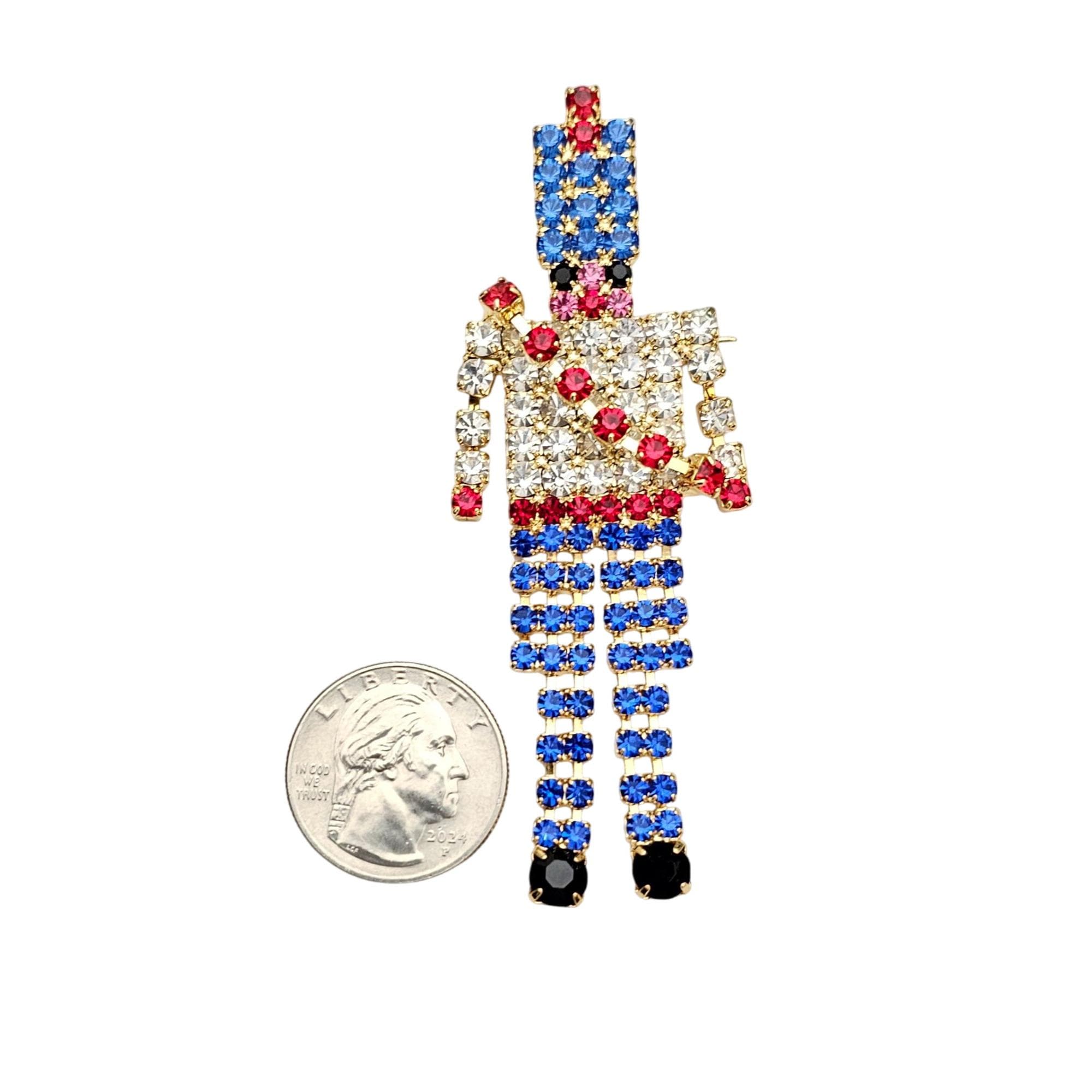 Nutcracker Soldier Articulated Brooch Blue Red Rhinestone Christmas Pin C532