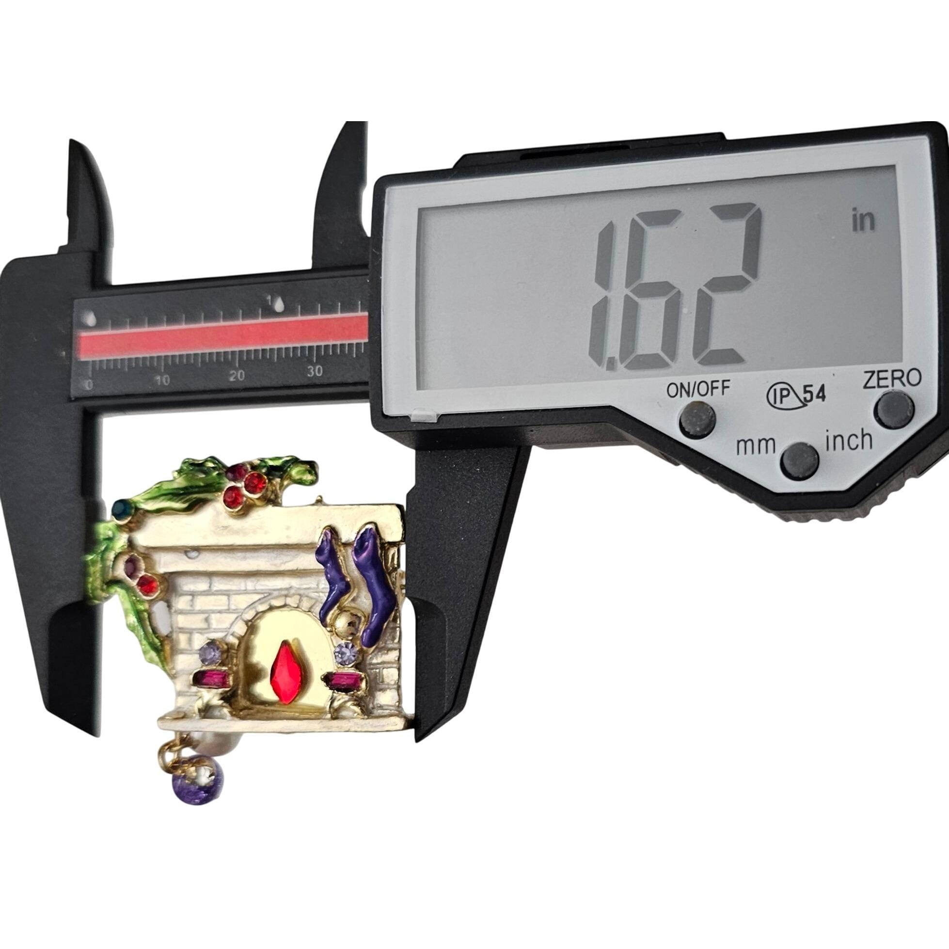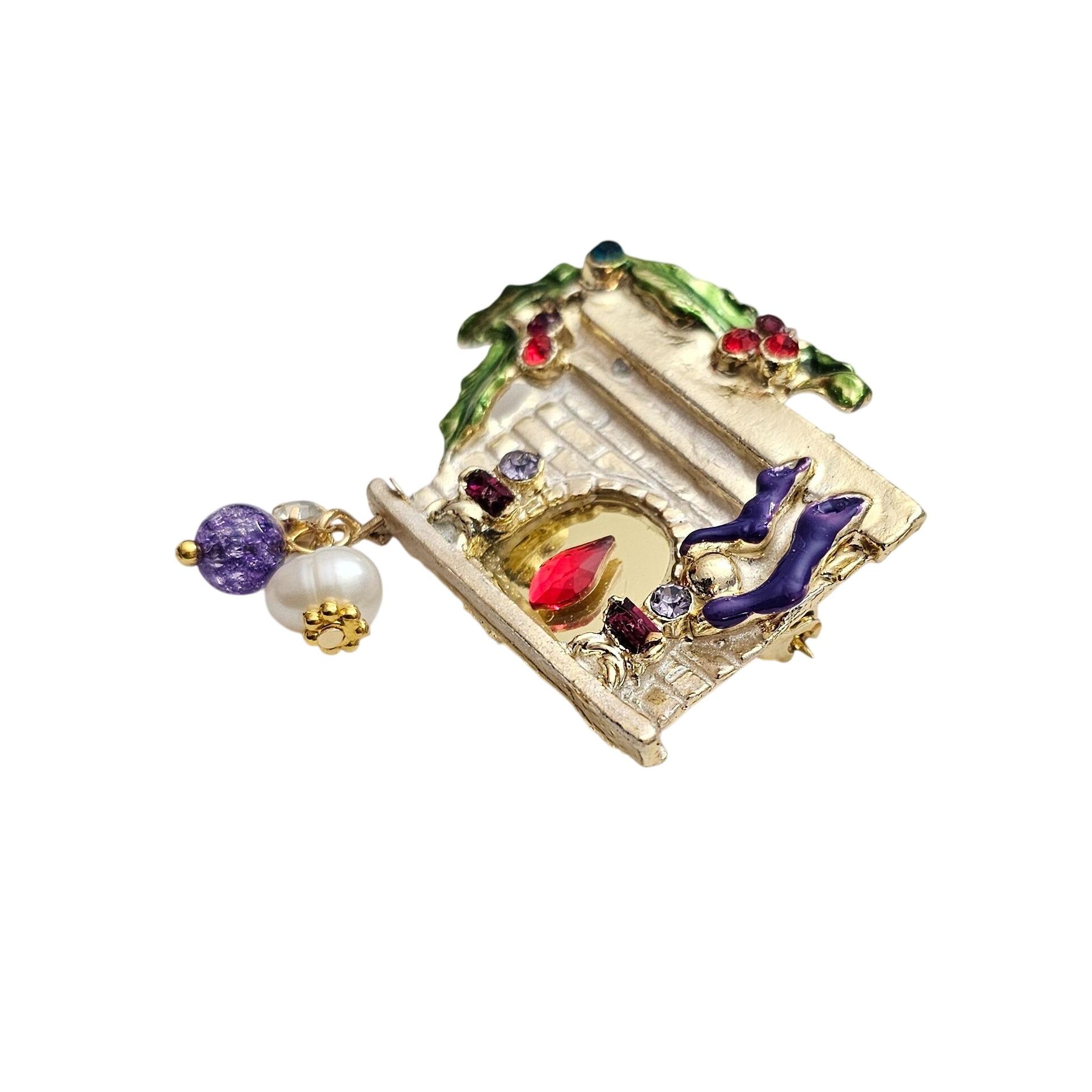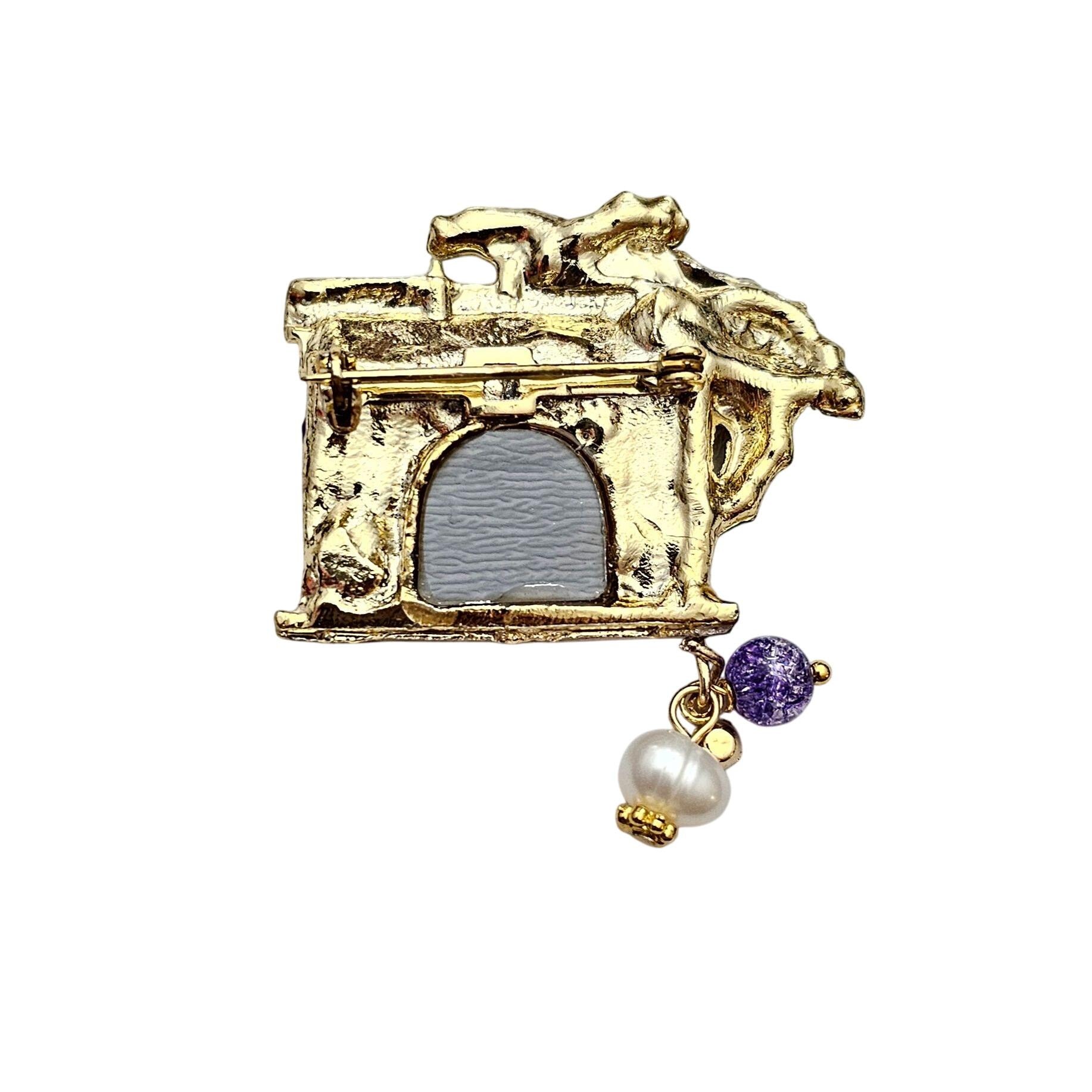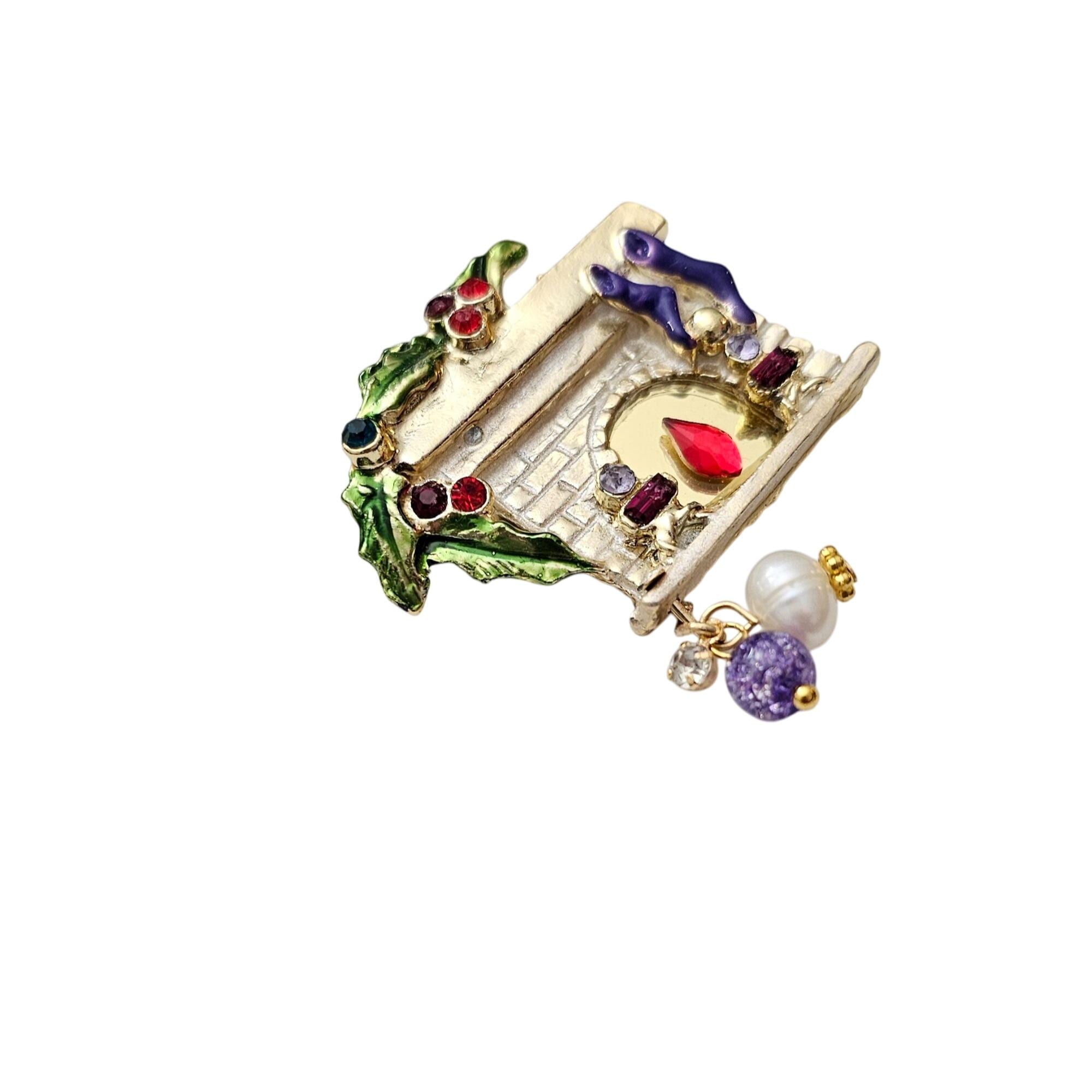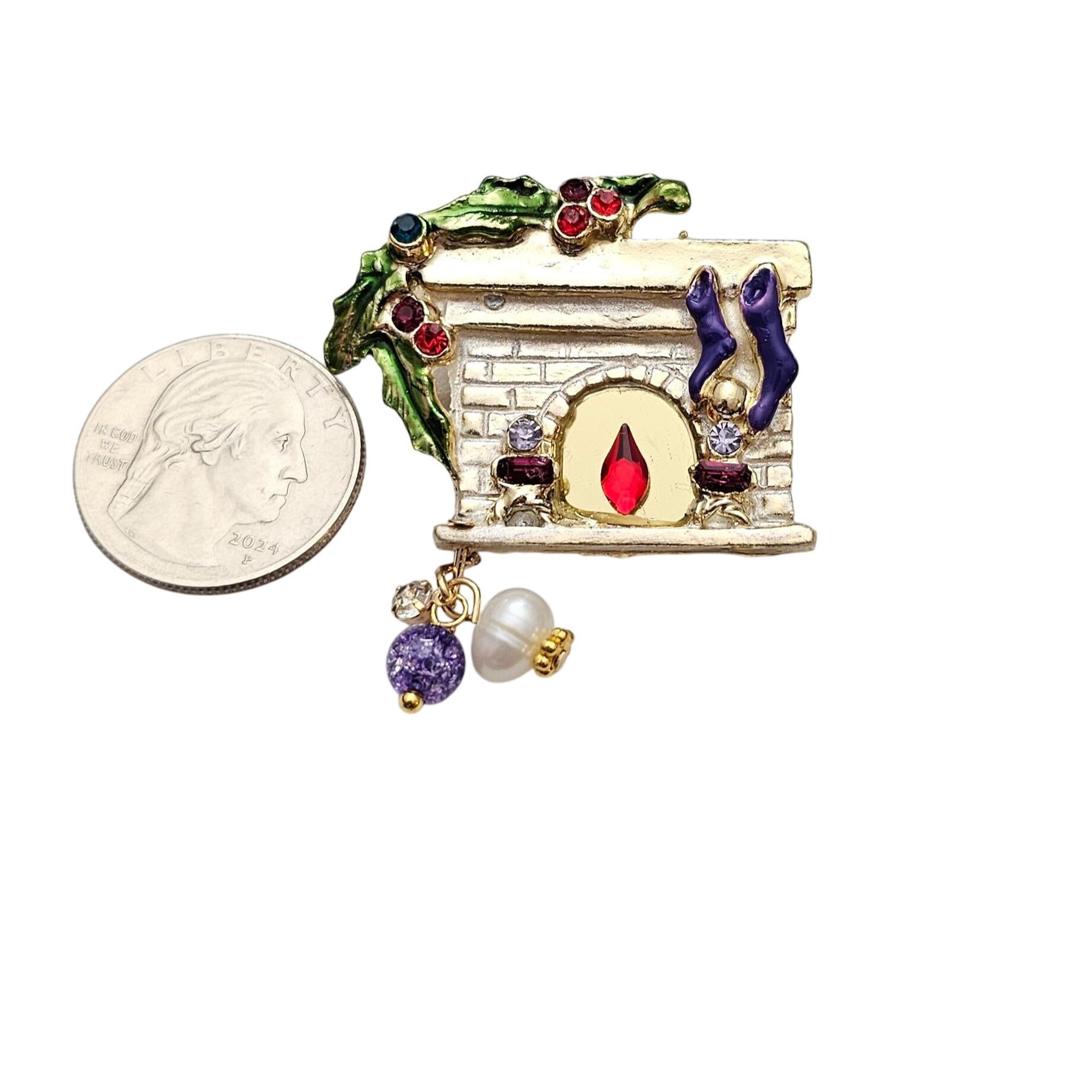 Gold Tone Fireplace Brooch Purple Stocking Holly Pin C543