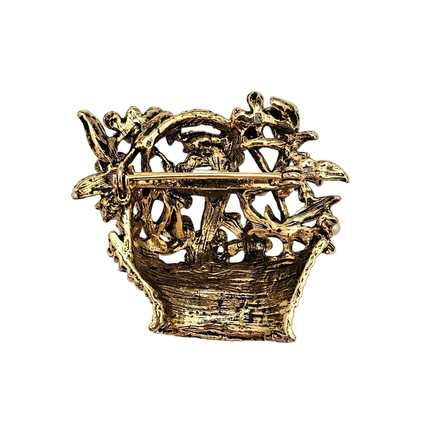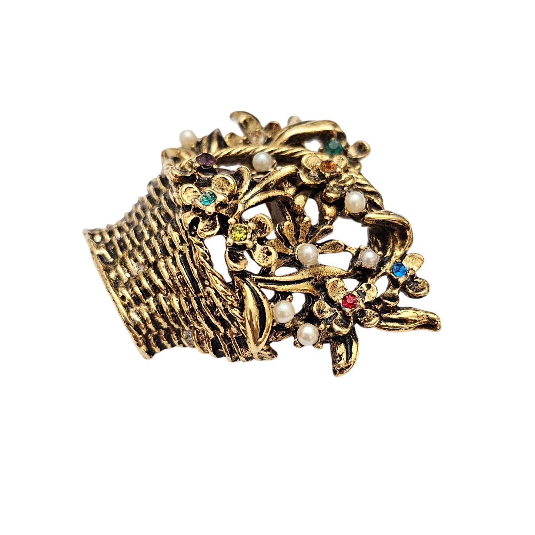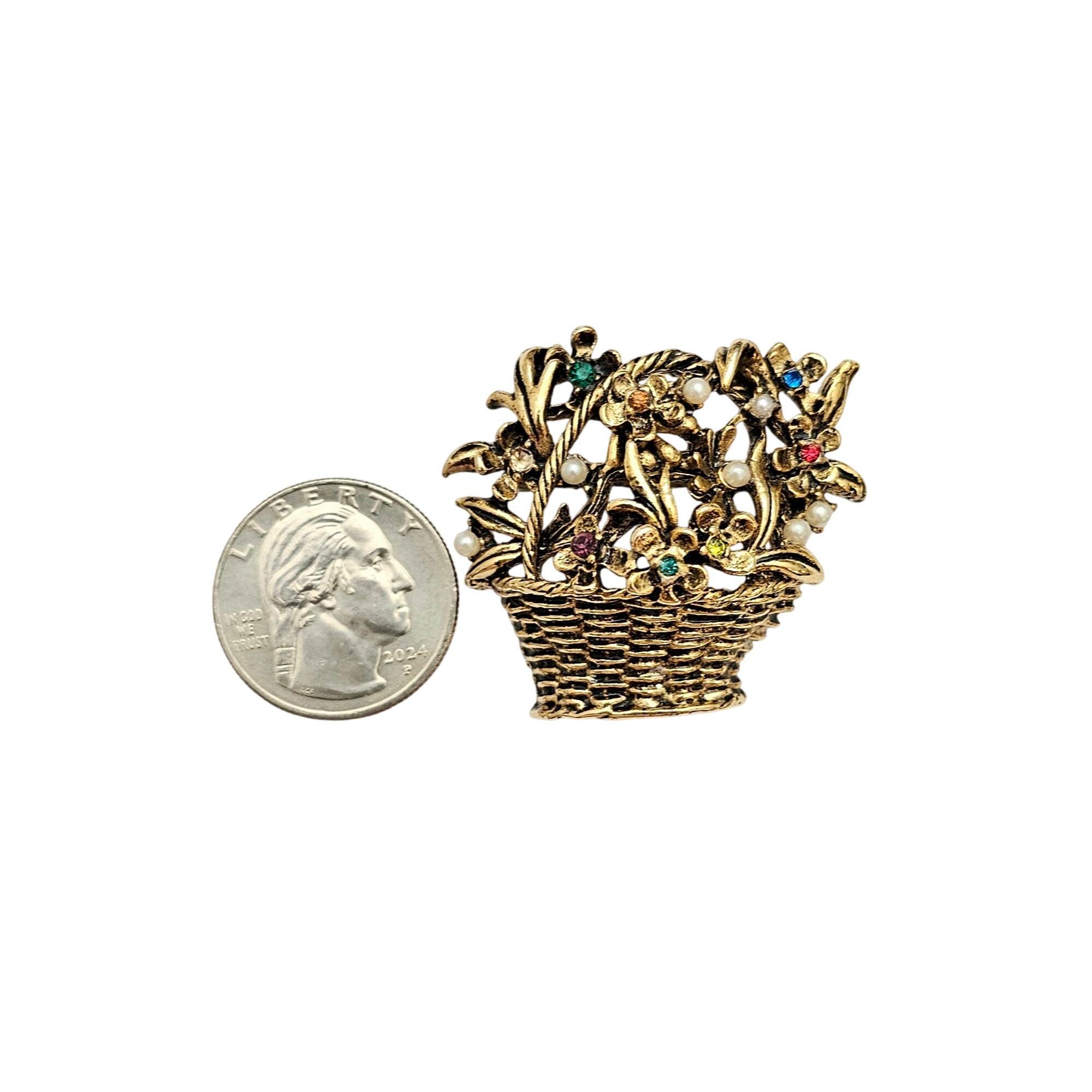 Flower Basket Brooch, Faux Pearl Rhinestone Pin C550