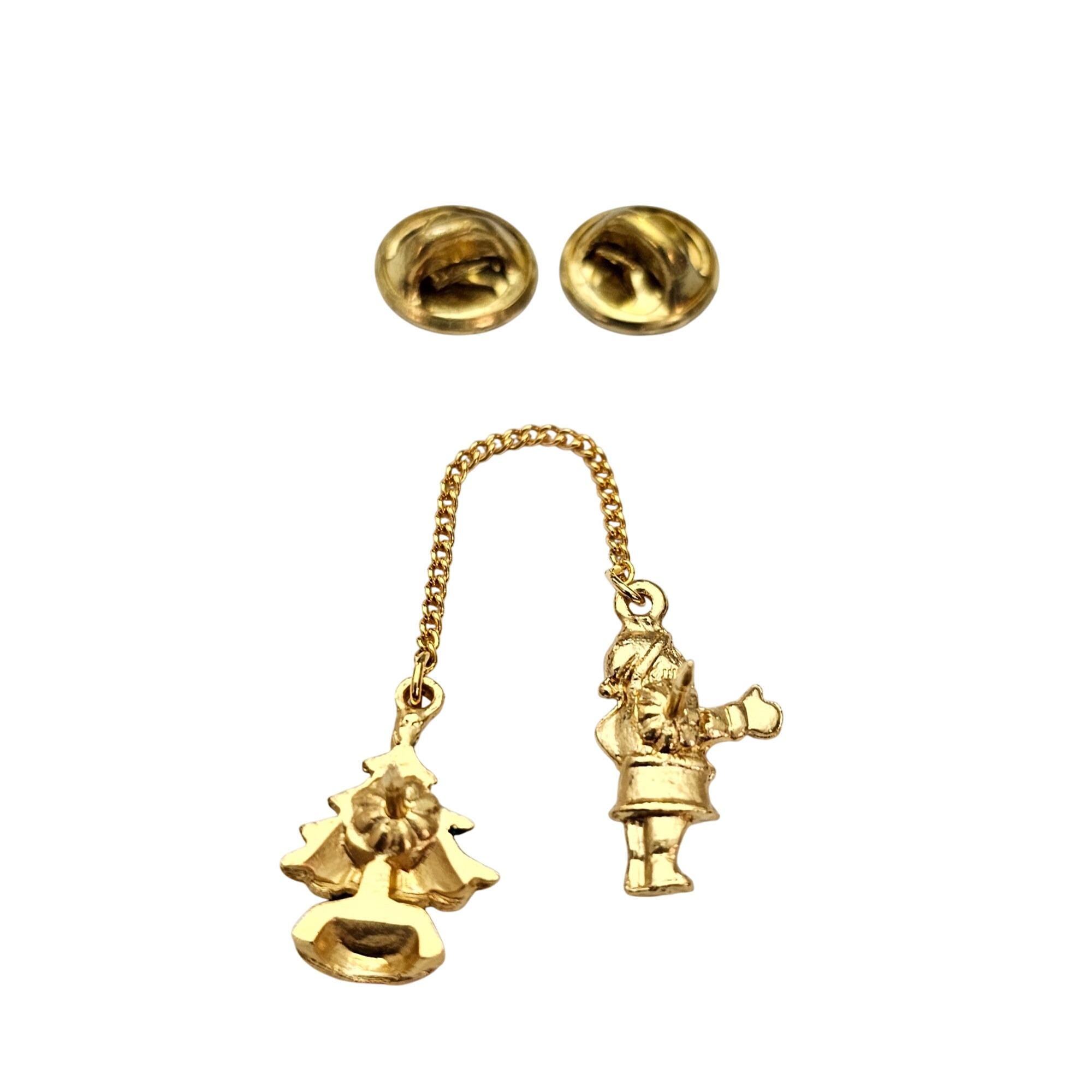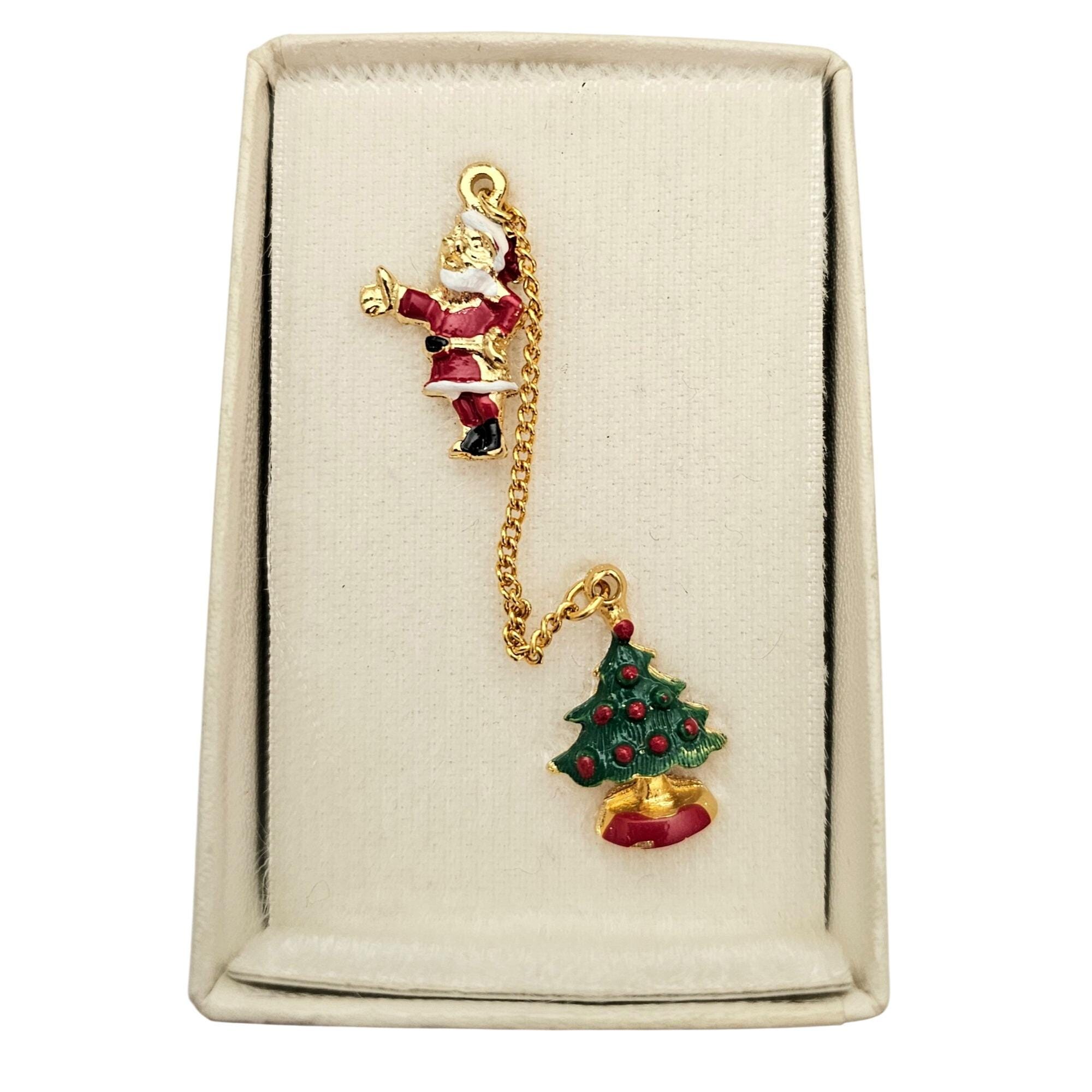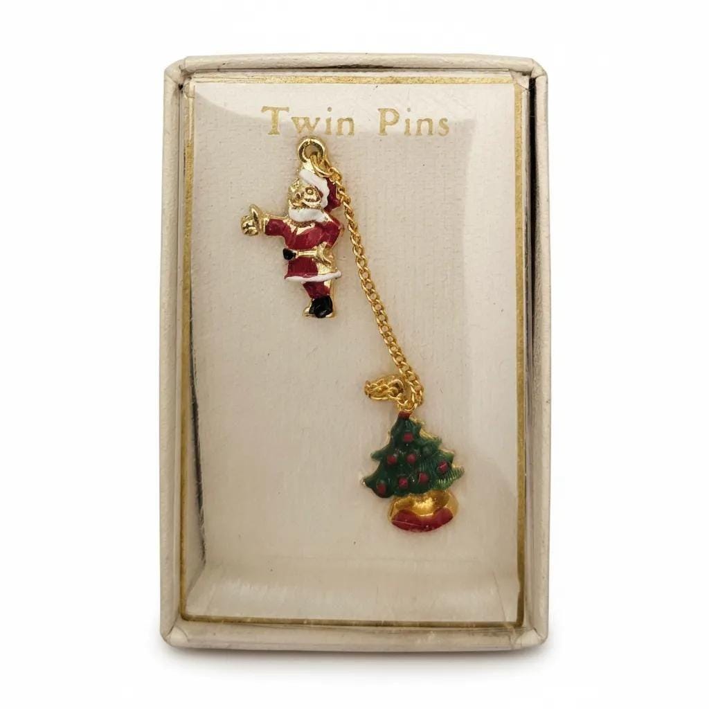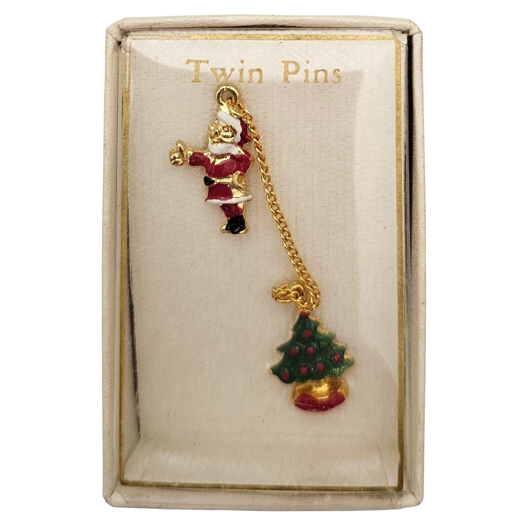 Twin Christmas Tree Santa Pins Chatelaine Style Chain New Old Stock, Vintage Set C590