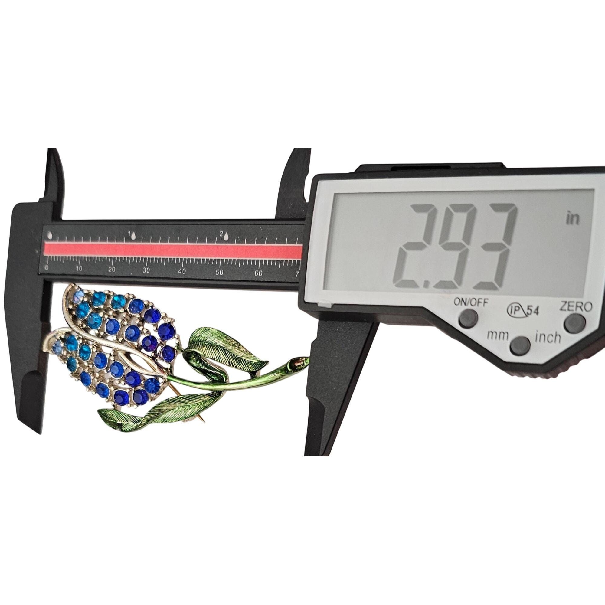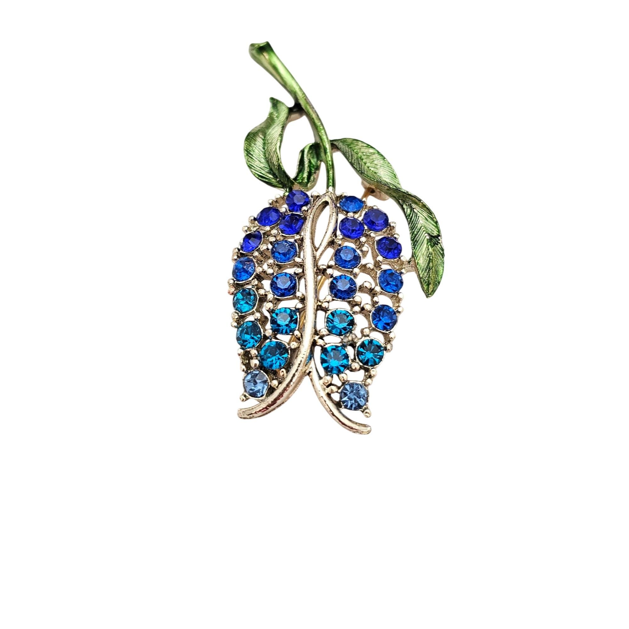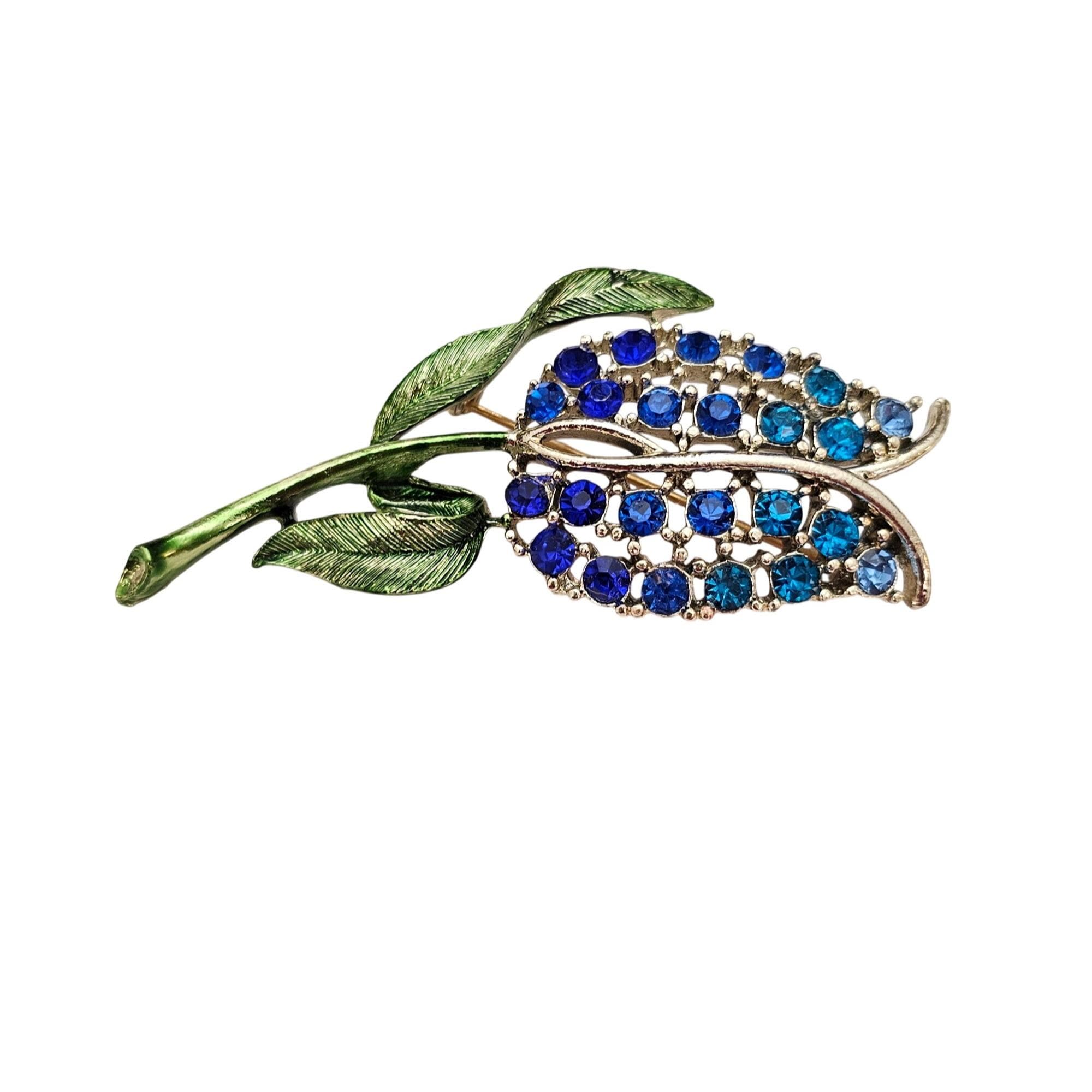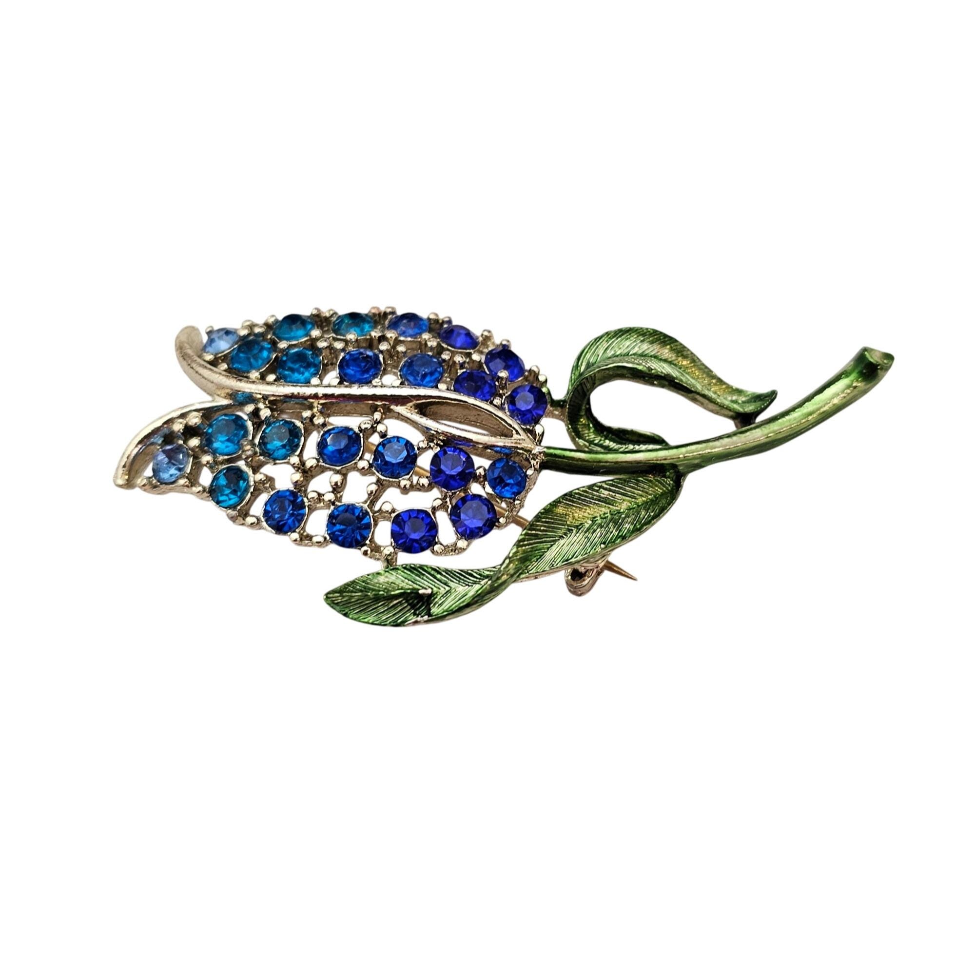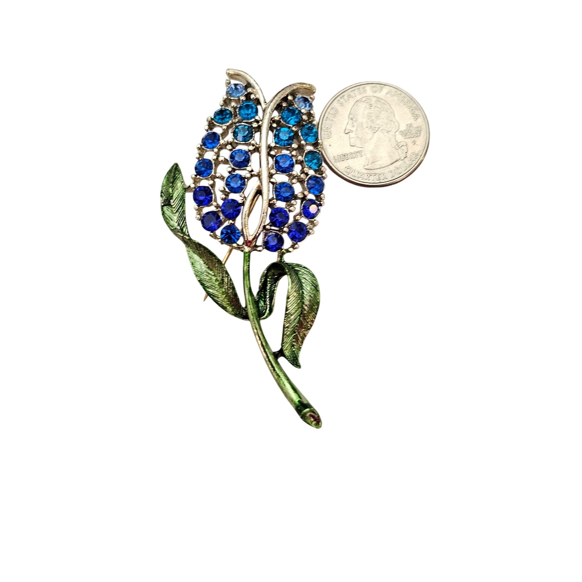 Blue Rhinestone Tulip Brooch Green Enamel Stem Pin C626